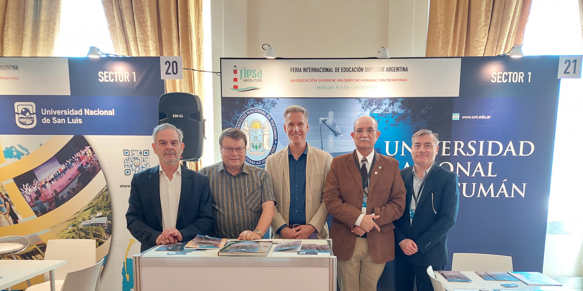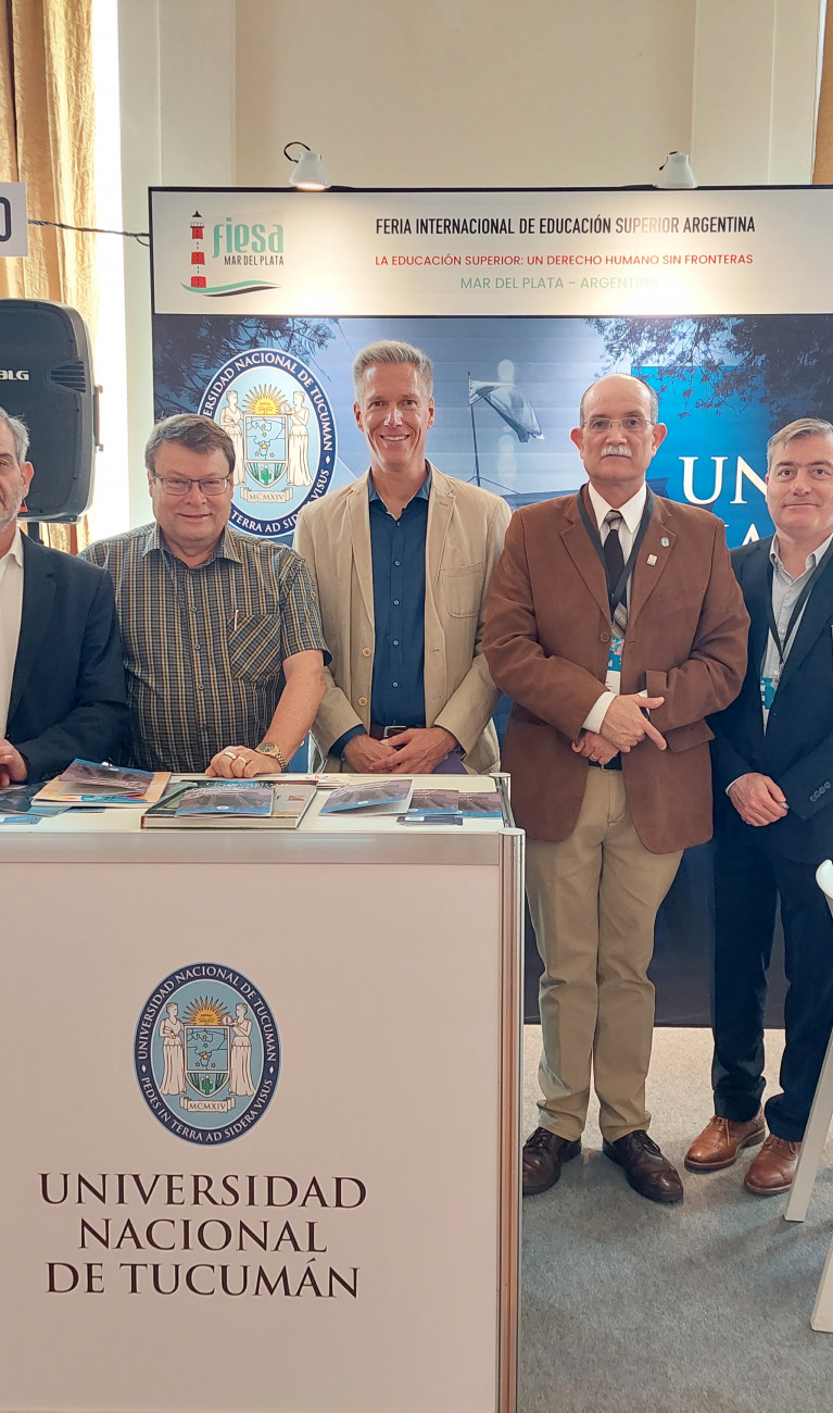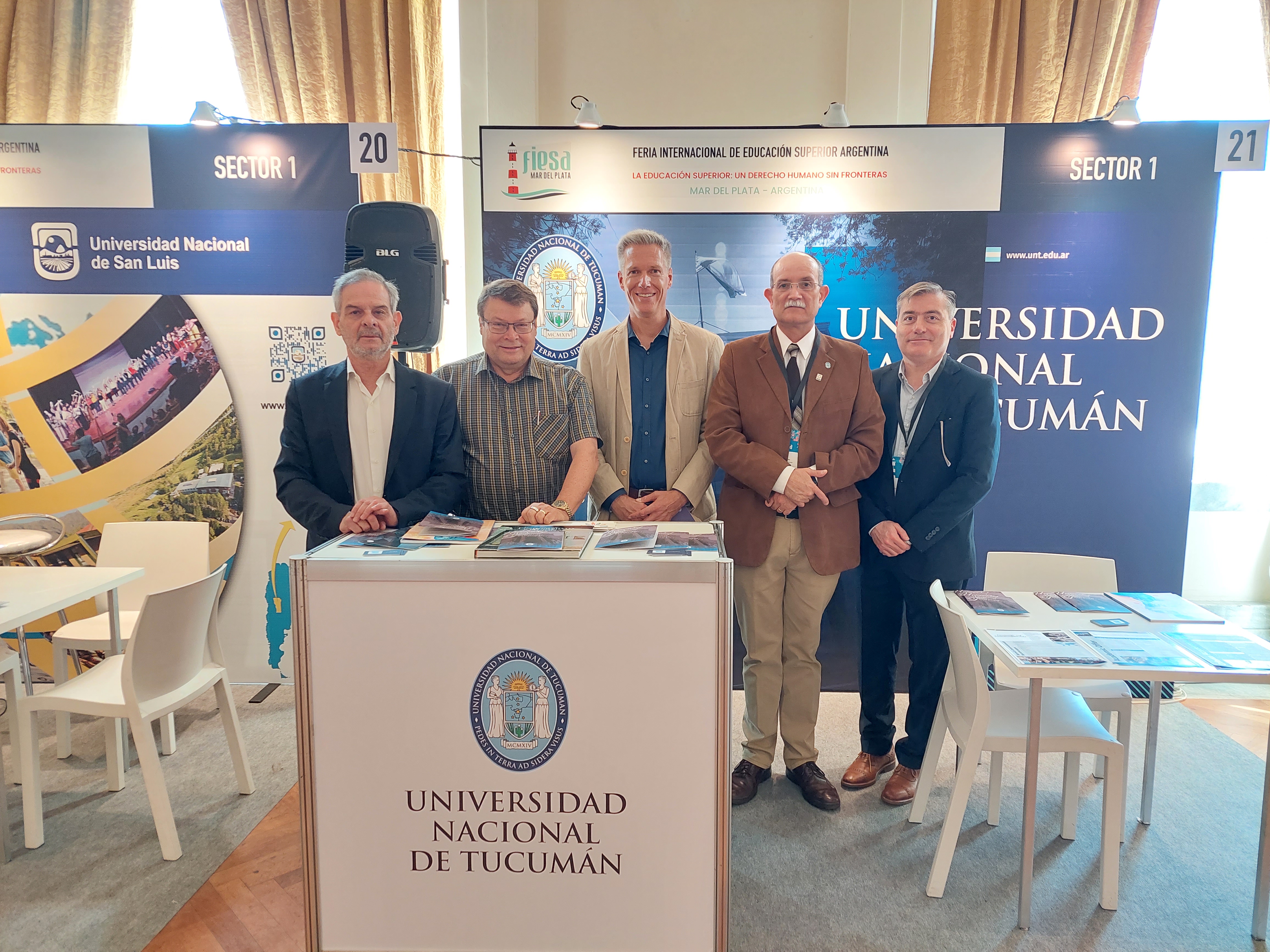 Prof. Hartmut Veigele, als Director Académico des binationalen Studiengang und der Dekan der Fakultät Bauingenieurwesen und Projektmanagement, Prof. Dr. Matthias Bahr, besuchten im Anschluss an die Feierlichkeiten auf der Bildungsmesse FIESA in Mar Del Plata den Stand der Biberacher Partnerhochschule, der Universidad Nacional de Tucuman, den Rektor, Ing. Sergio Jose Pagani, den Dekan der Ingenieursfakultät Dr. Miguel Cabrera und den Sekretär für internationale Beziehungen, Mg. Horacio Madkur.