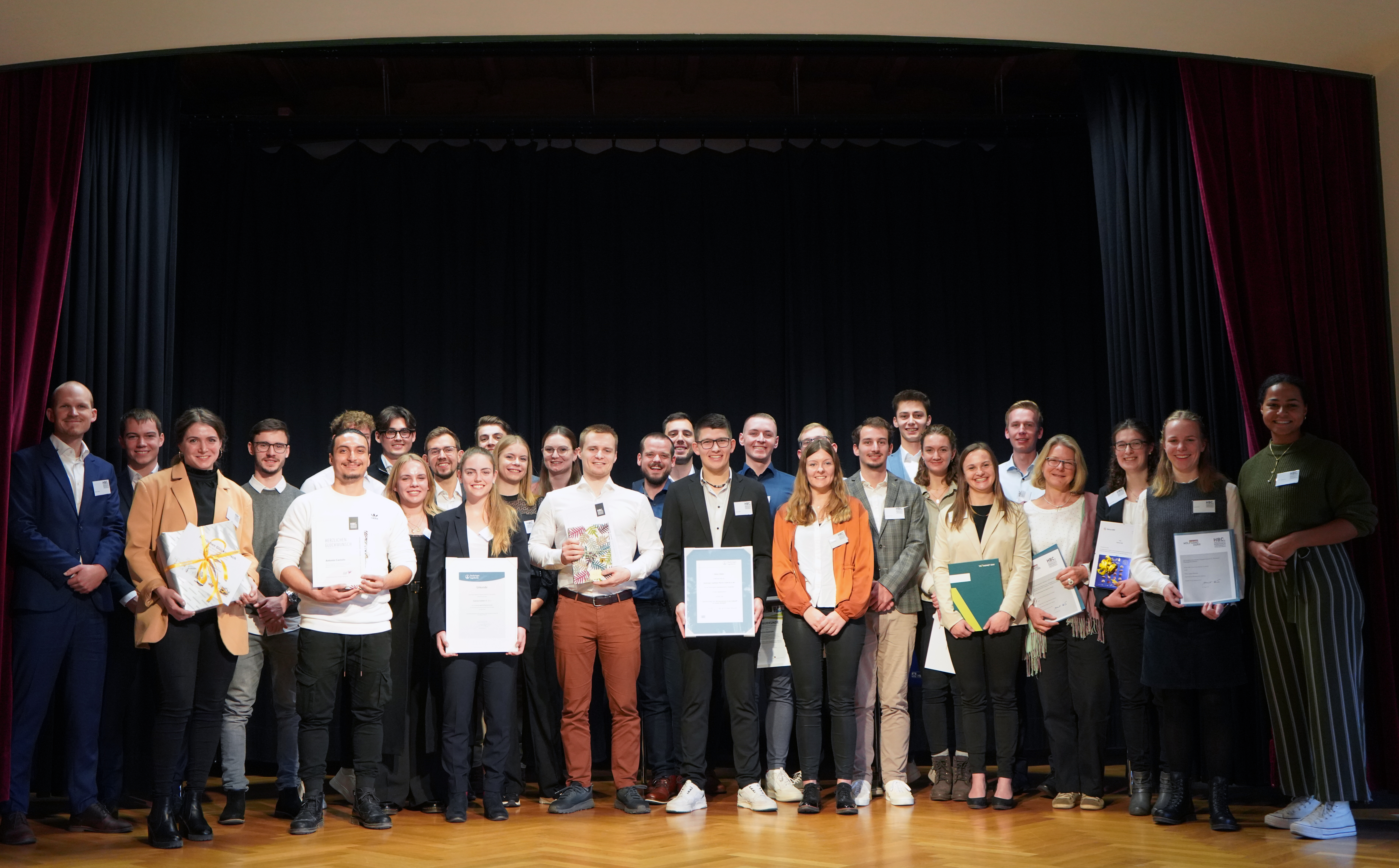 Auch die anwesenden betreuenden Professor*innen holte Jens Winter auf die Bühne der Hochschul-Aula. Denn, so der Prorektor, „hinter jedem erfolgreichen Studierenden steht ein*e engagierte*r Lehrende*r“.