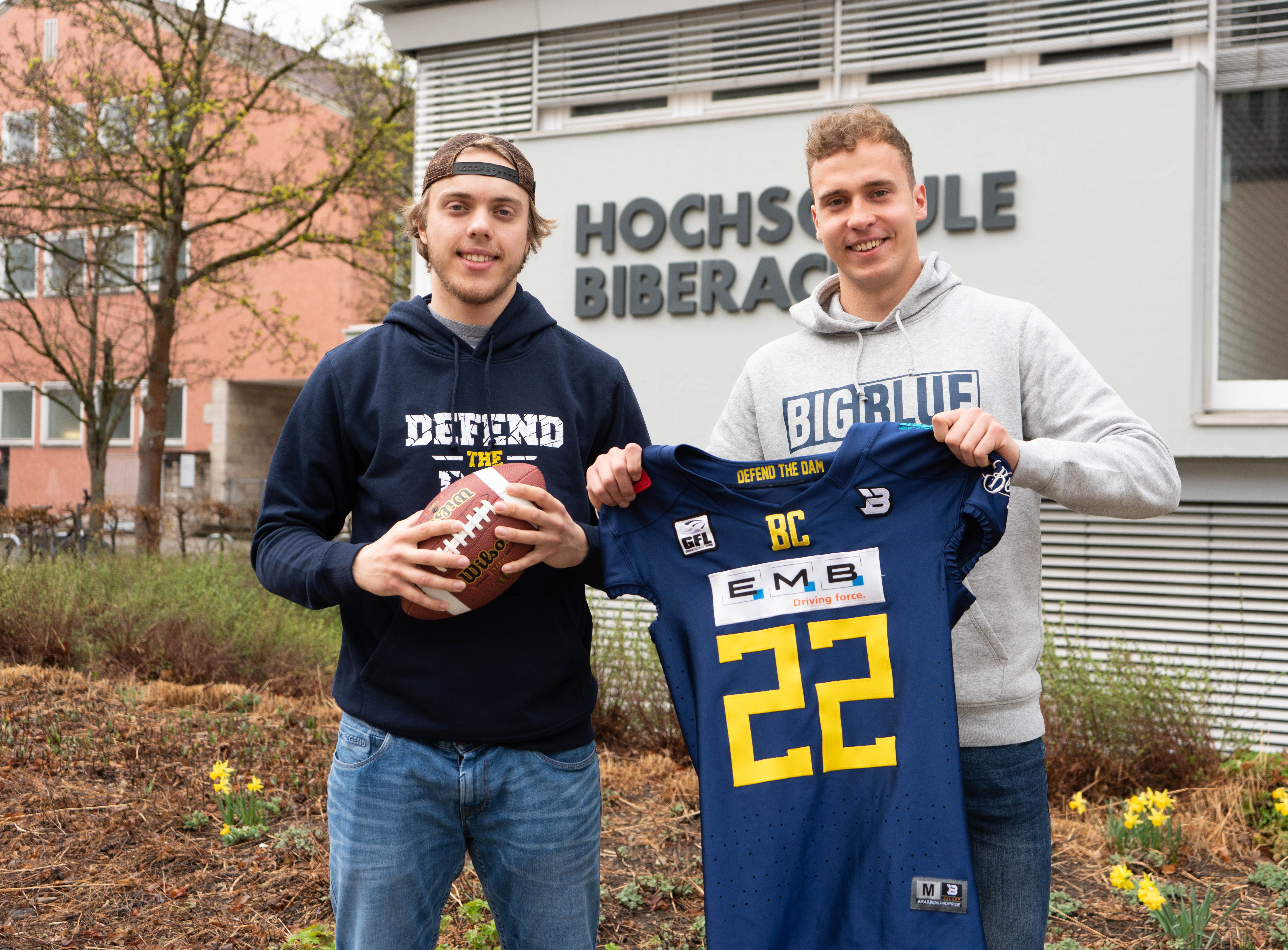 Das war auch bei Michael Diller und Timo Hetze ein Grund, weshalb sie sich für die Hochschule Biberach (HBC) entschlossen haben. Das praxisorientierte Angebot hat sie begeistert – beide haben sich für kooperative Studienmodelle entschieden. Wichtig war ihnen aber auch, dass sie während des Studiums ihr Hobby weiterführen können: Sie spielen Football und haben „bei der Wahl des Studienorts geschaut, wo es ein Team gibt.“ In Biberach sind sie schließlich fündig geworden und jetzt Teil der „Biberach Beavers“.