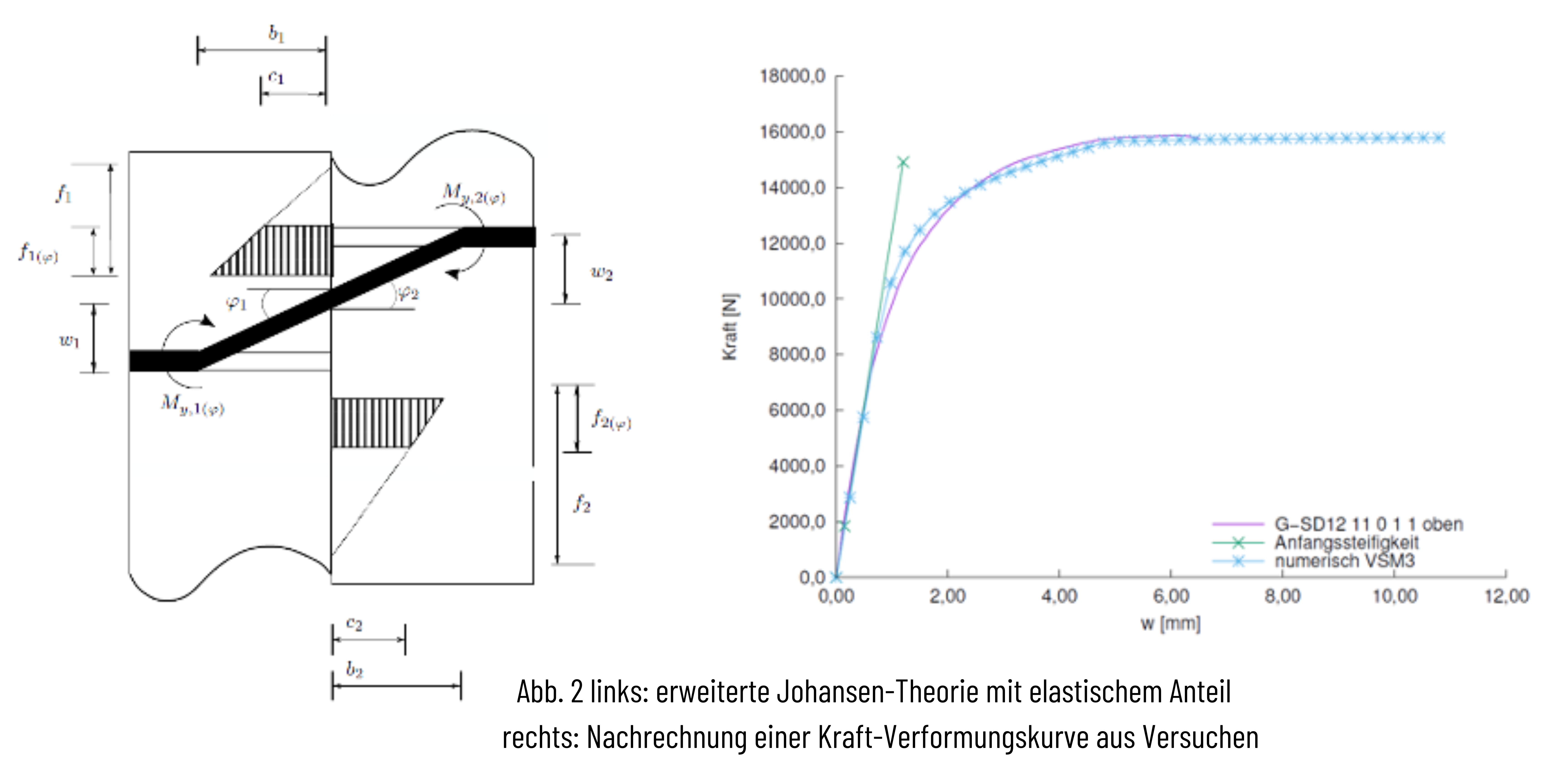 Mit den bisherigen Einflussgrößen der Johansen-Theorie aus der Literatur und den iterativ ermittelten neuen Einflussgrößen aus den Versuchen konnte das Last-Verformungsverhalten mit nur geringen Abweichungen nachgerechnet werden. Der Einfluss von verstärkten Verbindungen und der Seileffekt bei Schraubenverbindungen ist jedoch noch nicht geklärt.