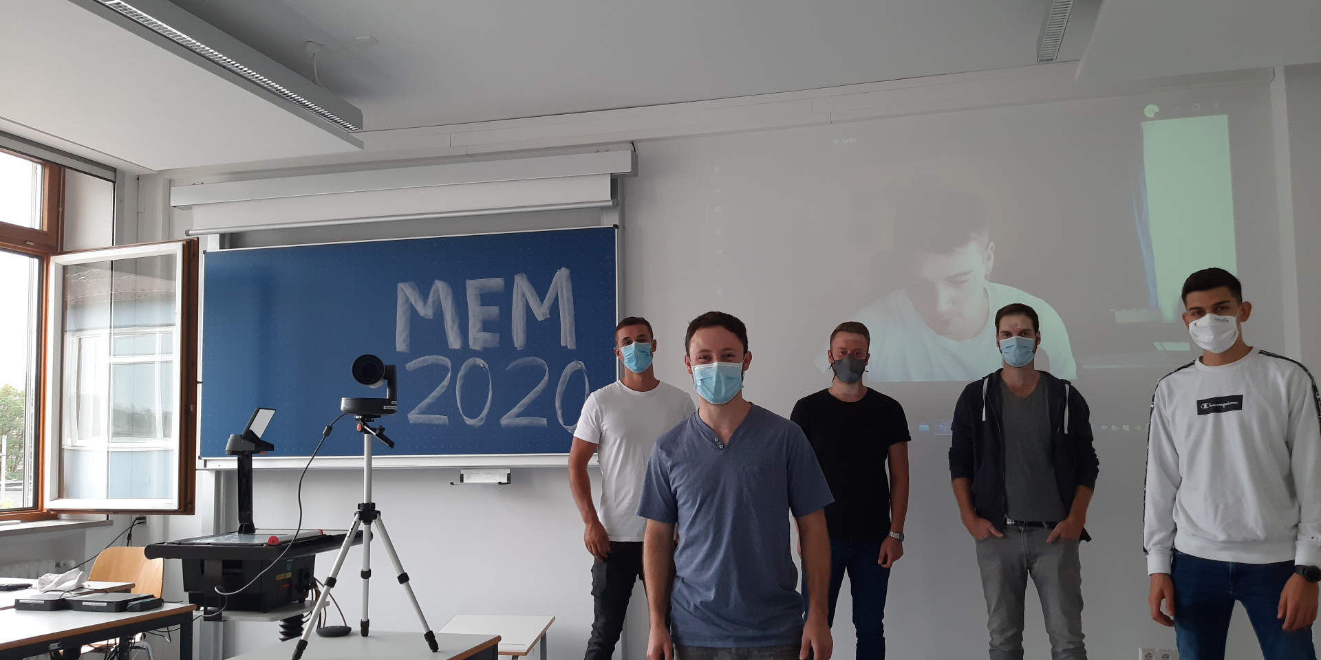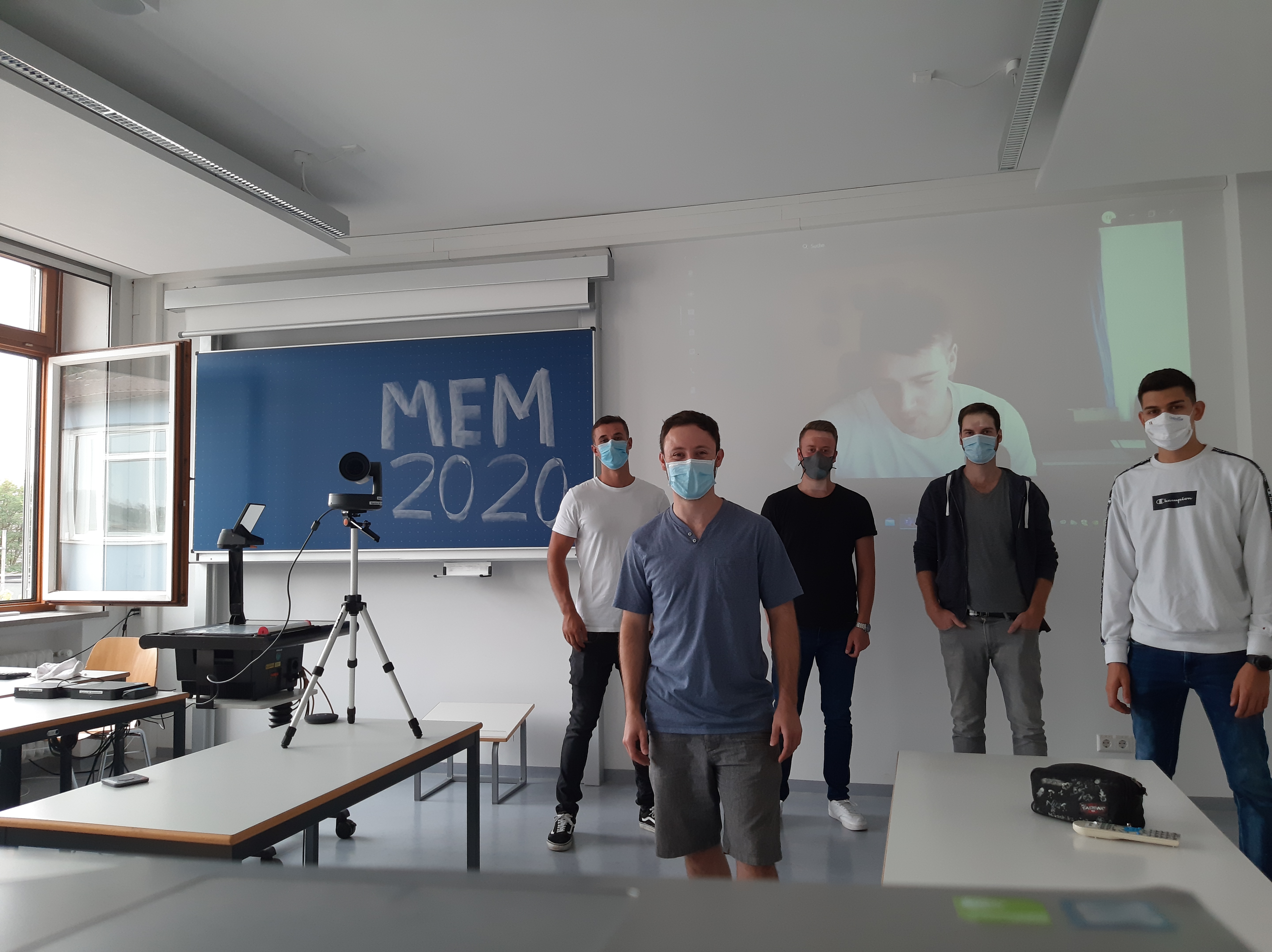 Auf dem Foto sind Studierende des Masterstudiengangs während des Präsenzunterrichts in Zeiten von Corona zu sehen. Von links: Tobias Benz (blaues T-shirt), Stefan Leichtle (weiss), Andreas Wesolowski (schwarz), Philipp Storr (grau), Diego Lento (weiss), Marcel Förderer (Leinwand), Abwesend: Luigi Paolo