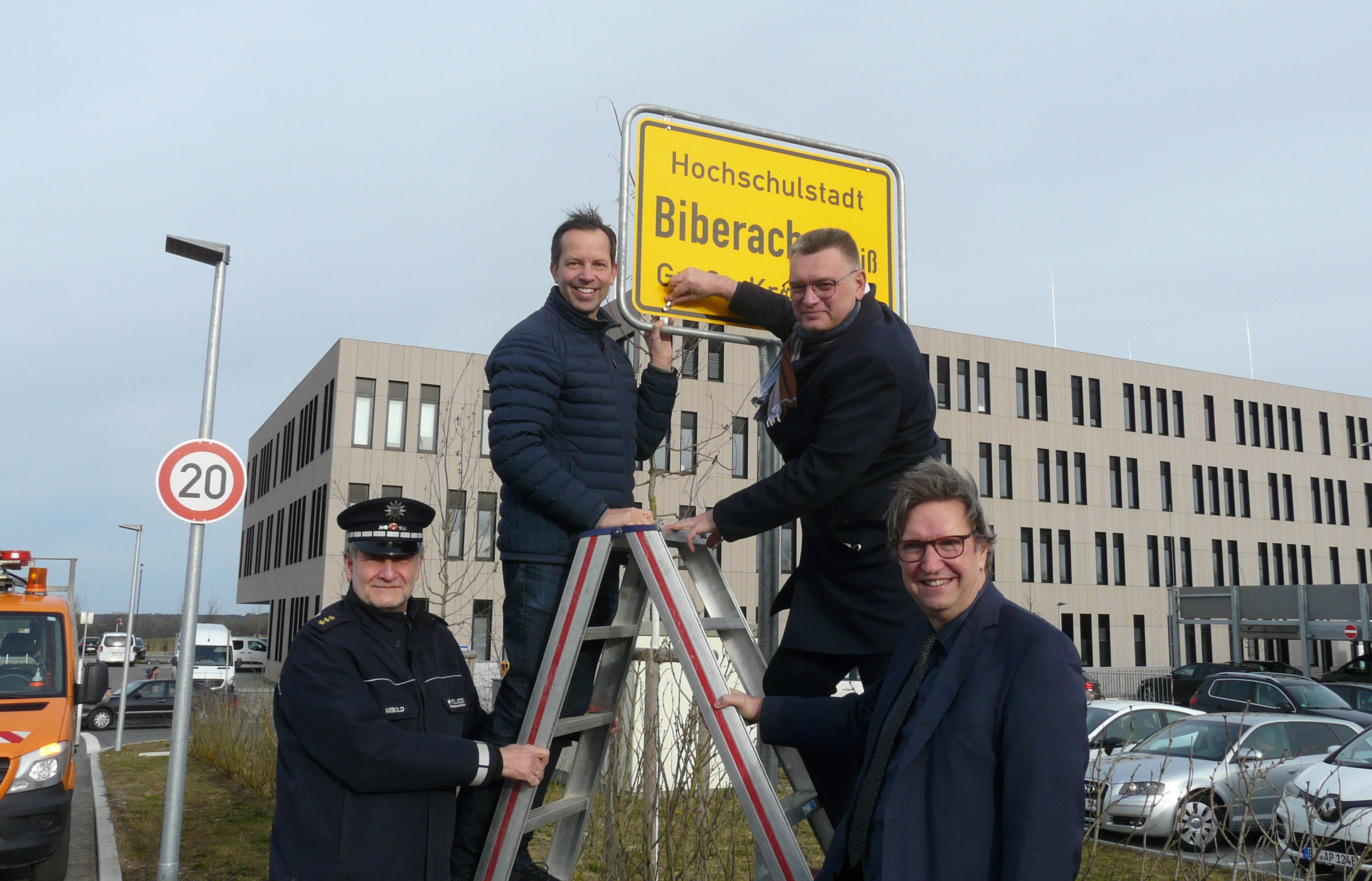 Es habe doch einige Zeit gedauert, bis es so weit war, sagte Oberbürgermeister Norbert Zeidler bei einem Ortstermin. Bereits 2013 habe man einen ersten Versuch gestartet, aber erst mit einer Änderung in der Gemeindeordnung sei Bewegung in die Geschichte gekommen. Die 33 benötigten Schilder hätten 8000 Euro gekostet. Auch der CDU-Landtagsabgeordnete Thomas Dörflinger, der sich immer wieder dafür stark gemacht hatte, bestätigte, es habe mehrere Anläufe gebraucht, bis eine positive Entscheidung fiel. Und diese Entscheidung sei durchaus wichtig für das Selbstverständnis der Stadt. André Bleicher, der Rektor der Hochschule Biberach, sagte, Biberach sei ja tatsächlich seit gut 50 Jahren Hochschulstadt; jetzt sei nachgeholt worden, was hier schon lange praktiziert werde. Der Name Hochschulstadt auf dem Ortsschild habe aber auch eine symbolische Kraft, das dürfe man nicht unterschätzen. Insofern sei es ein großer Tag für die Stadt und die beiden Hochschulen, die HBC und die Polizeihochschule.