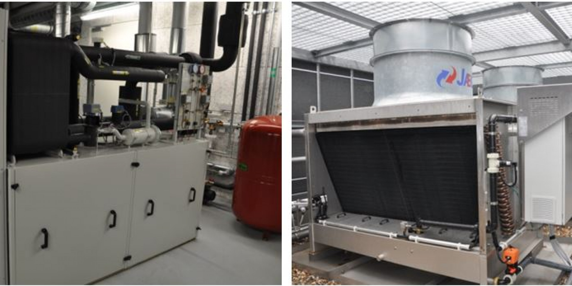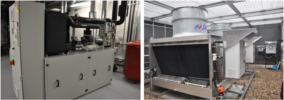 Abb: Combitherm Kältemaschine im Z3 (links); Jaeggi Hybridrückkühler im Z3 (rechts)