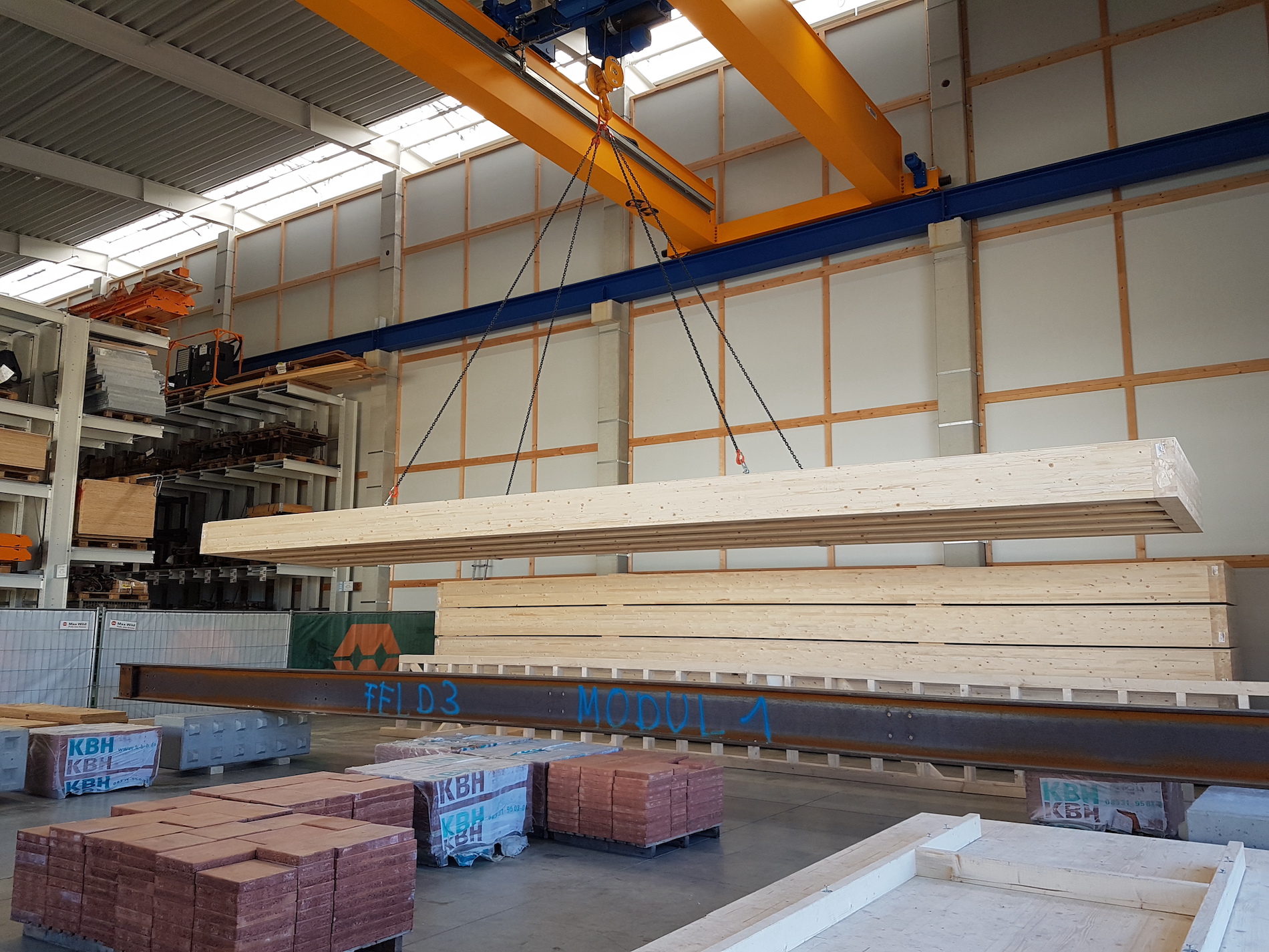 schwingungsreduzierte Holzdeckensysteme zu entwickeln, um künftig öffentliche Bauwerke in Holzbauweise sicher umsetzen zu können. Für den Prüfstand wurde eine Lagerhalle der Max Wild GmbH angemietet. Ab Mitte November 2021 haben die beiden Mitarbeiter Johannes Ruf und Valentin Knöpfle den Prüfstand in Berkheim aufgebaut.