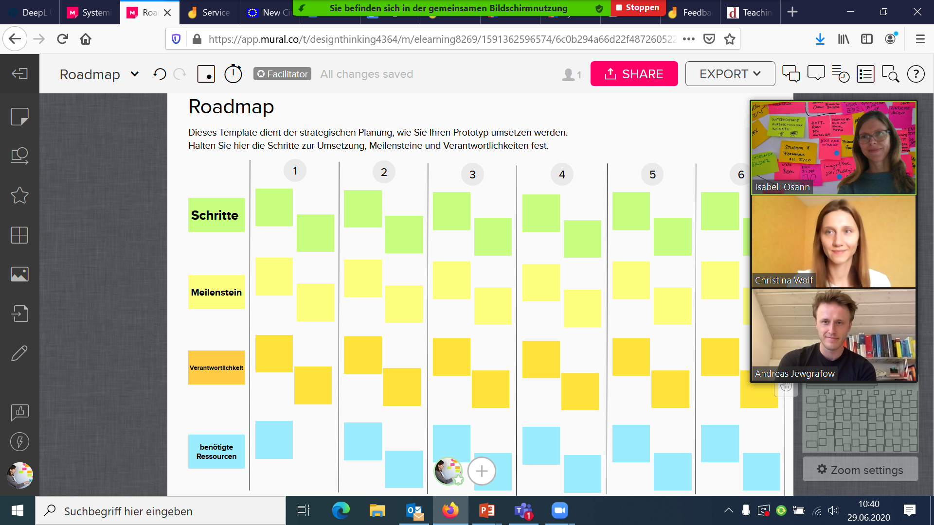 Durch die agile und kreative Form der Zusammenarbeit in den Design Thinking-Veranstaltungen eignen sich die Kursteilnehmer im Laufe des Prozesses verschiedene zukunftsrelevante Fähigkeiten, u. a. in den Bereichen Kreativität, Unternehmerisches Handeln, Eigeninitiative, Anpassungsfähigkeit und Durchhaltevermögen, an. Aufgrund der COVID-19-Pandemie fanden die Kurse nicht als Präsenzveranstaltungen im Design-Thinking-Labor statt, sondern wurden kurzerhand durch Videokonferenzen mithilfe der Kollaborationssoftware Microsoft Teams (MS-Teams) ersetzt. Sämtliche Vorlesungen, die Coachings zur Klärung von Fragen und die Zusammenarbeit in den einzelnen Teams liefen somit ausschließlich über diese Plattform. Anstelle einer Visualisierung der gesammelten Ideen an physischen Whiteboards trat „MURAL“ - ein zusätzliches Online-Kollaborationstool für die virtuelle Teamarbeit und Ergebnisdokumentation.