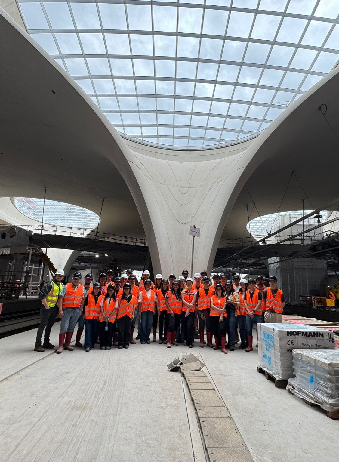 So stand am Vormittag die Besichtigung des neuen Fernbahnhofs am Flughafen Stuttgart im Mittelpunkt. Hier erhielten die Studierenden detaillierte technische Informationen über den Bau der Tunnelröhren, die Integration der technischen Gebäudeausrüstung (TGA) und die Sicherheitskonzepte. Die neue Anbindung des Bahnhofs an die Schnellfahrstrecke Stuttgart–Wendlingen sowie der geplante Pfaffensteigtunnel zur Verbindung mit der Gäubahn wurden ebenfalls thematisiert. Die Studierenden zeigten sich beeindruckt von der neuen, größtenteils unterirdischen Anbindung, die sich über rund drei Kilometer erstreckt und den künftigen Fernbahnhof auf beiden Seiten an die Schnellfahrstrecke Stuttgart–Wendlingen anbindet. Dabei verläuft die Trasse in zwei eingleisigen, gekrümmten Tunnelröhren in etwa 30 Metern Tiefe.