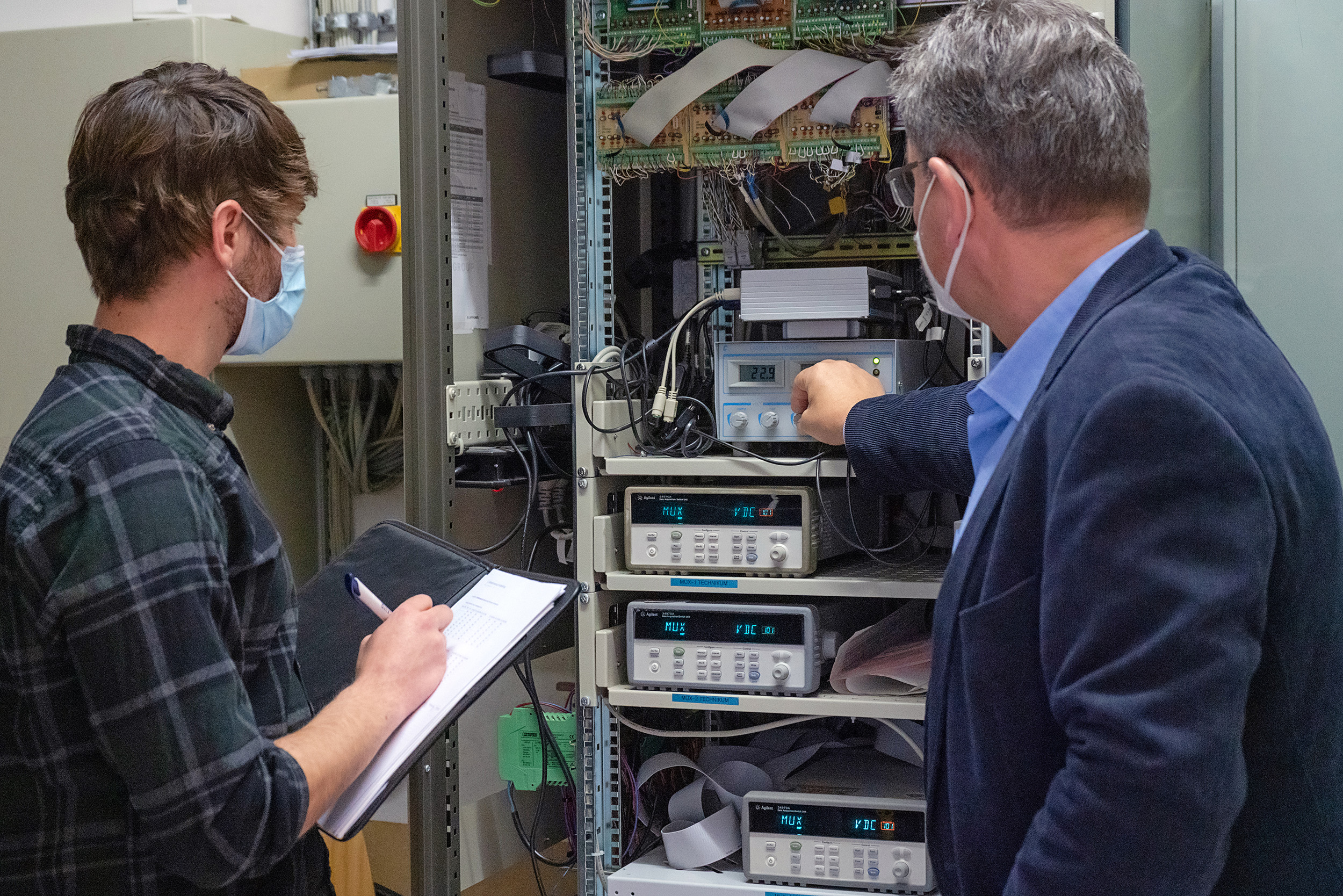 Bühnenbild: Professor Martin Becker (rechts) und sein wissenschaftlicher Mitarbeiter Simon Wagner vom Institut für Gebäude- und Energiesysteme an der Hochschule Biberach. Foto: HBC