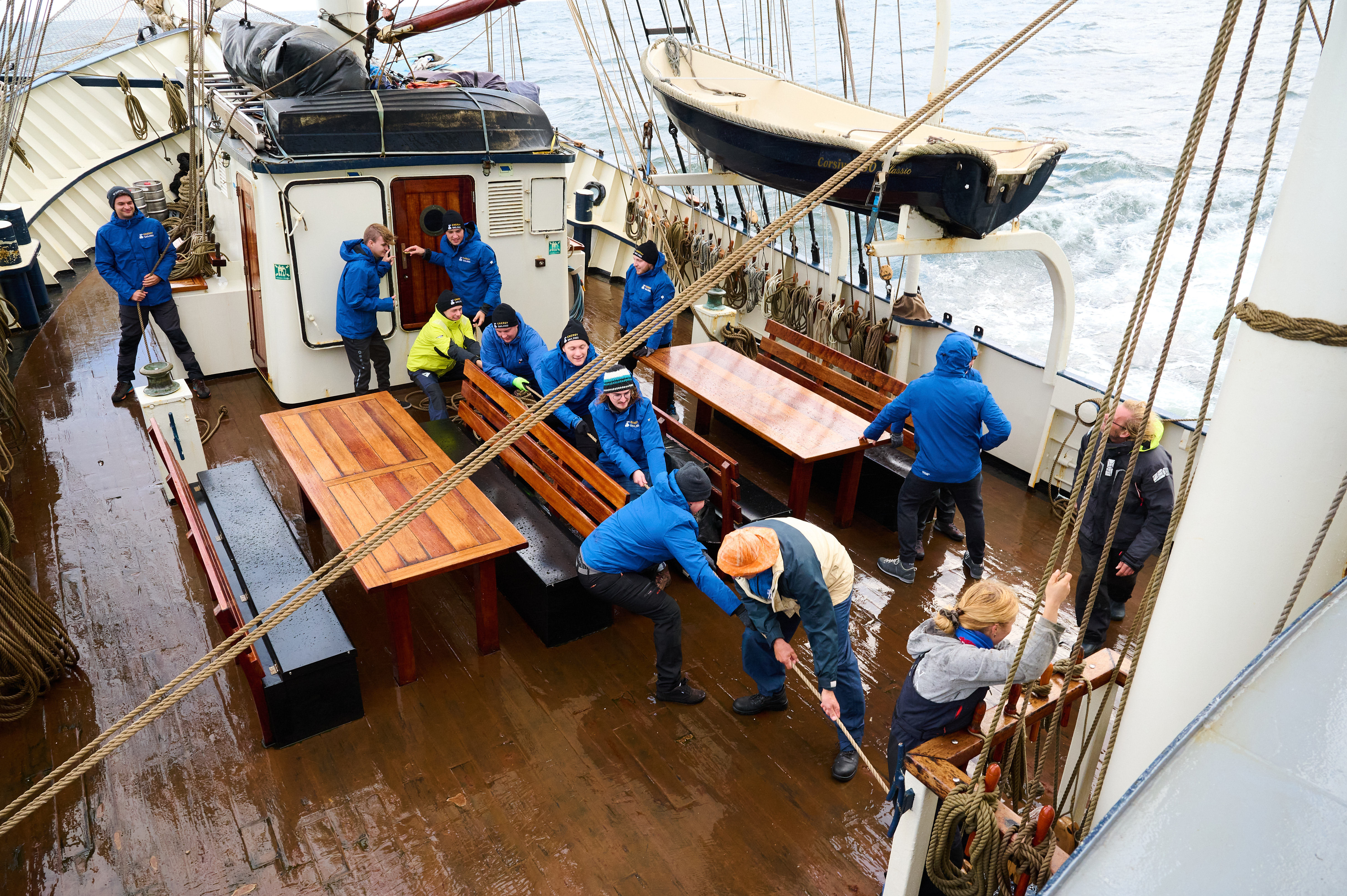 An Bord fassen alle Hochschulmitglieder – an der Exkursion nehmen Studierende, Professoren und Mitarbeitende teil – mit an und unterstützen die Thalassa-Crew nach Kräften, an Decke ebenso wie in der Kombüse. Zur Besatzung gehören Kapitän Maarten, Vollmatrose Alex, Vollmatrosin Noor und der Koch Bas, alle anderen sind einfache Leichtmatros*innen – „Alter, Geschlecht oder Titel machen hier keinen Unterschied“, sagt Peter Knoll.