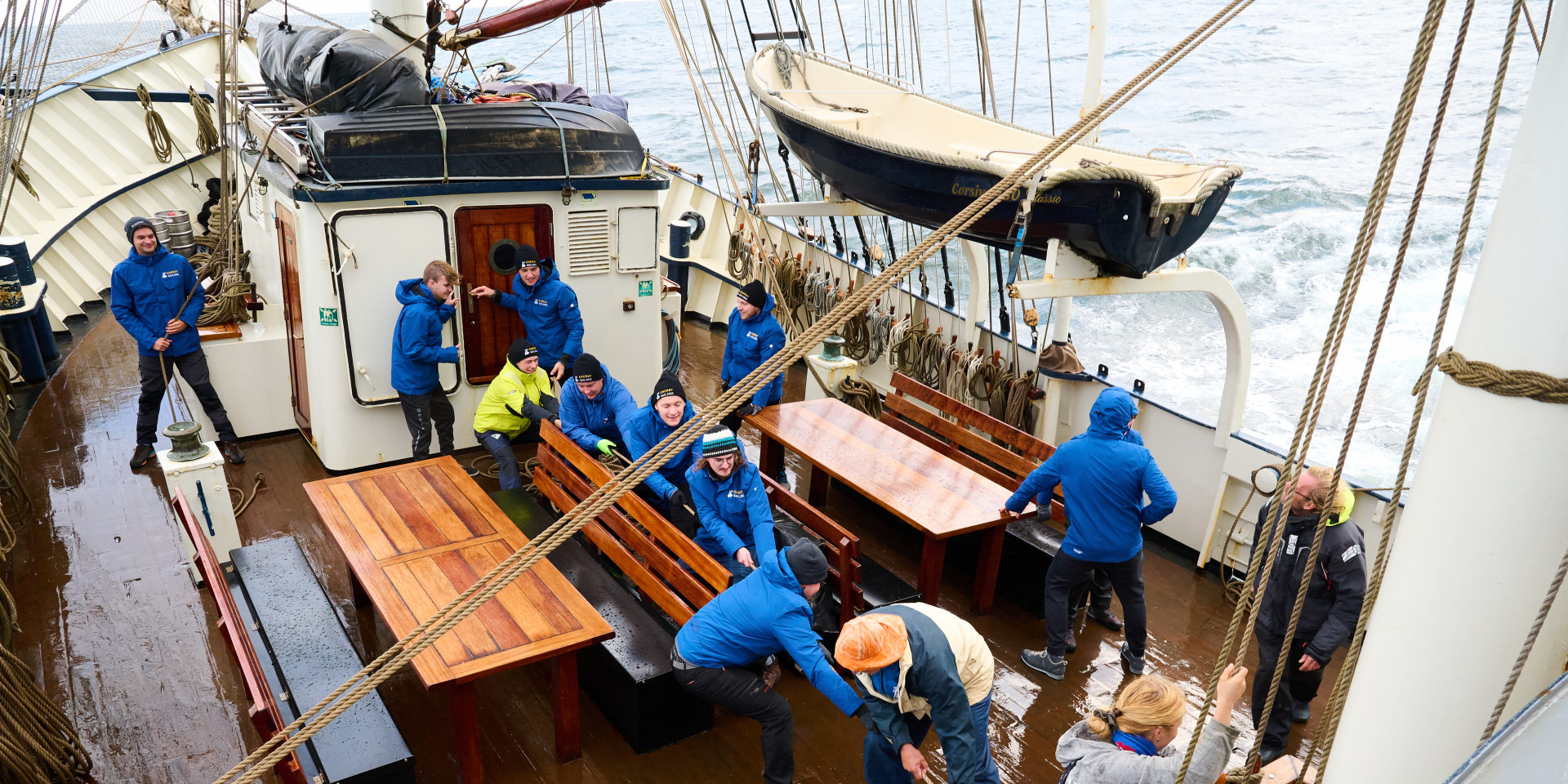 Der niederländische Thalassa-Eigentümer Jacob Jan Dam hat mit seinem Schiff schon an der „Race of Classic“ teilgenommen, Urlaubern und anderen Gruppen bietet er Reisen mit verschiedenen Zielen auf der Ost- oder Nordsee an. Mit den 30 Biberacher Exkursionsteilnehmer*innen wird sein Team einen zehntägigen Trip unternehmen und über Rügen nach Bornholm, Ystad, Kopenhagen, Wismar und zurück nach Rostock segeln. Die ganztägigen Segeletappen, wird Student Benno Schedlbauer nach der Exkursion sagen, zählen zu seinem „persönlichen Highlight“. Der 23-jährige Masterstudent tritt die Reise ganz ohne Segelerfahrung an – und genießt das besondere Reiseformat in vollen Zügen, begeistert beteiligt er sich an den Arbeiten an Deck: Knoten üben, Anker lichten, Segel hissen und nach ein paar Tagen hoch hinaus in die Takelage klettern.