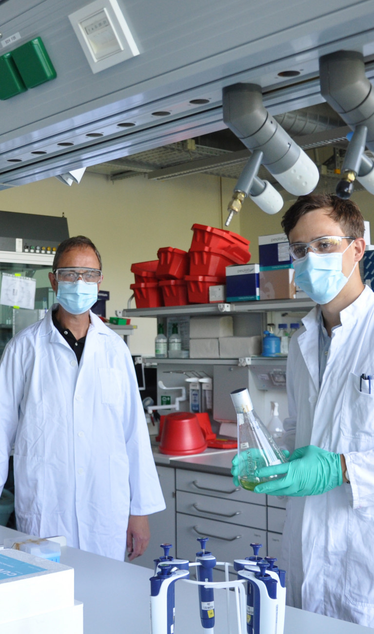 Bildinformation: Professor Hans Kiefer im Labor mit dem Doktoranden Christoph Keysberg. Aufgrund von Corona tragen die Wissenschaftler Mundschutz - so werden auch die Studierenden im kommenden Wintersemester, das als Hybrid-Semester geplant ist - ihre Labprpraktika an der Hochschule absolvieren. Foto: HBC