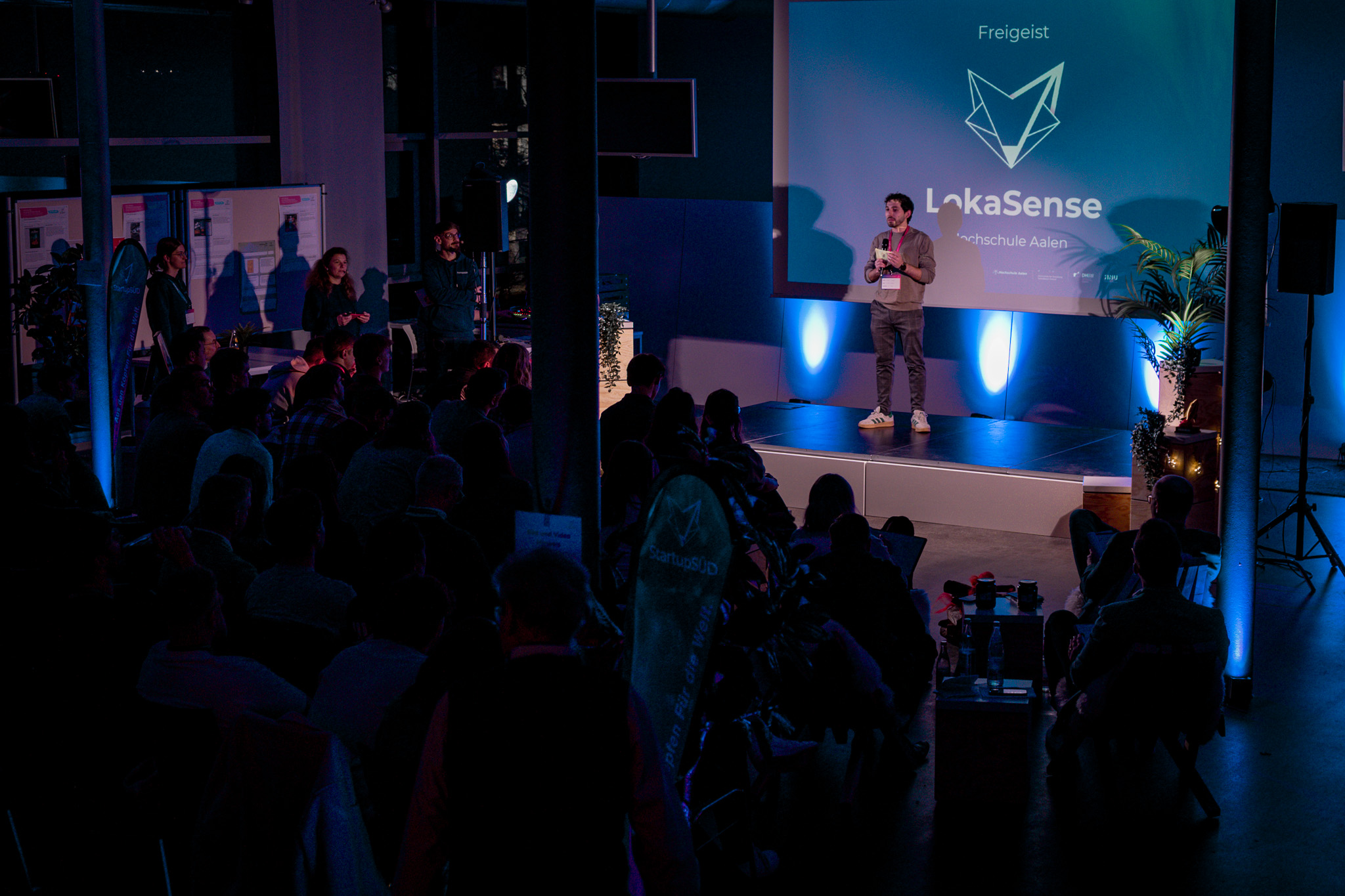 Insgesamt präsentierten 18 Teams der drei Hochschulen ihre Geschäftsideen in den Kategorien „Freigeist“, „Lokalmatador“ und „Renditerakete“. Nicole Hauser (Gründungscampus Aalen), Denis Nakov (Entrepreneurs Campus Ulm) und Marcel Moser (Gründerinitiative Biberach) führten gemeinsam durch den Abend—ein starkes Zeichen für die gute Zusammenarbeit der Hochschulen im StartupSÜD-Verbund.