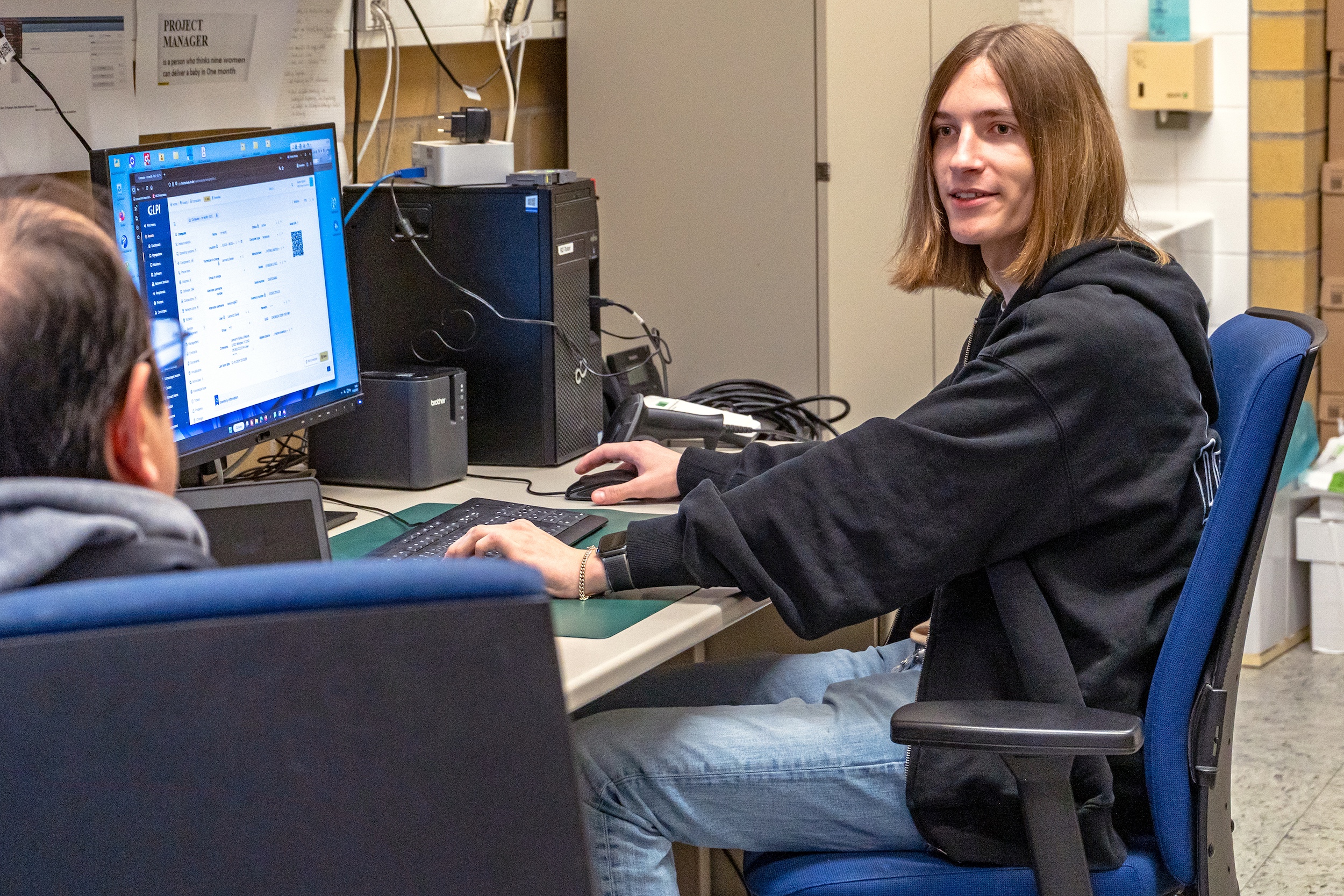 Aktuell befasst sich Jari Zeschmann mit einer Inventarisierungssoftware. Hierin sollen alle Geräte, die beschafft werden, erfasst und Abteilungen bzw. Personen zugeordnet werden. Auch Informationen wie der Raum, in dem das Gerät steht, oder die Garantielaufzeit sollen darin abgebildet werden – und jederzeit abrufbar sein. Auch bei der Einführung des sogenannten Signators – also einem Generator für die HBC-Signatur – hat er mitgeholfen. Zum Einstieg in seine neue Rolle hat er bei allen Kolleg*innen des Rechenzentrums über die Schulter geschaut, um einen Einblick in deren Arbeitsgebiete zu erhalten.