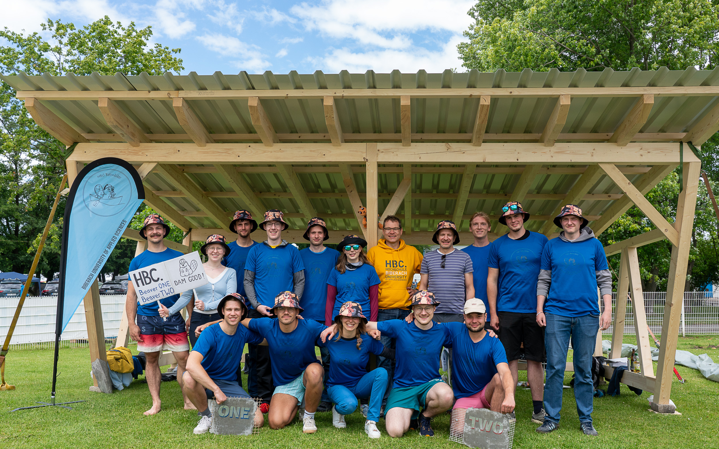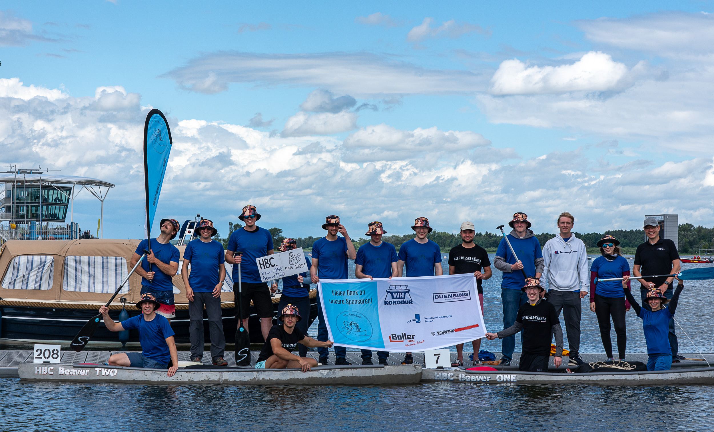 Hier hat sich das interdisziplinär aufgestellte Team etwas ganz Besonderes überlegt: Statt Pavillons zu verwenden, haben die Studierenden selbst ein Carport aus Holz gebaut und dieses unter den staunenden Blicken der anderen Teilnehmer*innen errichtet und sogar mit einem Richtspruch eingeweiht. Für große Augen und neidische Blicke sorgten auch die selbst aus Stahl angefertigten Transportkonstruktionen für die Betonkanus. Schließlich wiegt jeweils ein Kanu über 226 Kilogramm. Statt diese von A nach B tragen zu müssen, konnten die HBC.Betonbiber ihre Boote also ganz „gemütlich“ über die Wiesen und ins Wasser rollen.