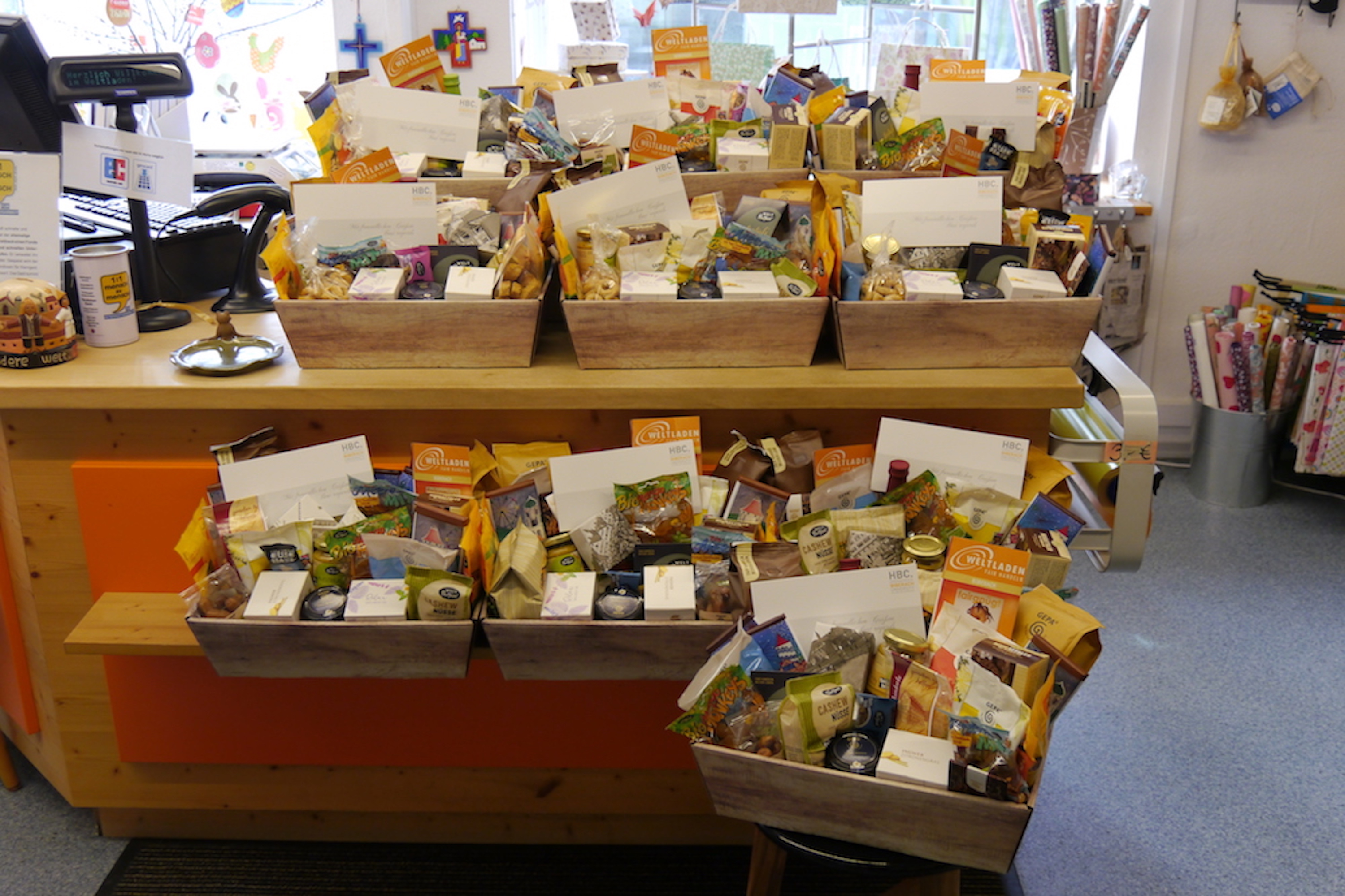 Foto: Silvia Sonntag vom Biberacher Weltladen präsentiert einen Teil der Geschenkkörbe, die bei einer Spendenaktion, initiiert durch die Hochschule Biberach, gestiftet wurden /Foto: HBC/privat