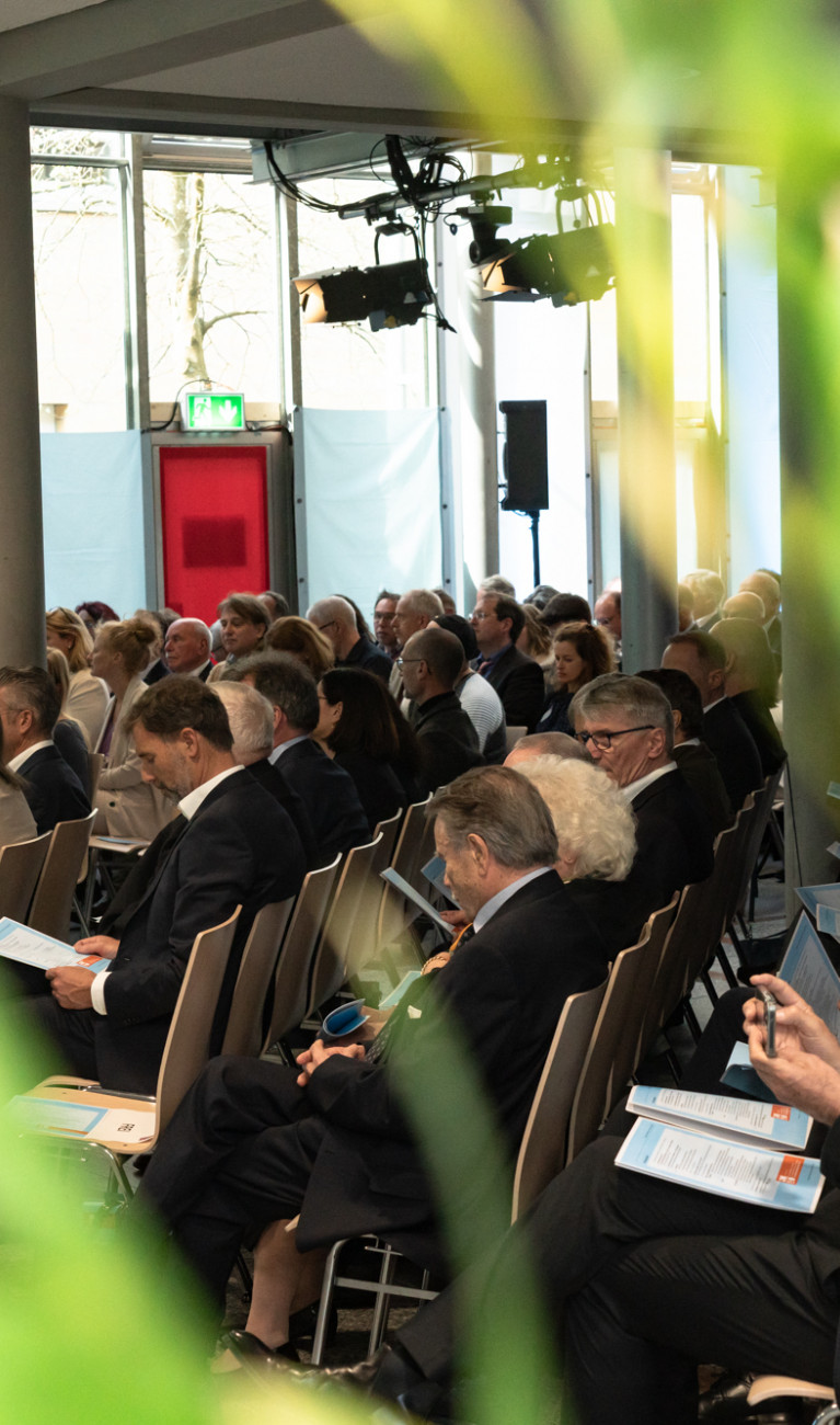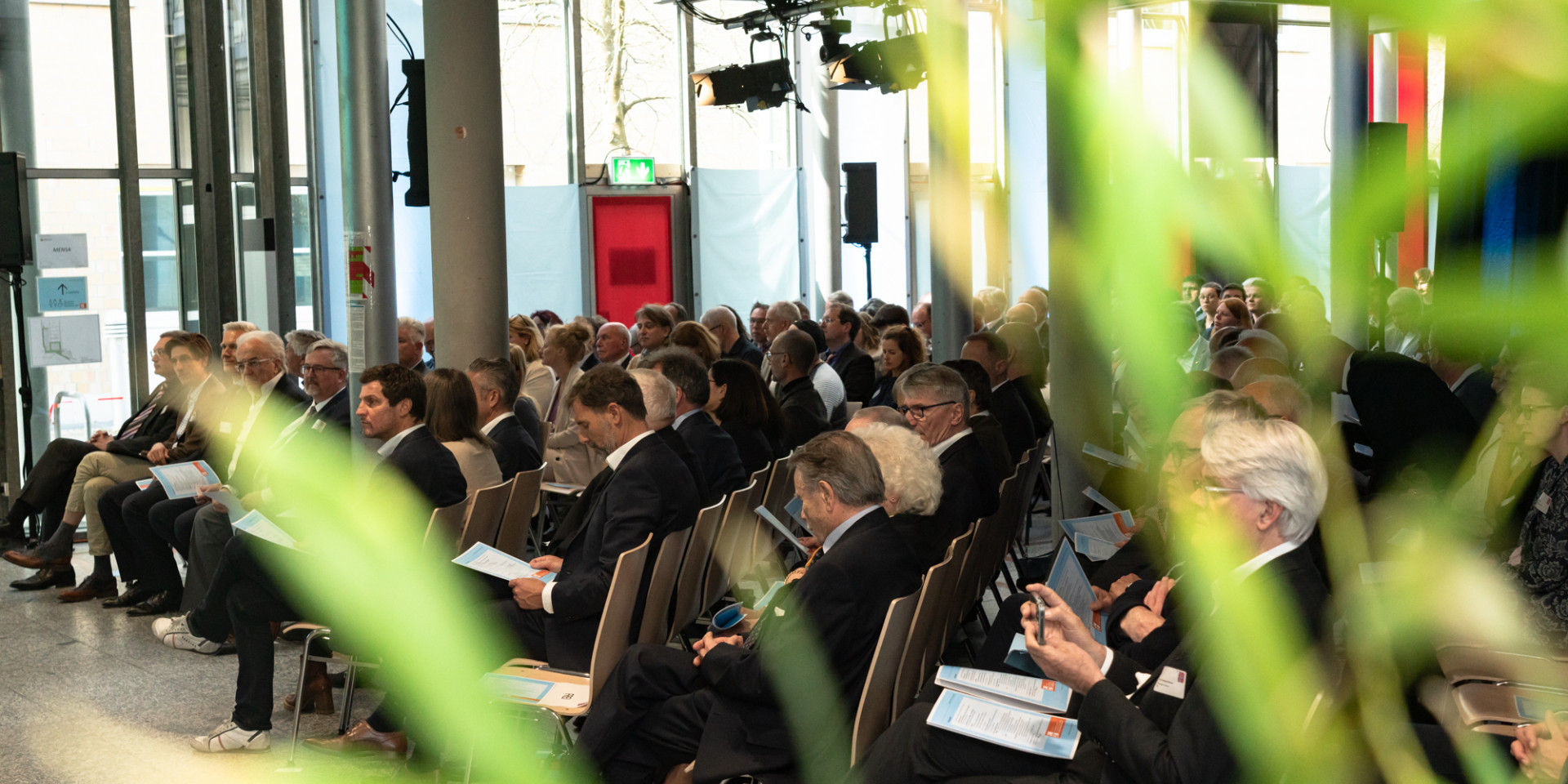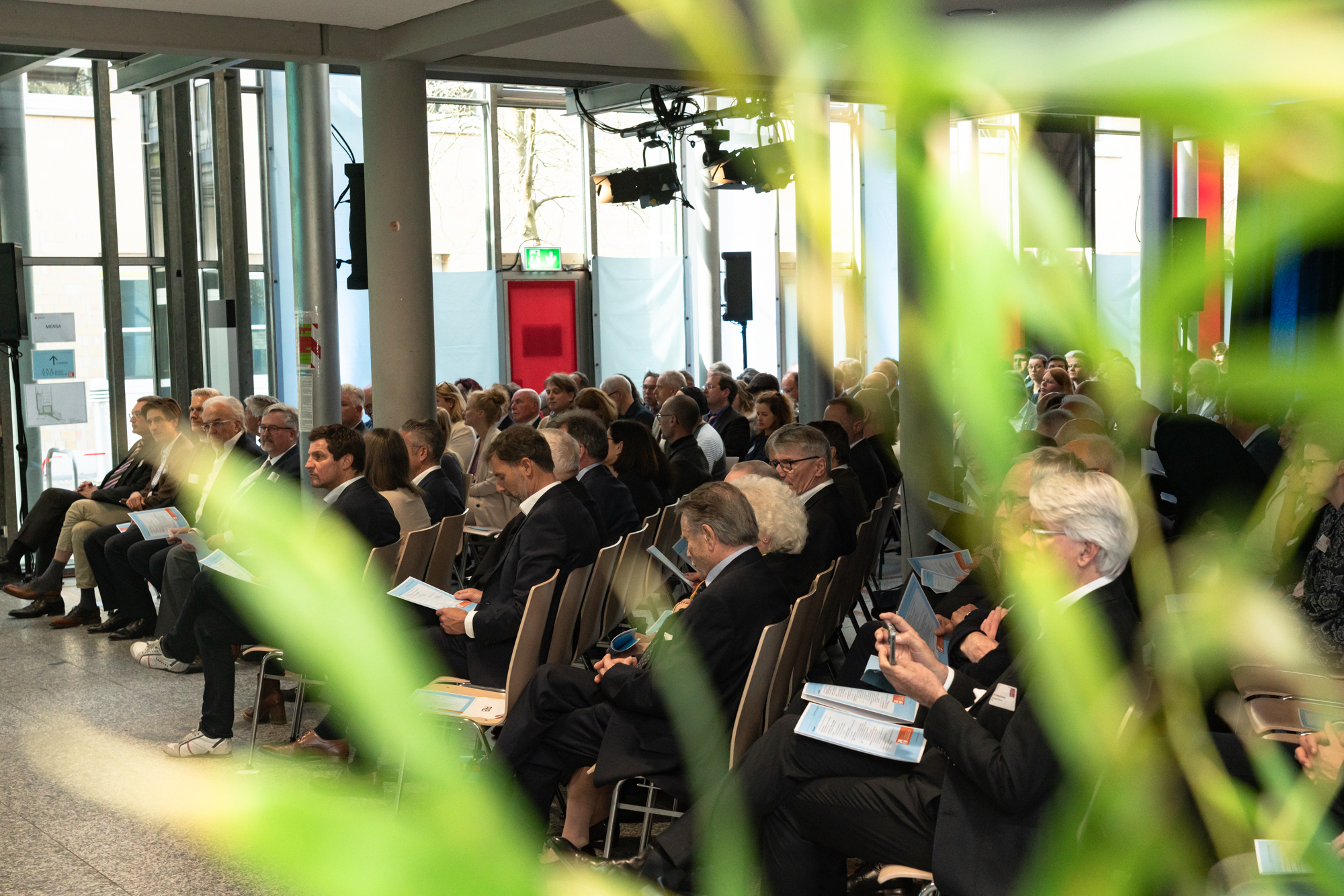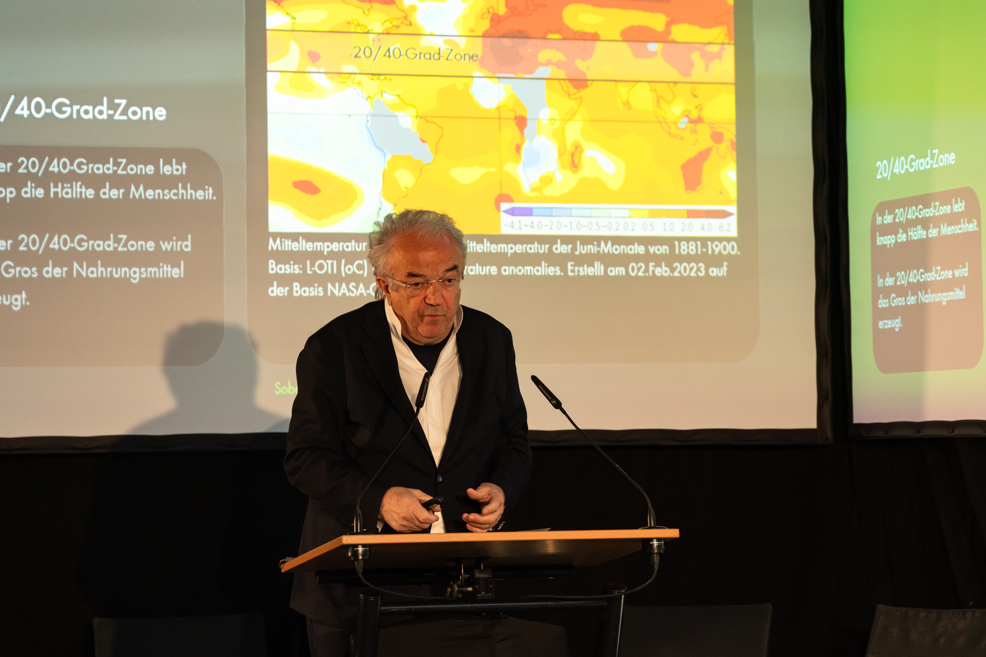 Im Anschluss an die Ansprachen und Grußworte trat der Architekt und Bauingenieur Prof. Dr. Werner Sobek, Gründer und Aufsichtsratsvorsitzender der Werner Sobek AG auf die Bühne, einem Büro für Nachhaltiges Engineering und Design. Präzise und durchaus aufrüttelnd gab er in seinem Impulsvortrag eine Einordnung des menschengemachten Klimawandels und der Notwendigkeit der Bauwirtschaft, für diese Herausforderungen schnelle Lösungen zu finden. „Bauen in einer neuen Welt“ bedeute eine menschliche Heimat zu schaffen und dabei die sozialen Komponenten wie Bevölkerungswachstum, Migrationen und Hungersnöte ebenso zu berücksichtigen wie ökonomische (Verursacherprinzip rückwirkend und aktuell), kulturelle (Bauen als soziale Interaktion oder Teil der Kunst) und technische Komponenten (Energie, Emissionen, Ressourcen).