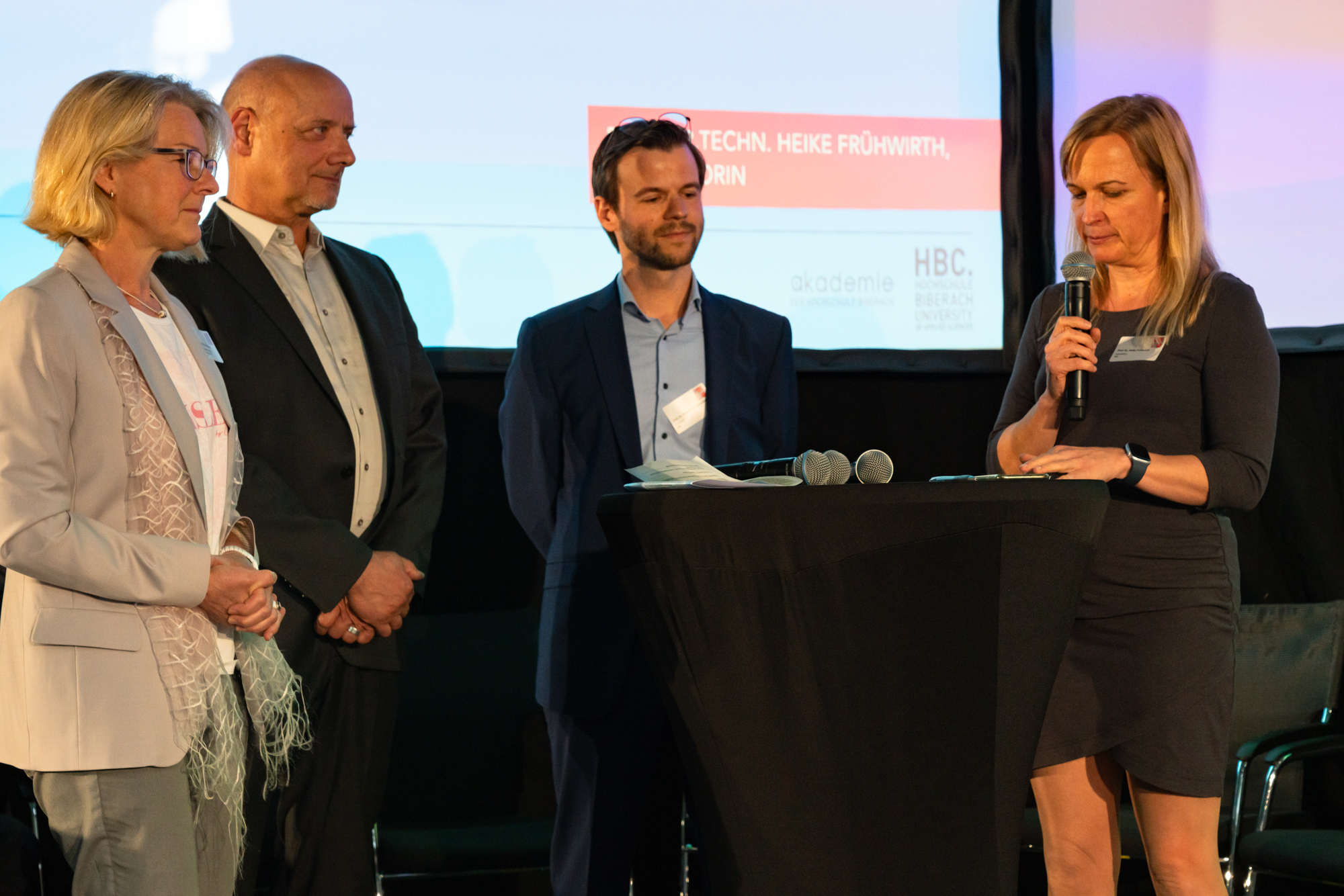 Mit einem Augenzwinkern präsentierte Maik Hornuff zum Anschluss ein KI-Projekt, das im Kontext des Jubiläums auf Initiative der Didaktikbeauftragten der Hochschule, Prof. Henrike Mattheis, entstanden ist: Ein HBC-Song, generiert mittels Künstlicher Intelligenz. Die Veranstalter hatten zunächst die Hochschulmitglieder um ihren persönlichen Satz zur Hochschule und der Akademie gebeten. Daraus wurde mithilfe von KI zunächst ein Songtext generiert und mit diesem wiederum ein KI-Programm gespeist, um den Songtext mit Musik zu hinterlegen. Entstanden ist ein Song, der die Hochschule als Ort der Expertise, der Bildung und der Gemeinschaft beschreibt – und Biberach als kleine Stadt mit oho-Effekt: dem Schützenfest, gegen das die Big Party in München keine Chance hat. Ob der Song über die Jubiläumsveranstaltung hinaus zur Hymne für die Hochschule Biberach gerät? Das bleibt freilich abzuwarten; die Rückmeldungen bei der Veranstaltung waren durchweg positiv und vor allem waren die Gäste überrascht, was KI alles kann.
