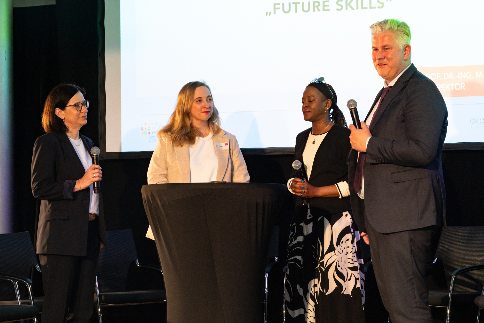 Dazu passte gut die Talkrunde von Maik Hornuff zum Thema Future Skills. Welche Kompetenzen benötigen junge Fachkräfte neben den jeweils fachlichen? Silke Rauber-Reichert (Mitglied im Vorstand der Akademie) sprach von Future Mindset und der Fähigkeit, Herausforderungen anzugehen. Jennifer Blank, Leiterin des Instituts für Bildungstransfer, machte deutlich, wie sich die Arbeitswelt verändert und Berufstätige in die Lage versetzt werden müssen, diesen Wandel zu gestalten. Dafür seien erweiterte Kompetenzen notwendig, die über Formate des Lebenslanges Lernen gewonnen werden können. „Normalbiografien trifft man heute nicht mehr an“, so Blank.