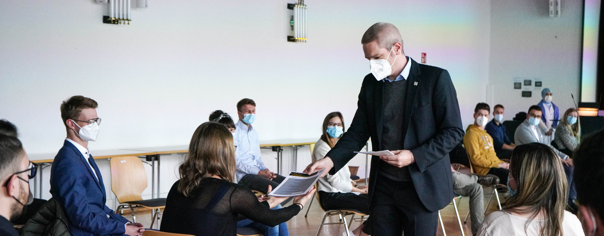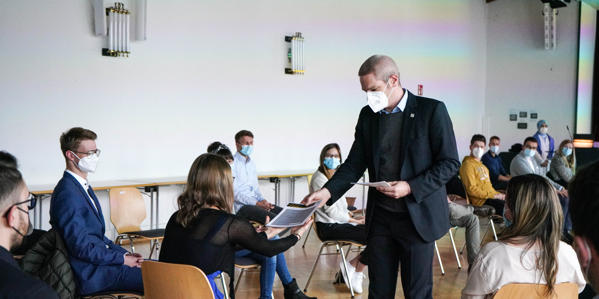 Auch in Zeiten von Corona gelingen Studienabschlüsse und erbringen viele Studierende ausgesprochen gute Leistungen und viel Engagement. Vielleicht sogar mehr als zu normalen Zeiten verdienen diese Erfolge eine besondere Wertschätzung. In einem kleinen, internen Rahmen konnte diese in diesem Semester im hochschulöffentlichen Raum stattfinden. Insgesamt 44 Preise hat Prorektor Prof. Jens Winter am Freitagmorgen an Absolvetinnen und Absolventen aber auch noch immatrikulierte Studierende und einen Lehrenden in der HBC-Aula vergeben.