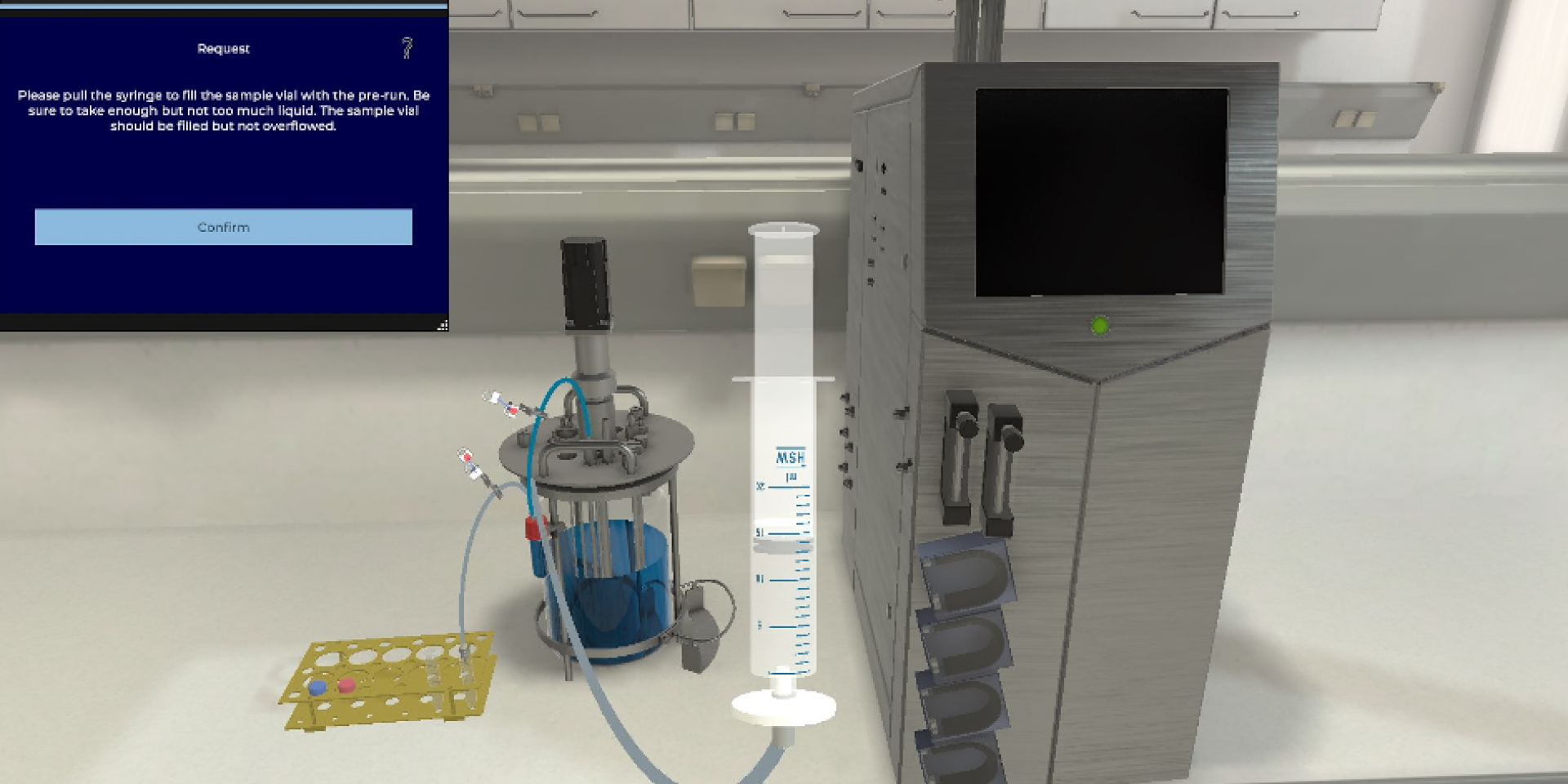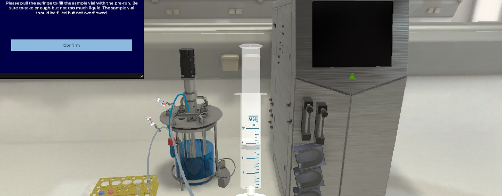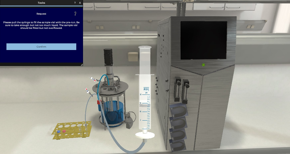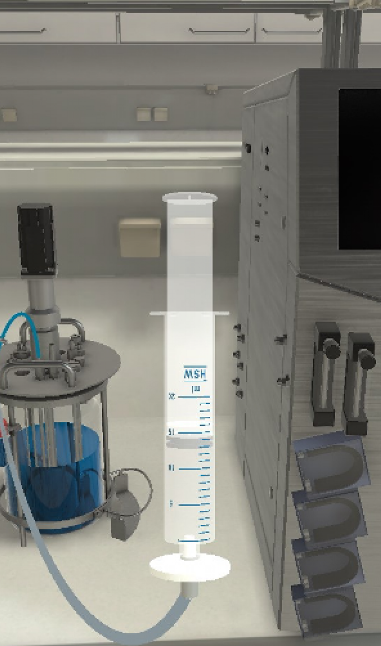 Next Generation Process Technologies: Virtual reality scenario – taking a sample from a benchtop bioreactor. Such scenarios can for example be used for training purposes.