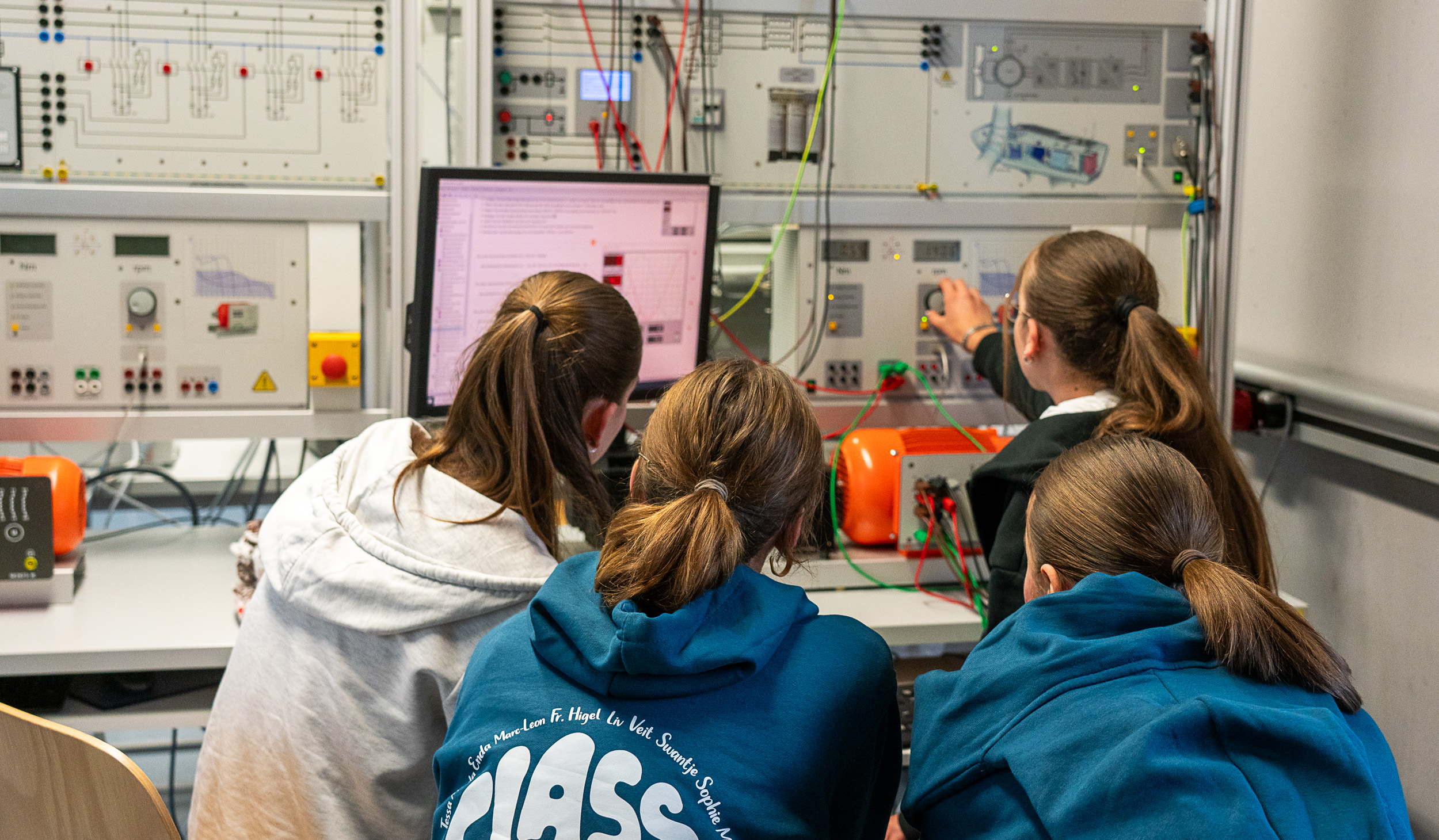 Die knapp 30 Schüler*innen erhielten die einzigartige Gelegenheit, praktische Versuche im hochmodernen Smart Grid Labor der Hochschule durchzuführen und Energiesysteme zu simulieren. In rotierenden Gruppen durchliefen sie verschiedene Versuchsstationen, darunter eine Photovoltaikanlage, eine Windkraftanlage, die Netzsynchronisation sowie die Anwendung von Fischertechnik. Ergänzt wurde das Programm durch einen Mikrocontroller-Workshop.