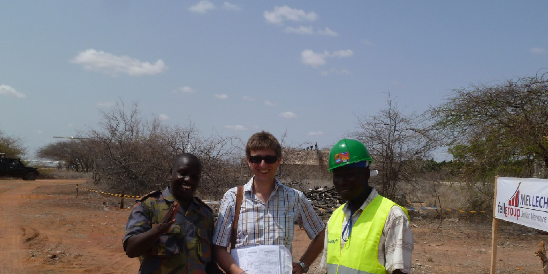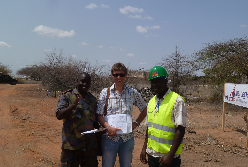 Bildinformation: Unser Bild zeigt Professor Angermeier bei einer Arbeitsbesprechung mit einer lokalen Baufirma in Wajir an der Somalischen Grenze. Dort war er damit betraut, die Erweiterung des bestehenden Flughafens zu kontrollieren und zu bewerten. Der Flughafen wird von allen Flugzeugen aus Mogadishu angeflogen; die Maschinen werden Sicherheitschecks unterzogen bevor sie weiterfliegen dürfen.