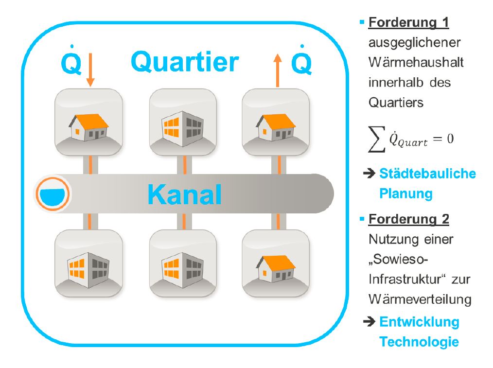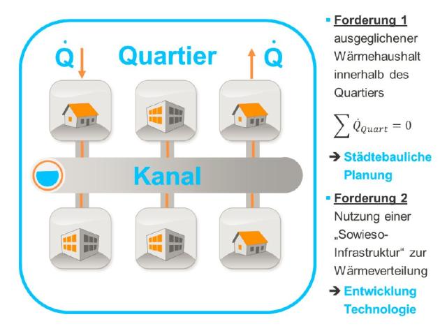 Abb. 1 Prinzipskizze des Forschungsziels: ausgeglichener jahreszeitlicher Wärmehaushalt eines Stadtquartiers unter Nutzung der per se vorhandenen Infrastruktursysteme der Siedlungswasser-wirtschaft (Kanäle).
