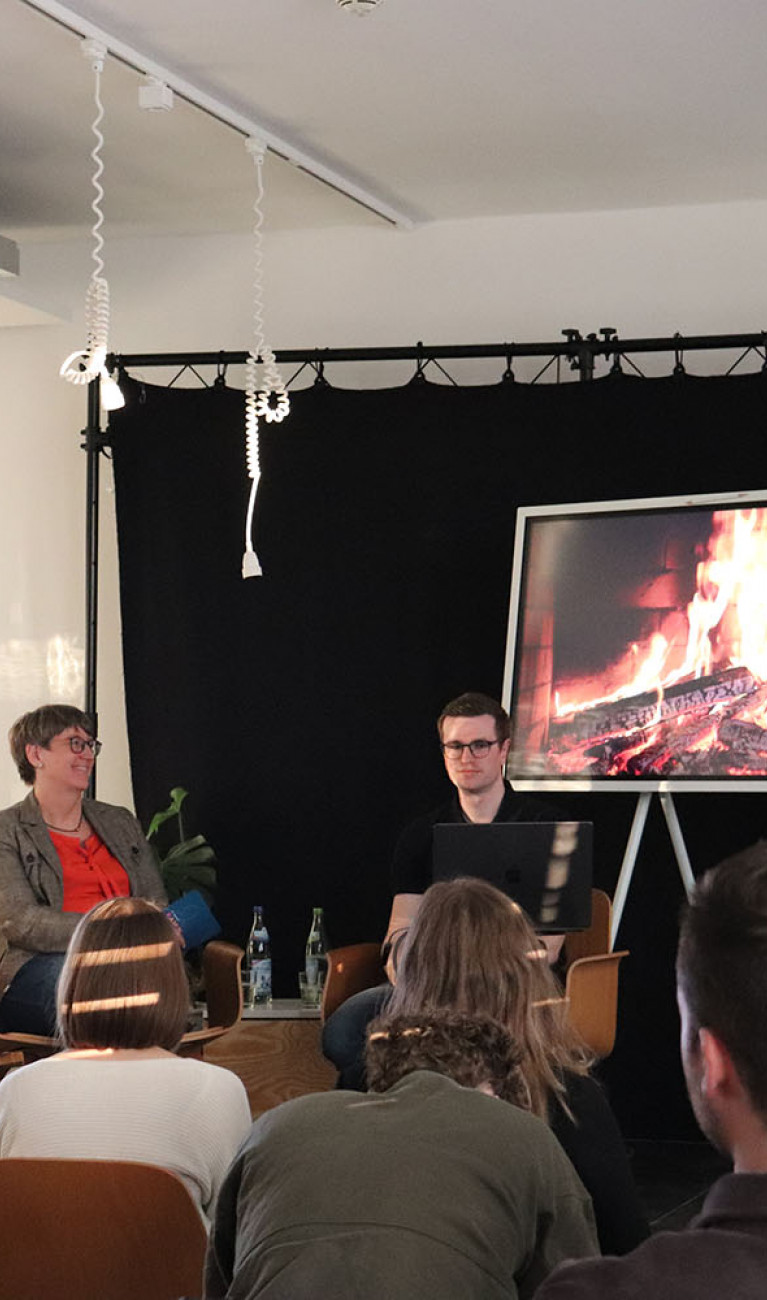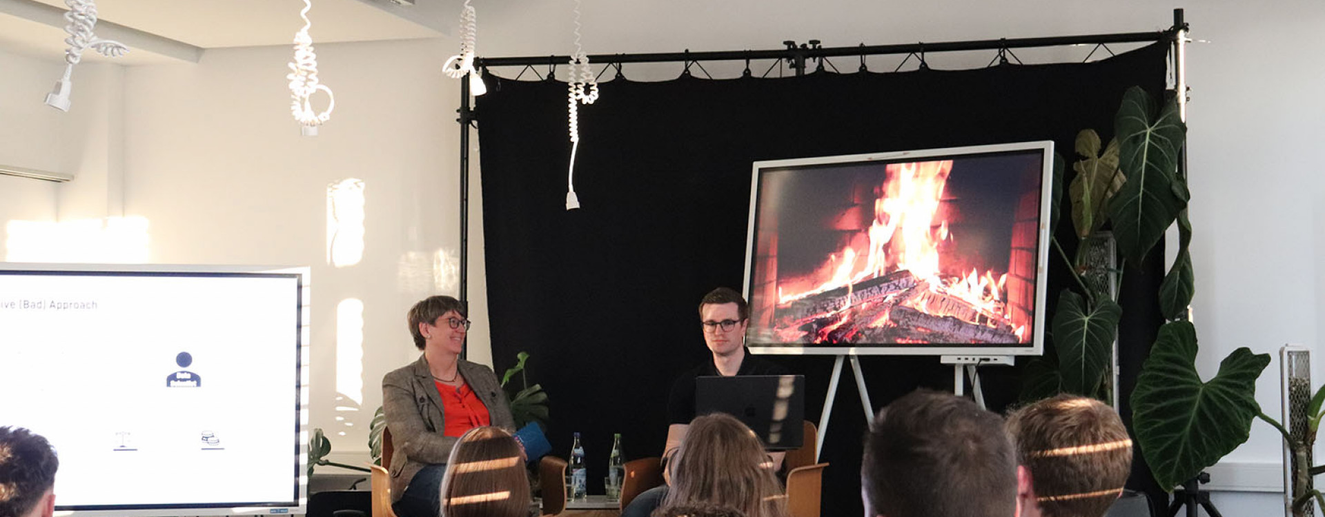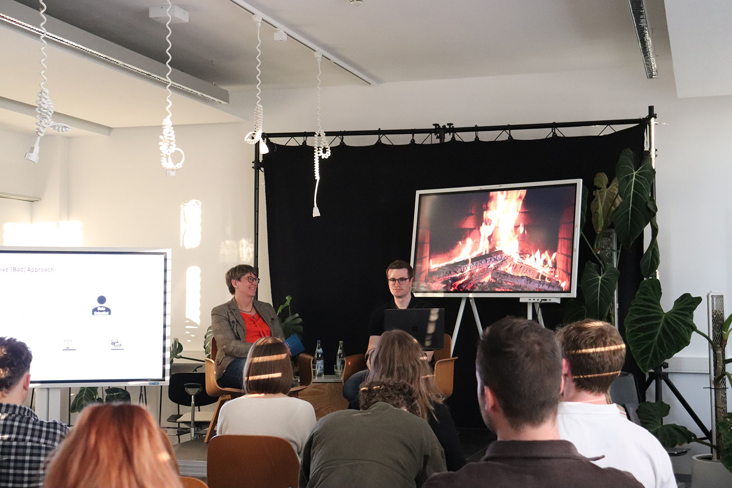 Moderiert wurde der Abend von Renate Stratmann, Mitarbeiterin am Institut für Bildungstransfer. Die anwesenden Studierenden, Mitarbeiter*innen und Lehrenden der HBC brachten sich rege in die Diskussion ein: Insbesondere die konkrete Anwendung von KI bei aktuellen Produkten des Unternehmens, wie Haushaltsgeräten oder Baufahrzeugen, stand im Interesse der Zuhörenden. Aber auch generelle KI-Themen, wie Datenschutz, der Standort der Server oder technische Fragen der Umsetzung waren von Interesse.