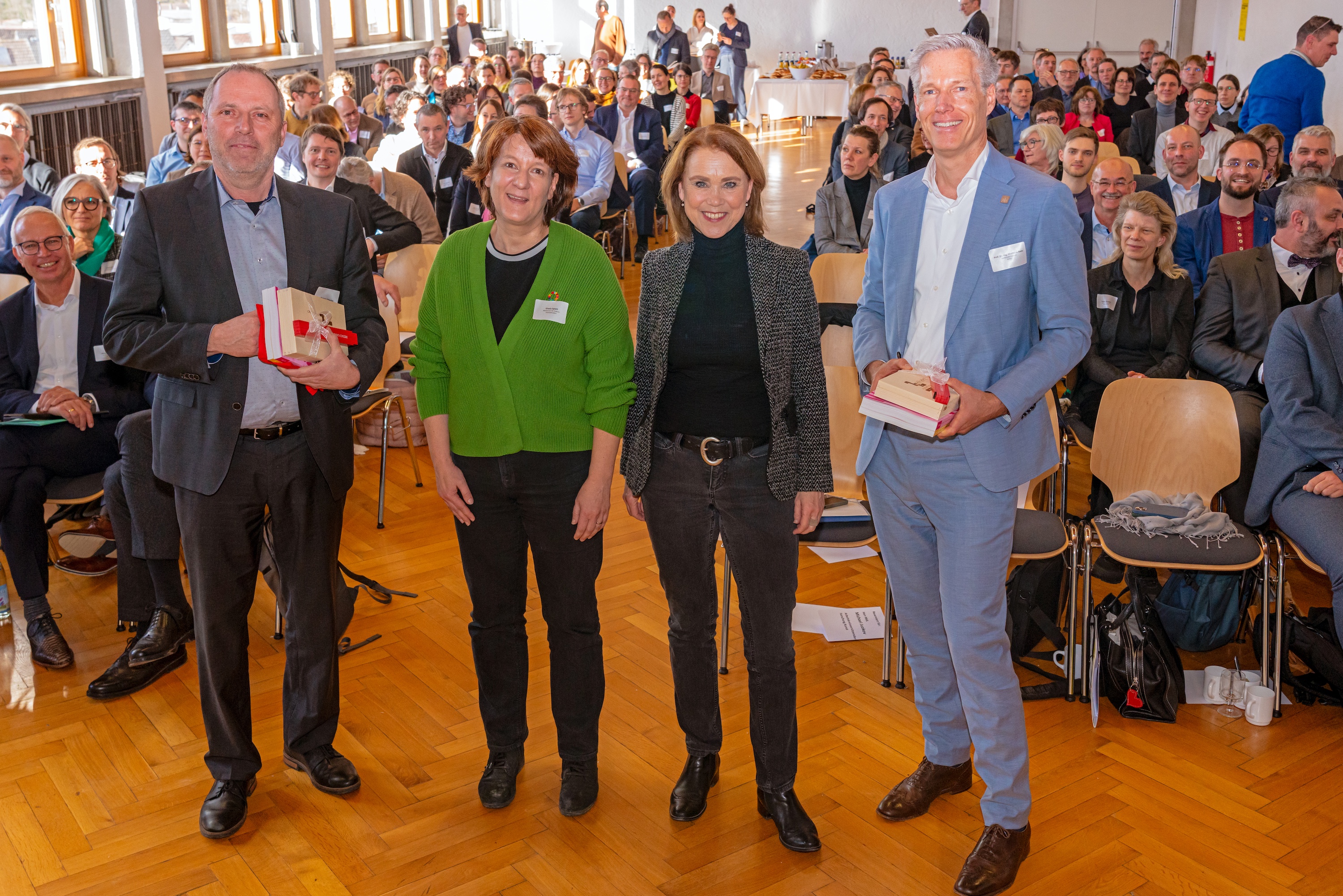 Foto: Rektor Bahr und Kanzler Schwäble überreichten Ministerin Petra Olschowski und Gisela Splett u.a. die Bücher zur Campusentwicklung an der Hochschule Biberach