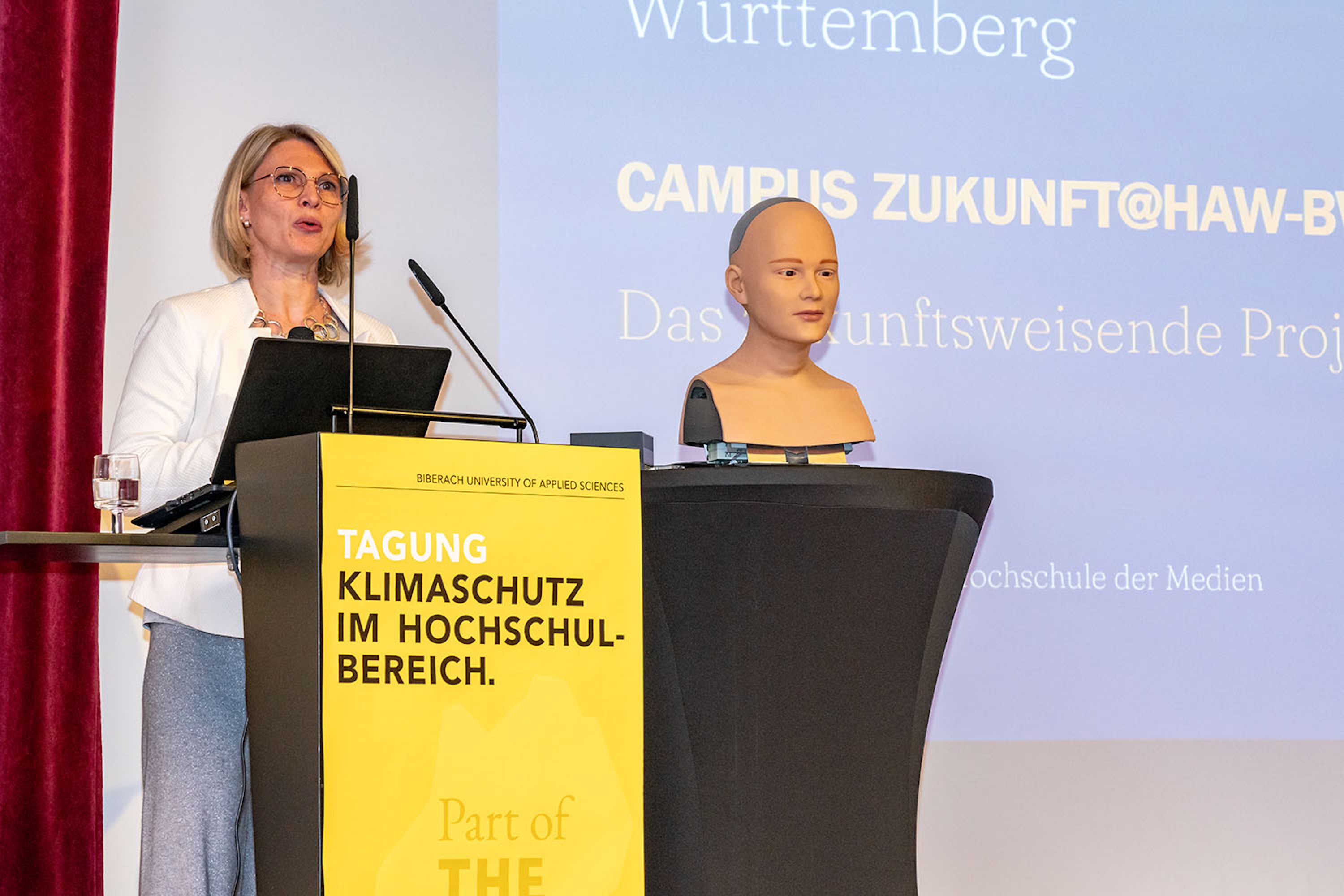 Foto: Nicole Kuhn, Kanzlerin der Hochschule der Medien Stuttgart ging für ihren Impuls in den Dialog mit einem sogenannten "Roboterkopf". Kim beantwortete Fragen zur Veranstaltung sowie zum Thema Klimaschutzmanagement an Hochschulen.