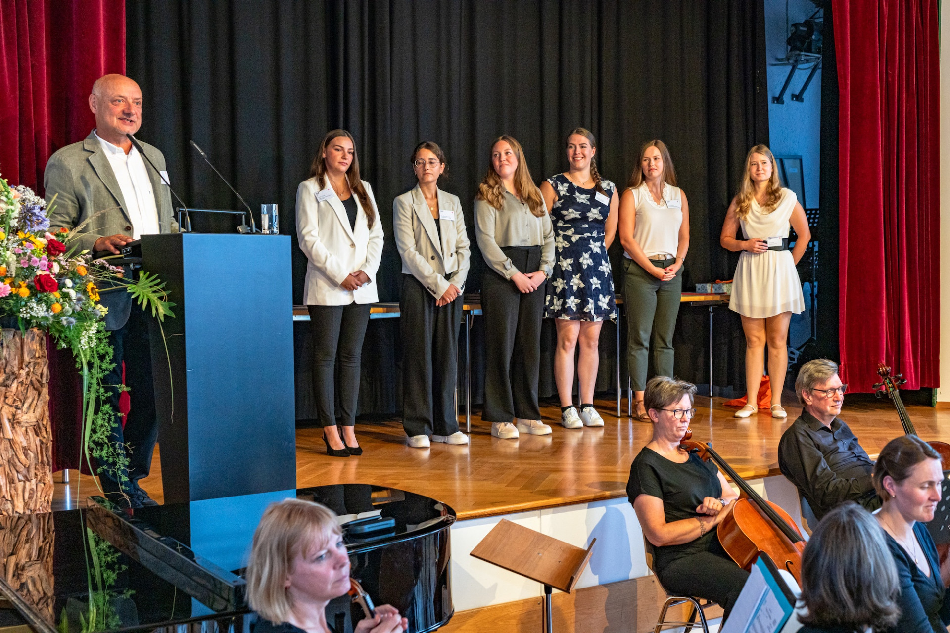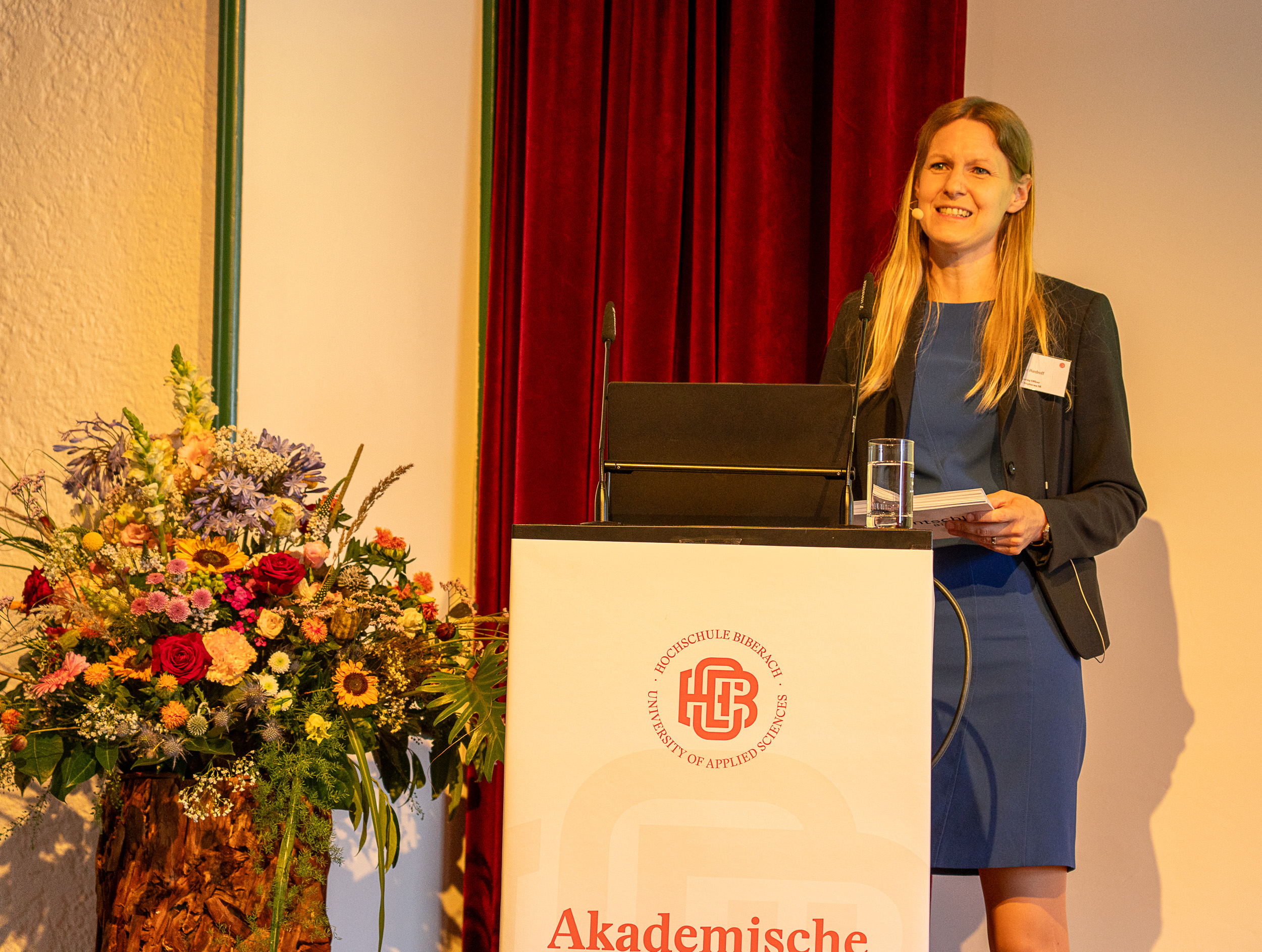 Denn wer einmal scheitere, benötige Kraft und Unterstützung, „um wieder aufzustehen, das Krönchen zu richten und weiterzumachen“, so die Vorständin des Biopharmaunternehmens mit Sitz in Laupheim über ihren Wahlspruch. Dies jedoch sei nur mit dem Rückhalt anderer möglich. „Die Welt hat euch verdient – gestaltet unsere Zukunft mit eurer Persönlichkeit“ rief Christiane Bardroff deshalb den Absolvent*innen zu und erhielt für diesen persönlichen Exkurs sehr viel Applaus.