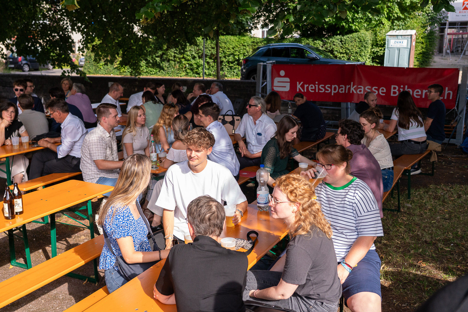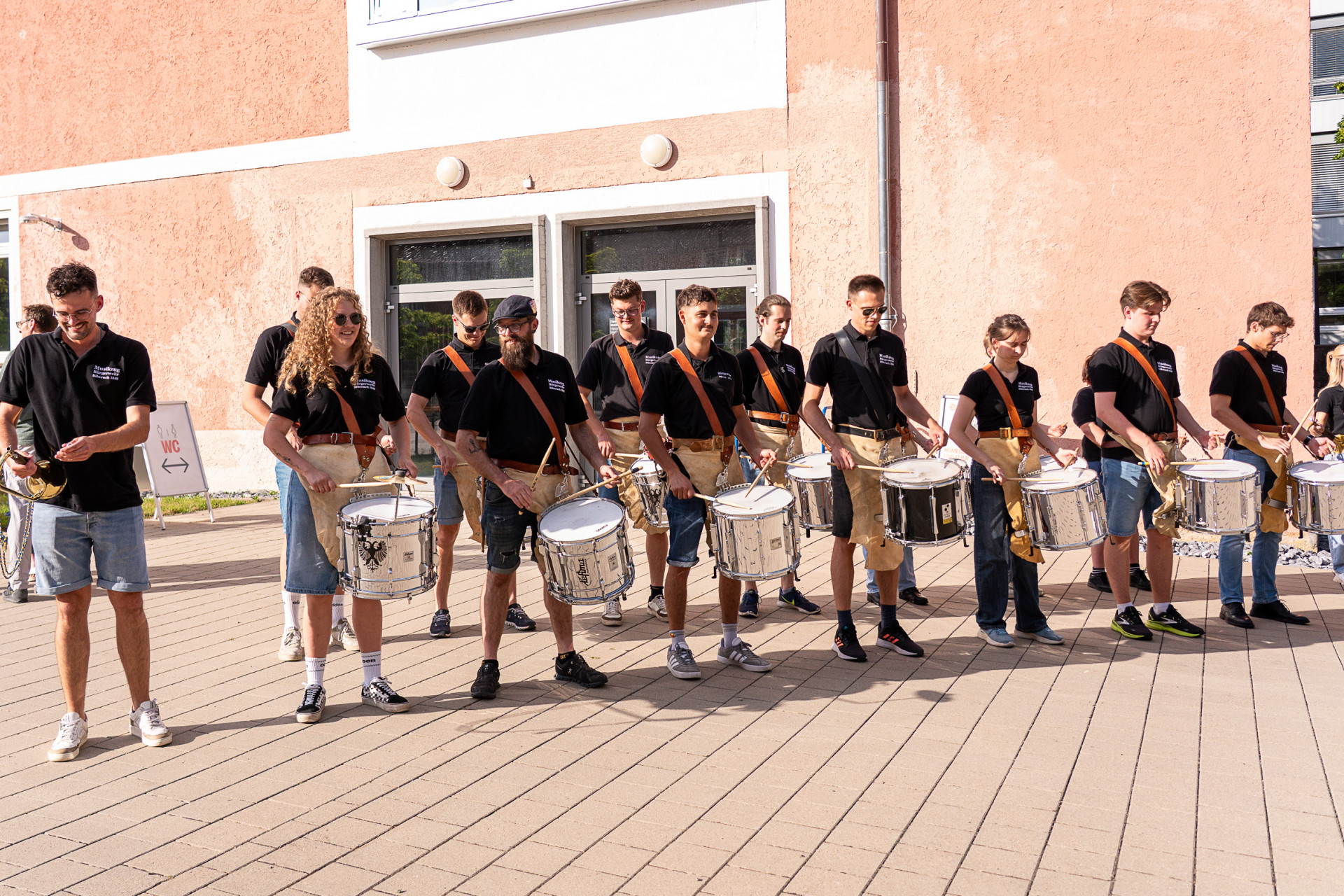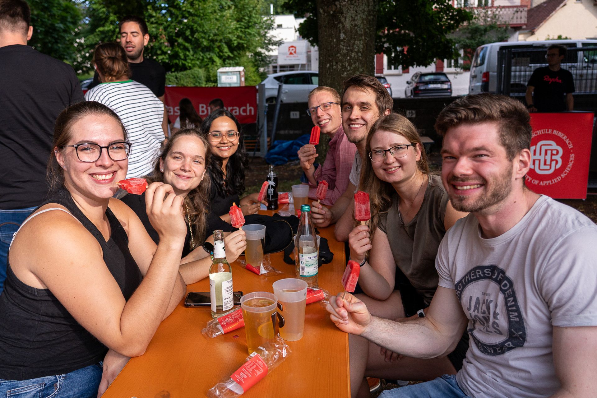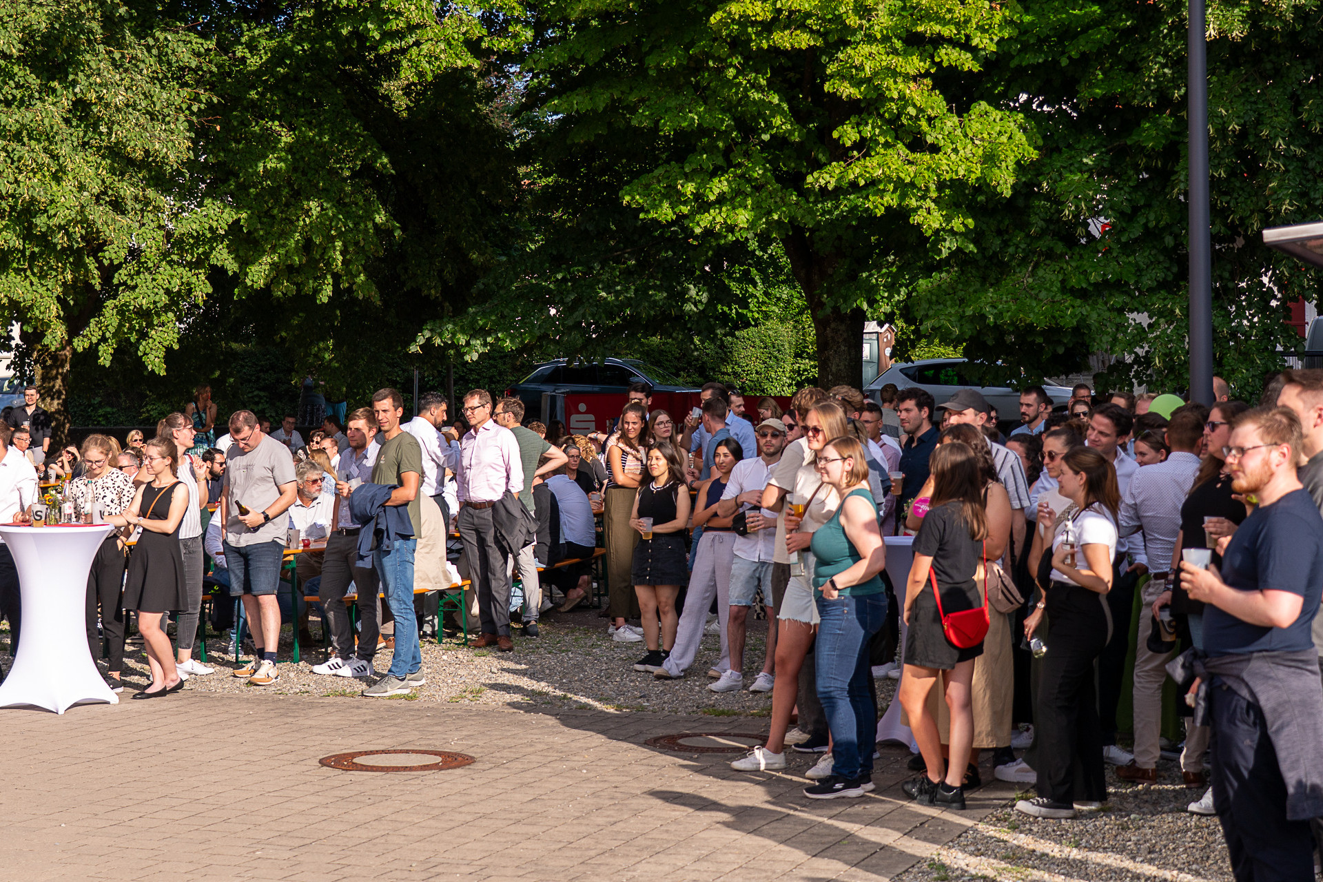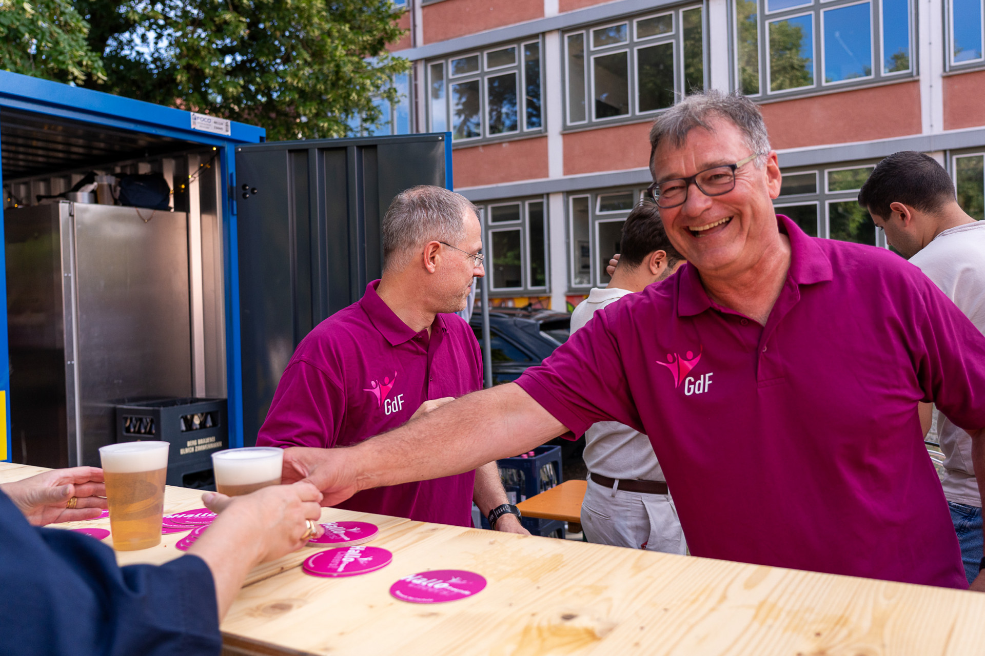 Beim zentralen Alumni-Fest am Abend des ersten Schützenfreitags schenkte der GdF-Vorstand aus diesem Anlass Freigetränke aus. Der Einladung folgten viele ehemalige Studierende, Mitarbeitende und Lehrende, sodass rund 400 Hochschulangehörige am Campus Stadt zusammenkamen. Für dieses Wiedersehen bot der neu gestaltete Lindengarten einen gemütlichen Rahmen für Gespräche und Erinnerungen.