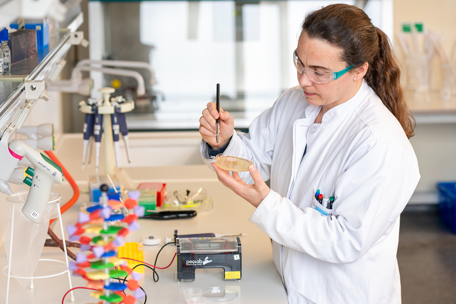 Wenn die Naturwissenschaftlerin Sandra Behmüller ihr Wissen weitergeben kann, ist sie in ihrem Element. Spannende Experimente passend für jede Altersstufe entwickeln, die Kinder und Jugendlichen einweisen und dann: machen lassen! Die Akademische Mitarbeiterin der Fakultät Biotechnologie an der Hochschule Biberach (HBC) ist begeisterte Mentorin für alle, die neugierig sind und ihre Umwelt entdecken und erforschen wollen. In verschiedenen Kursen und Formaten gibt sie ihr Wissen weiter – u.a. betreut sie Studierende in den Praktika für Mikrobiologie, Gentechnik und Molekularbiologie in den Studiengängen pharmazeutische und medizinische Biotechnologie, inklusive Vor- und Nachbereitung.