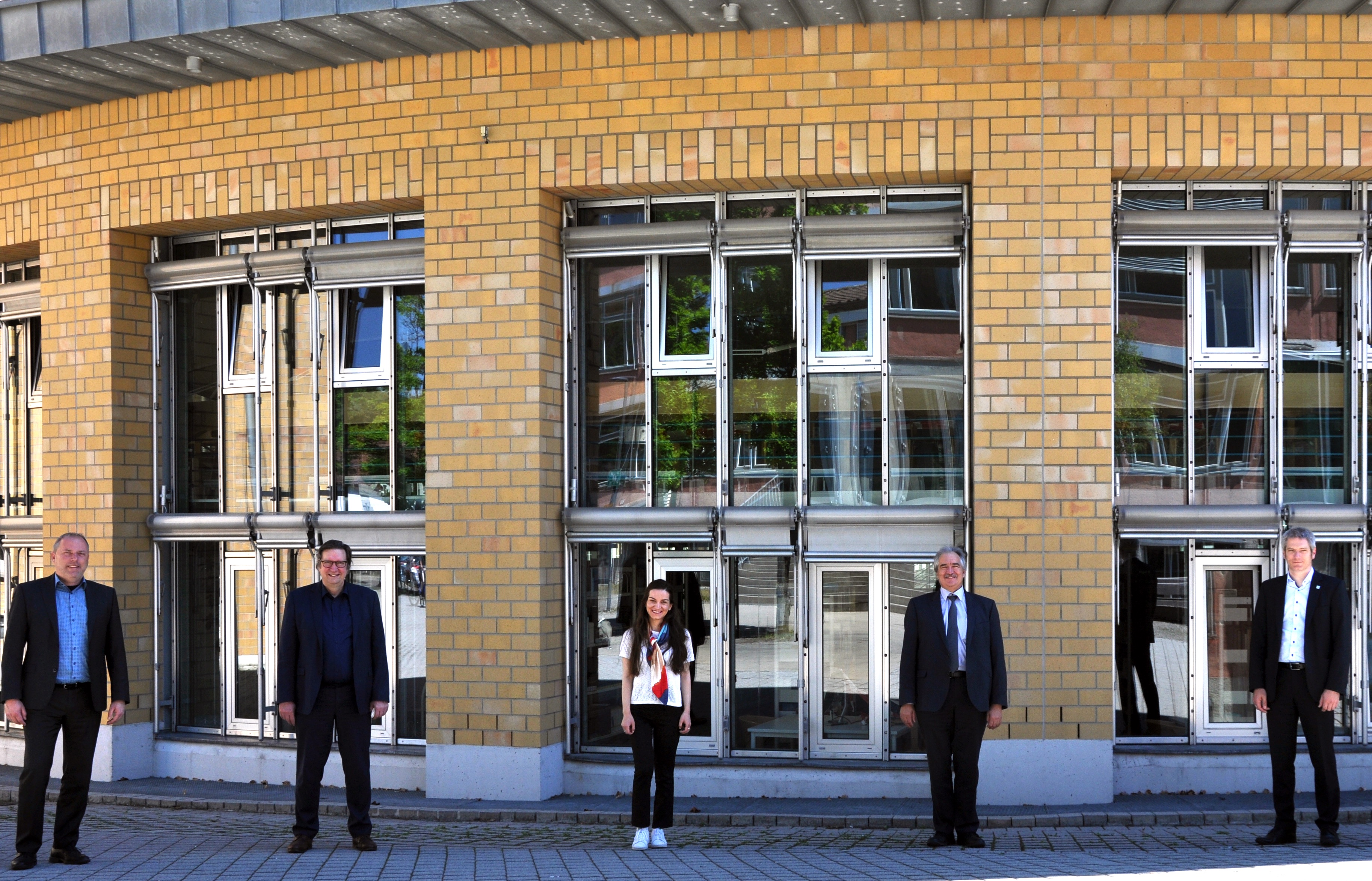 Bühnenbild: Josef Rief MdB zu Gast an der Hochschule Biberach. Mit der Hochschulleitung - Kanzler Thomas Schwäble, Rektor Professor André Bleicher und Prorektor Professor Jens Winter - diskutierte er die Zukunftsthemen Bauen und Bioökonomie. Begleitet wurde Josef Rief (Bildmitte) Tamari Tchakvadze, Teilnehmerin am Internationalen Parlamentsstipendium des Bundestages / Foto: HBC