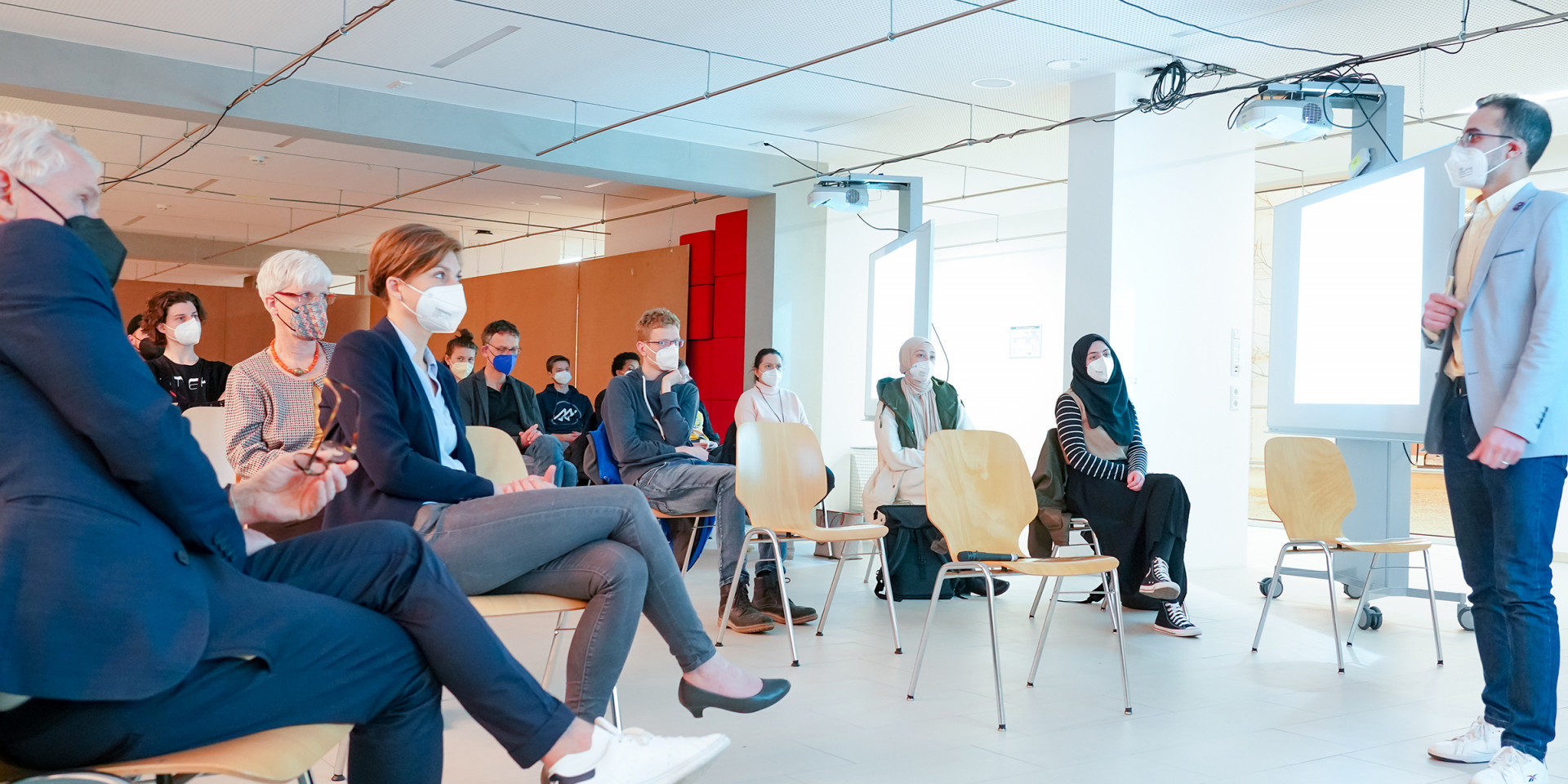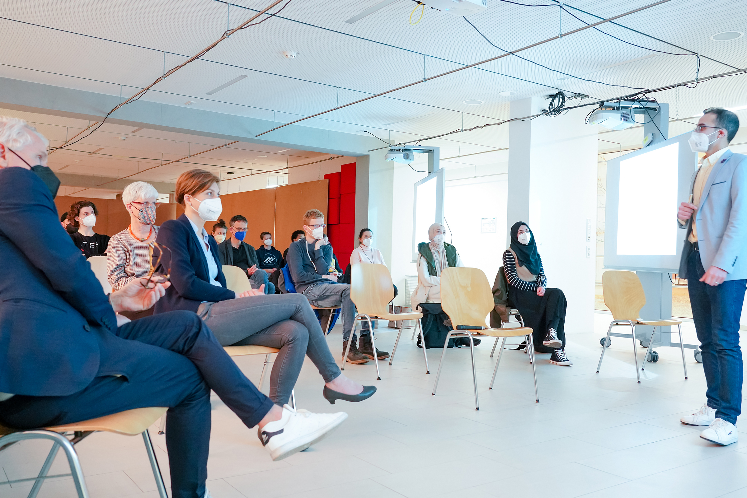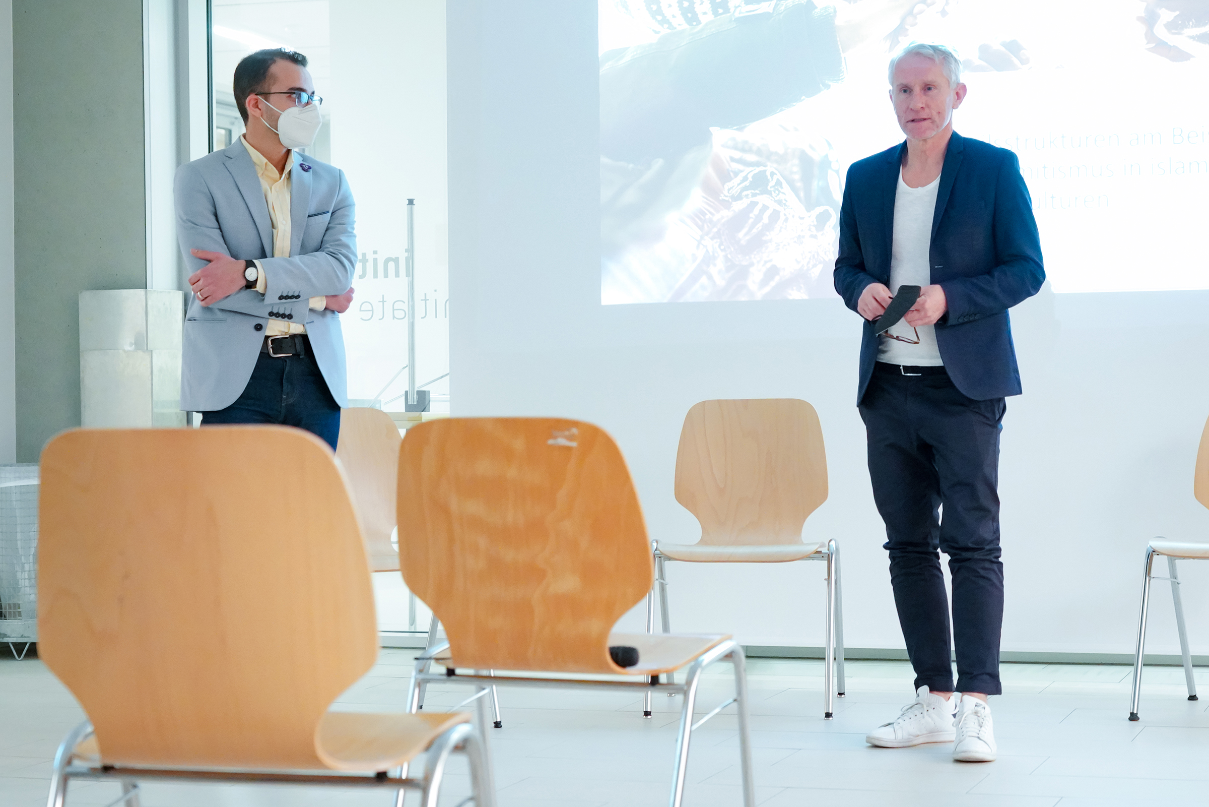 Foto: Ahmed Gafaar vom Demokratiezentrum Baden-Württemberg (links) und Organisator, sowie Inklusionsbeauftragter der HBC Prof. Wolfgang Brune beim Vortrag an der Hochschule Biberach. ©HBC