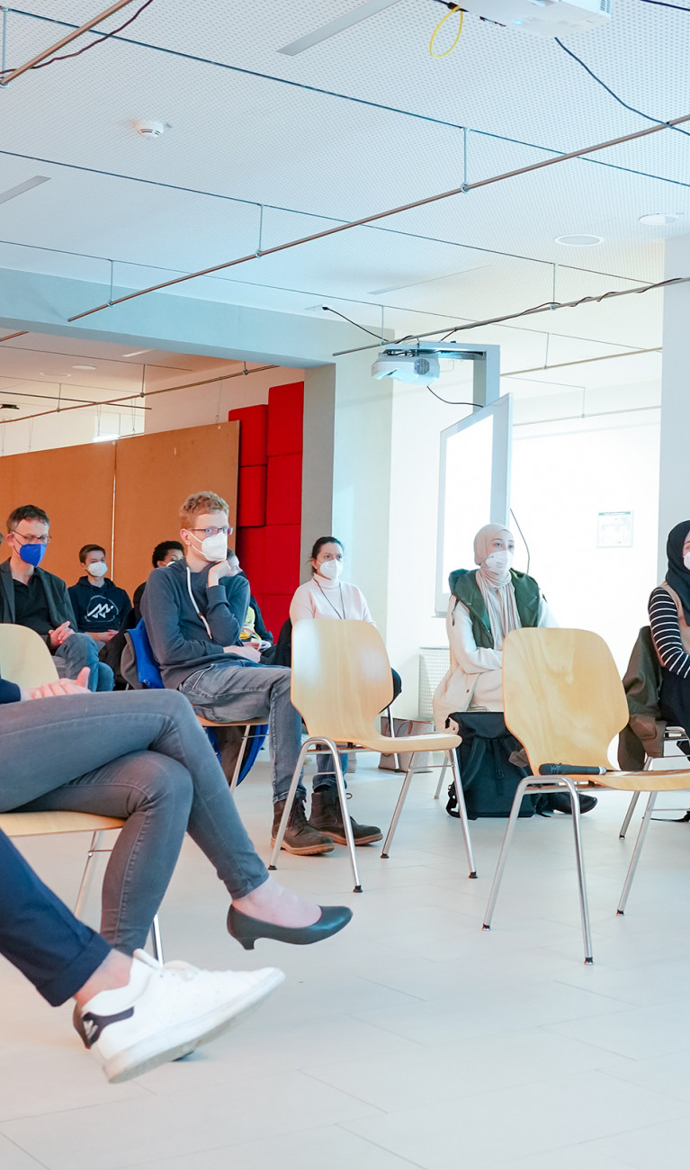 Im Anschluss zum Vortrag konnten Erfahrungen unterschiedlicher Art ausgetauscht werden. Die Podiumsdiskussion mit dem Referenten, Frau Friederike Höhndorf (Demokratiezentrum Oberschwaben), Frau Frauke Zimmermann (Familienbeauftragte der HBC), Frau Kübra Atar (Studentin), und Prof. Wolfgang Brune (Inklusionsbeauftragter der HBC) hat die unterschiedlichen Erfahrungen verschiedener Merkmalsgruppen offenlegen können. In einem wertschätzenden Dialog kam es zum Austausch verschiedener Lebenserfahrungen und Eindrücke der Beteiligten. Besonders dankbar waren Berichte der Studierenden Kübra Atar, die als bekleidete Muslima die offensichtliche Divergenz in allen Gruppen immer wieder aktiv überbrücken muss. Diese Erfahrung konnte Frederike Höhndorf aus ihrer sozialen Arbeit bestätigen. Frauke Zimmermann hat aus der Erfahrung ihrer Arbeit darauf verwiesen, wie unser Verhalten sich durch die Erwartung von Divergenz verändert. Wolfgang Brune verweist in der Diskussion auf den kulturellen, sozialen und intellektuellen Mehrwert der direkten Erfahrung von Diversität und Ahmed Gaafar schließt mit der nachdrücklichen Forderung eines stetig offenen, fragenden und wertschätzenden Dialogs miteinander.