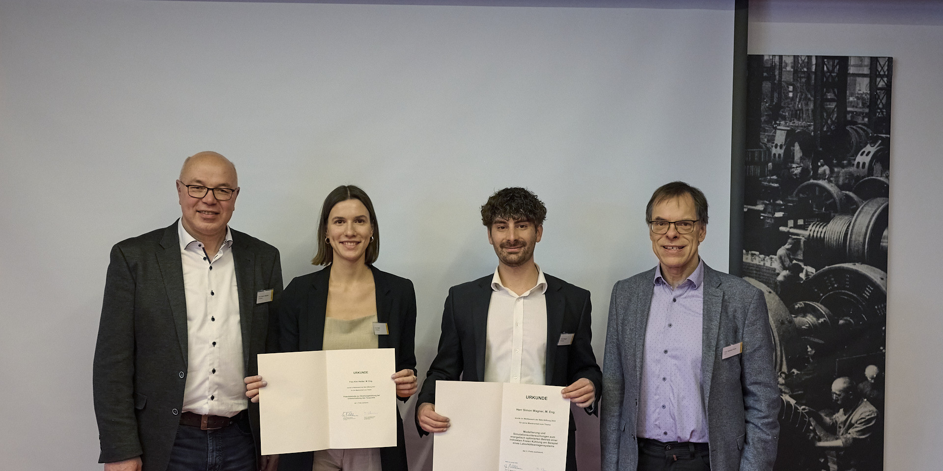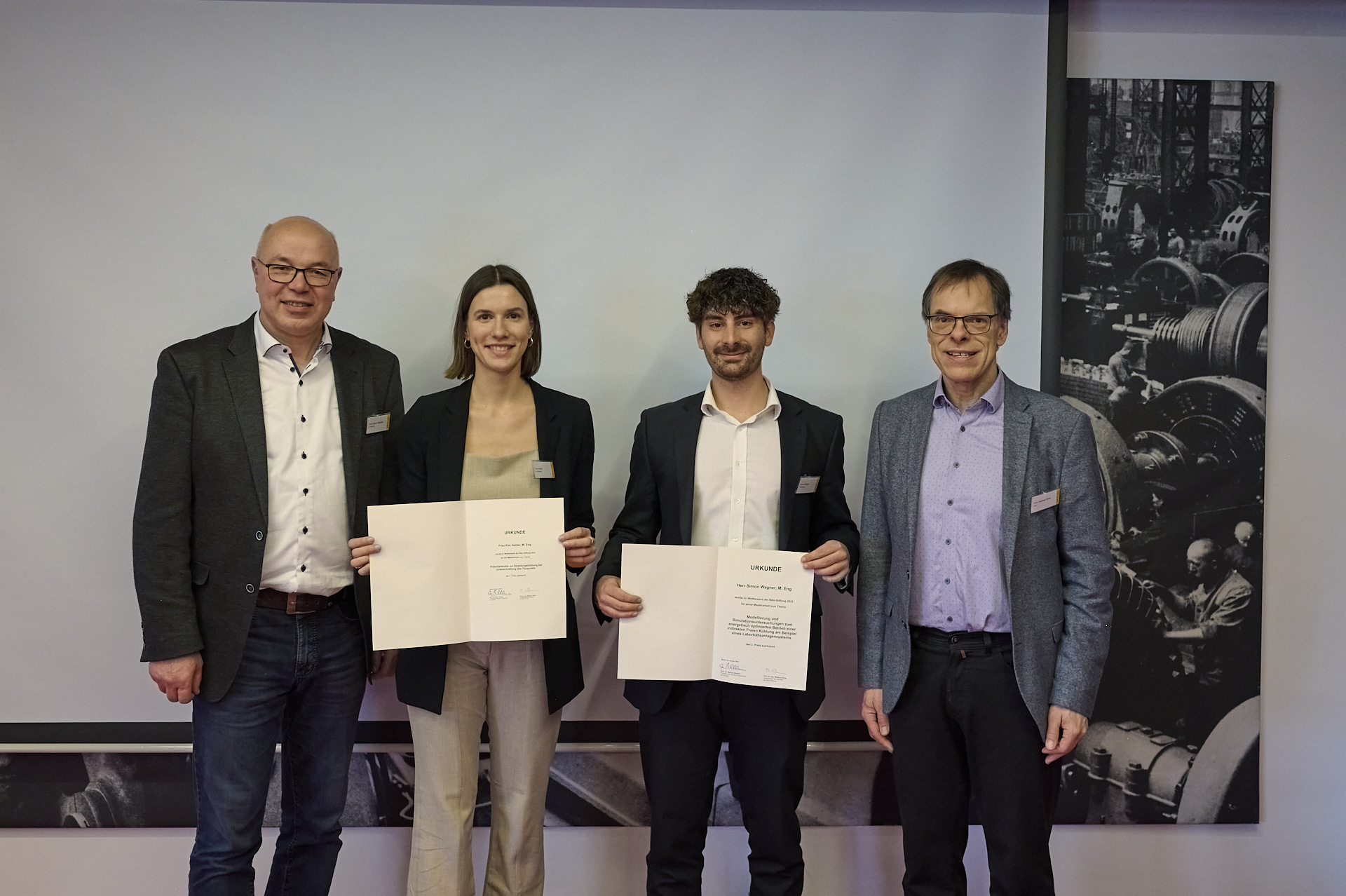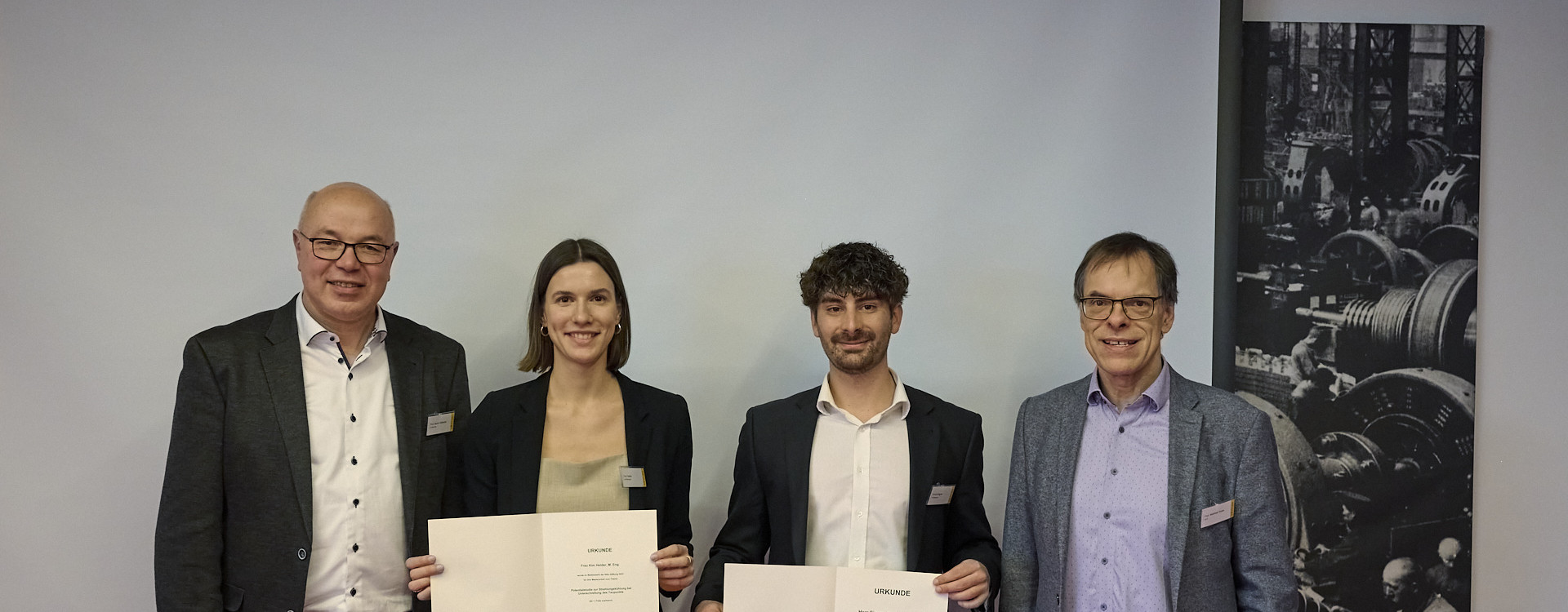 Foto: Die Preisträger*innen Kim Helder und Simon Wagner sowie Prof. Dr. Martin Höttecke, FH Münster, z.Zt. Vorsitzender des Arbeitskreises der Professoren für Gebäudeautomation und Energiesysteme (links) und Prof. Dr. Mathias Kloas, Berliner Hochschule für Technik, z.Zt. Vorsitzender des Bälz-Stiftung (rechts). Foto: Bälz-Stiftung