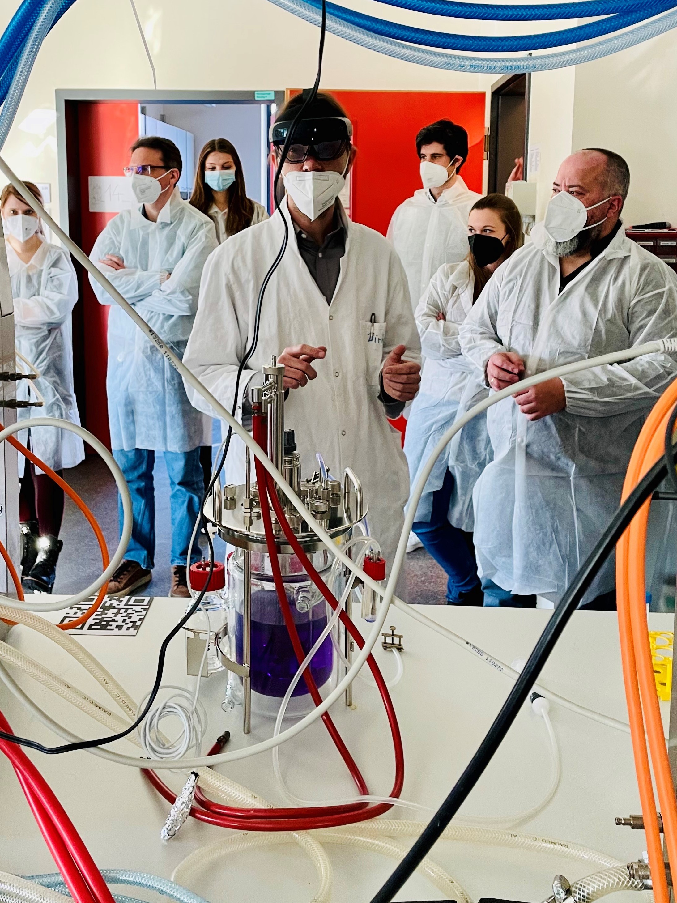Der Leitgedanke des Demonstrators bestand dabei darin, die integrativen Möglichkeiten der Technologie aufzuzeigen, beispielsweise VR-basierte Schulungen oder auch semi-automatisierte Dokumentationen. Zu Beginn wurde daher eine virtuelle Trainingssituation an einem Bioreaktor auf der Basis einer real existierenden Laborumgebung am Institut für Angewandte Biotechnologie der HBC vorgestellt Im Anschluss konnten die TeilnehmerInnen ihre Lernerfahrung direkt in der realen Laborumgebung praktisch anwenden. Unterstützt wurden sie dabei durch eine Augmented-Reality-Brille, die dem Träger oder der Trägerin verschiedene zusätzliche Informationen im realen Blickfeld anzeigt. Auf diesem Wege ist es zum einen möglich, ein virtuelles Abbild der Umgebung in das reale Blickfeld zu integrieren, an dem einzelne Arbeitsschritte abgerufen werden können um etwaige Fehler in der realen Bedienung für die MitarbeiterInnen zu vermeiden. Zum anderen erlaubt eine solche AR/MR-basierte Assistenz zudem die Integration zusätzlicher Digitalisierungsansätze wie zum Beispiel der bildbasierten oder sprachgesteuerten Dokumentation oder auch den Kontakt zu einer zentralen Leitstelle.