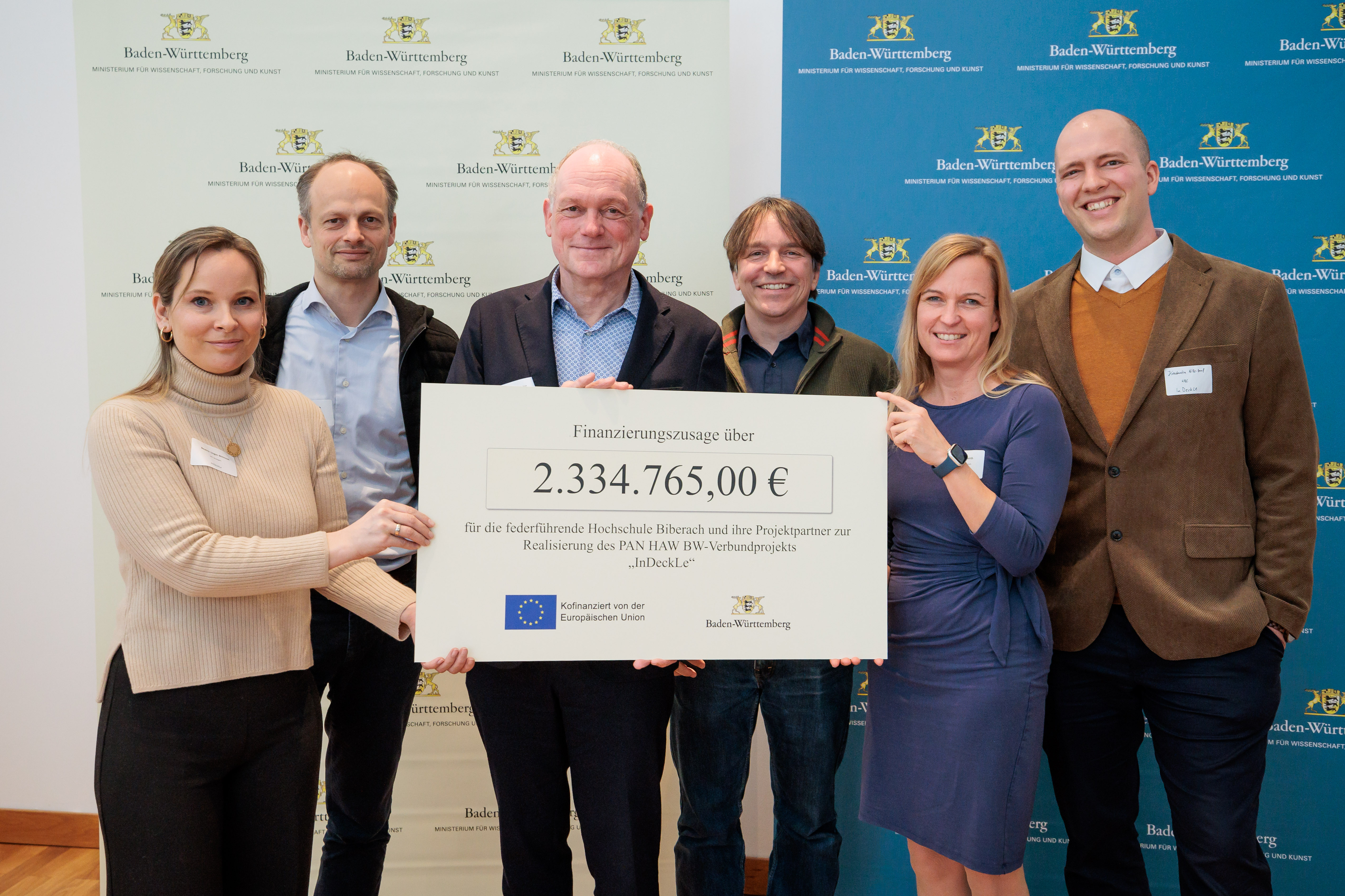 Beim InDeckLe-Projekt (Innovative Deckenkonstruktionen aus Lehmverbund in industrieller Bauweise) steht die Hochschule Biberach im Fokus. Mit dem Ziel, die CO2-Emissionen im Baubereich zu minimieren, erprobt InDeckLe die Verwendung natürlicher Rohstoffe wie Holz und Lehm in Kombination mit Stahl und Beton für innovative Deckenkonstruktionen. Dieser Ansatz verspricht eine nachhaltige Transformation des Bausektors. Das Projekt wird in Zusammenarbeit mit der Hochschule für Technik Stuttgart durchgeführt. Den Scheck über 2,4 Millionen Euro haben bei der Auftaktveranstaltung seitens HBC Prorektorin für Forschung, Tranfer und Kooperationen, Prof. Dr. techn. Heike Frühwirth, Prof. Dr. phil. Jan Grossarth-Maticek, und Konstantin Nille-Hauf entgegen genommen.
