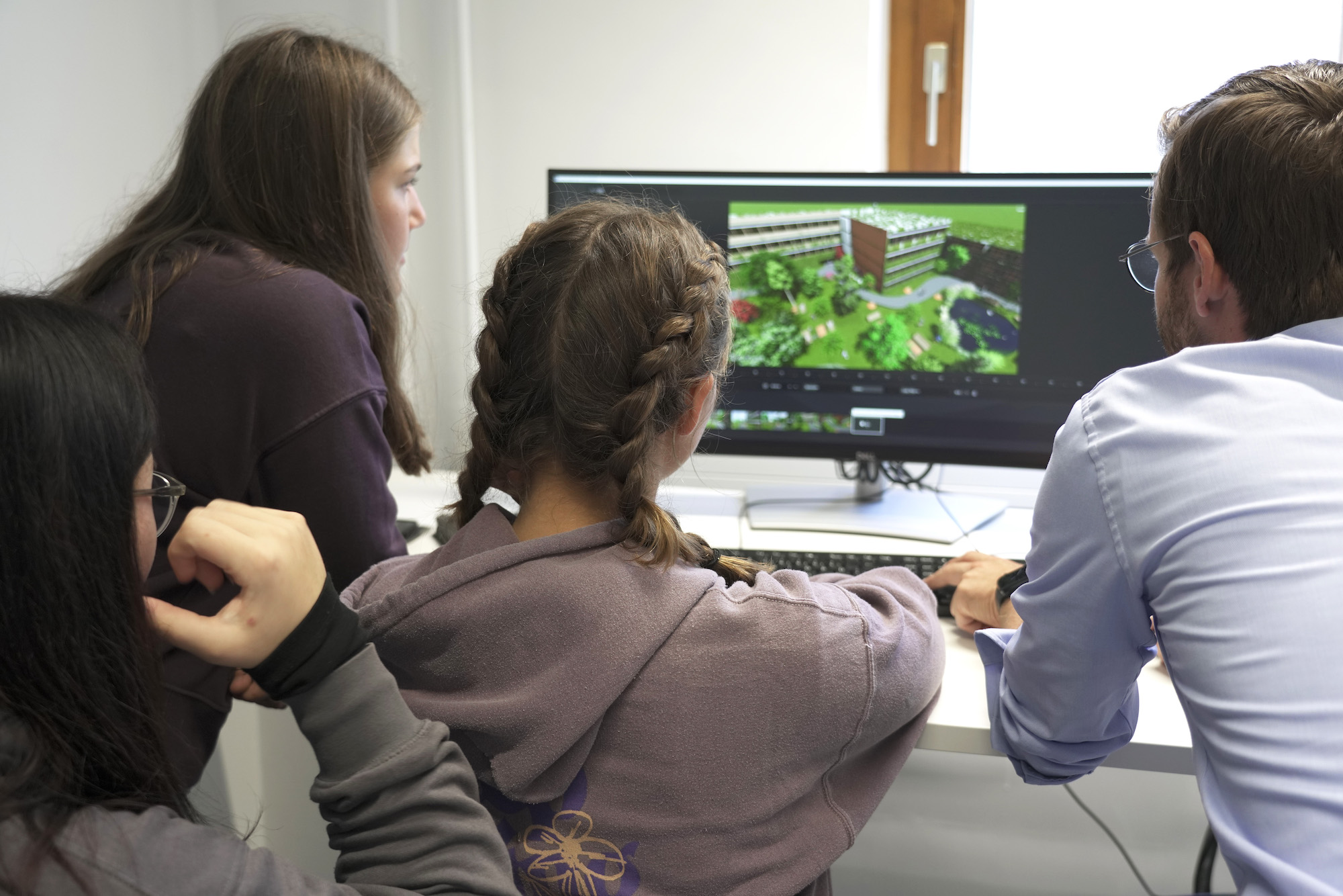Dieses Vorhaben ist ihm beim Besuch der Schulgruppe auf jeden Fall gelungen. An zwei Arbeitsplätzen haben die Schüler*innen mittels Fotos vom Schulgelände ihre Ideen am Computer reingezeichnet und digitale Modelle erstellt. Auf einem großen Bildschirm konnten sie dann ihre Ergebnisse begutachten, den ein oder anderen Baum versetzen und so für die richtige Wohlfühlatomsphäre sorgen. „Für uns war es spannend, neue Programme kennenzulernen und so auch einen Einblick in die Berufswelt zu erhalten“, sagt Ksenya Dubitskaya. Die Planungen nun real zu sehen, sei auf jeden Fall eine Motivation, am Projekt weiterzuarbeiten. Ob Ksenya, Zoe, Finja und ihre Mitschüler*innen später einmal in diesem Bereich studieren wollen, wissen sie noch nicht. Das Interesse für Naturwissenschaften, Technik und unsere Umwelt, genauso wie der Einsatz für nachfolgende Generationen ist auf jeden Fall bemerkenswert.