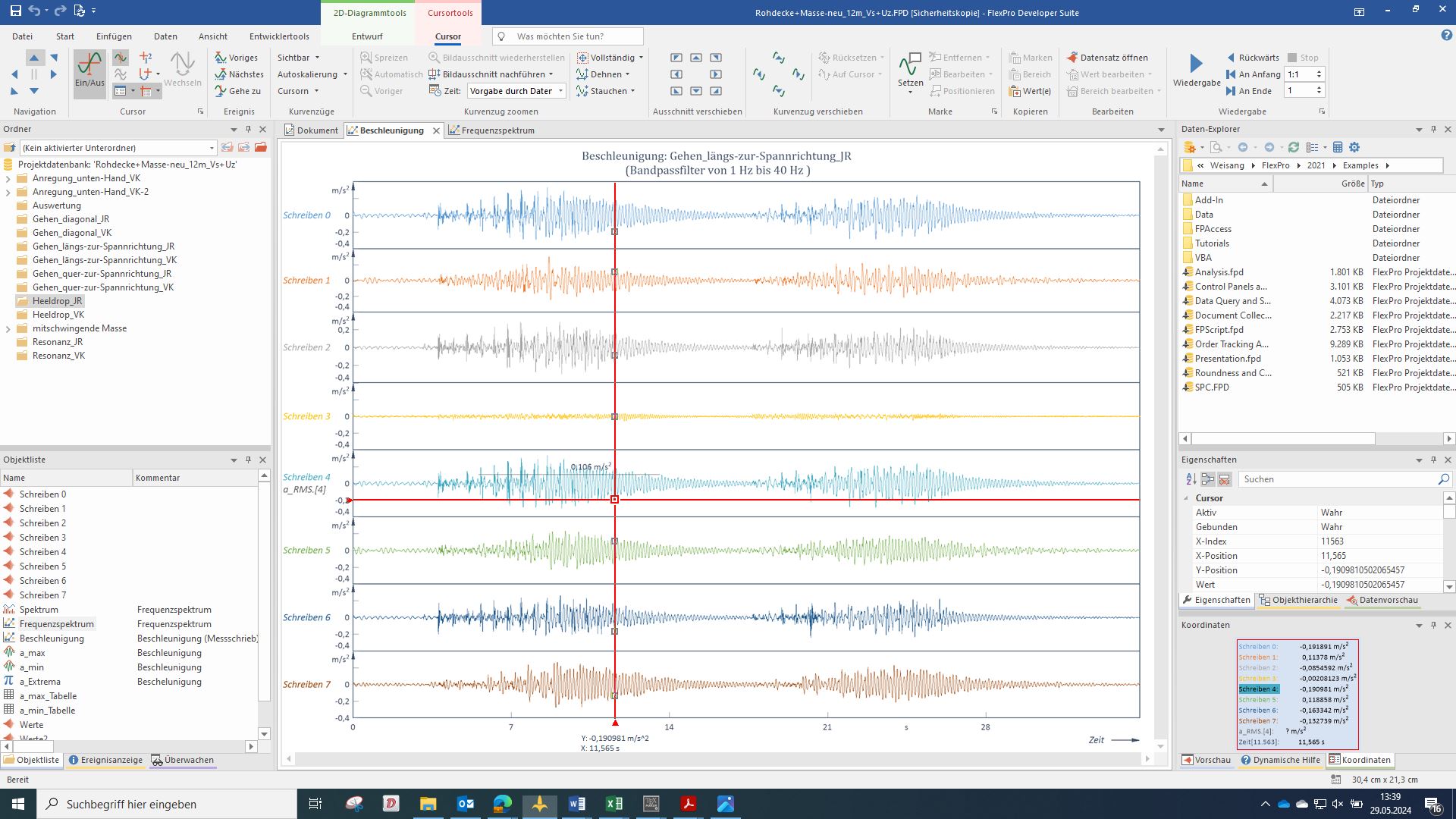 Auf diesem Bild ist der Messschrieb von 8 Beschleunigungsaufnehmern infolge "Gehen" auf einer Decke zu sehen: