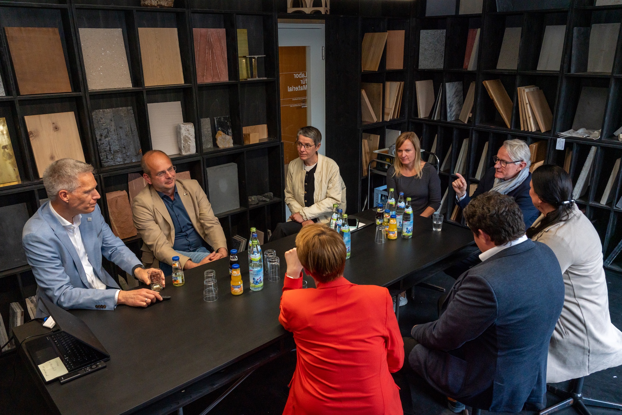 Im Materiallabor konnten die Besucher*innen Materialproben u.a. aus biogenen Stoffen wie etwa dem Wurzelwerk von Pilzen besichtigen. Wie die Prorektor*innen Heike Frühwirth und Wolfgang Brune deutlich machten, dient der Raum dazu, einen Paradigmenwechsel im Umgang mit Baustoffen voranzutreiben – von einer linearen Wegwerf-Mentalität hin zu einer zirkulären, ressourcenschonenden und gestalterisch anspruchsvollen Bauweise. „Die Herausforderung ist, mehr CO2 zu binden als zu produzieren”, so Brune.