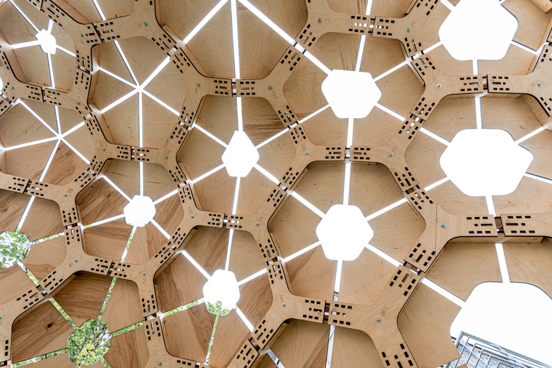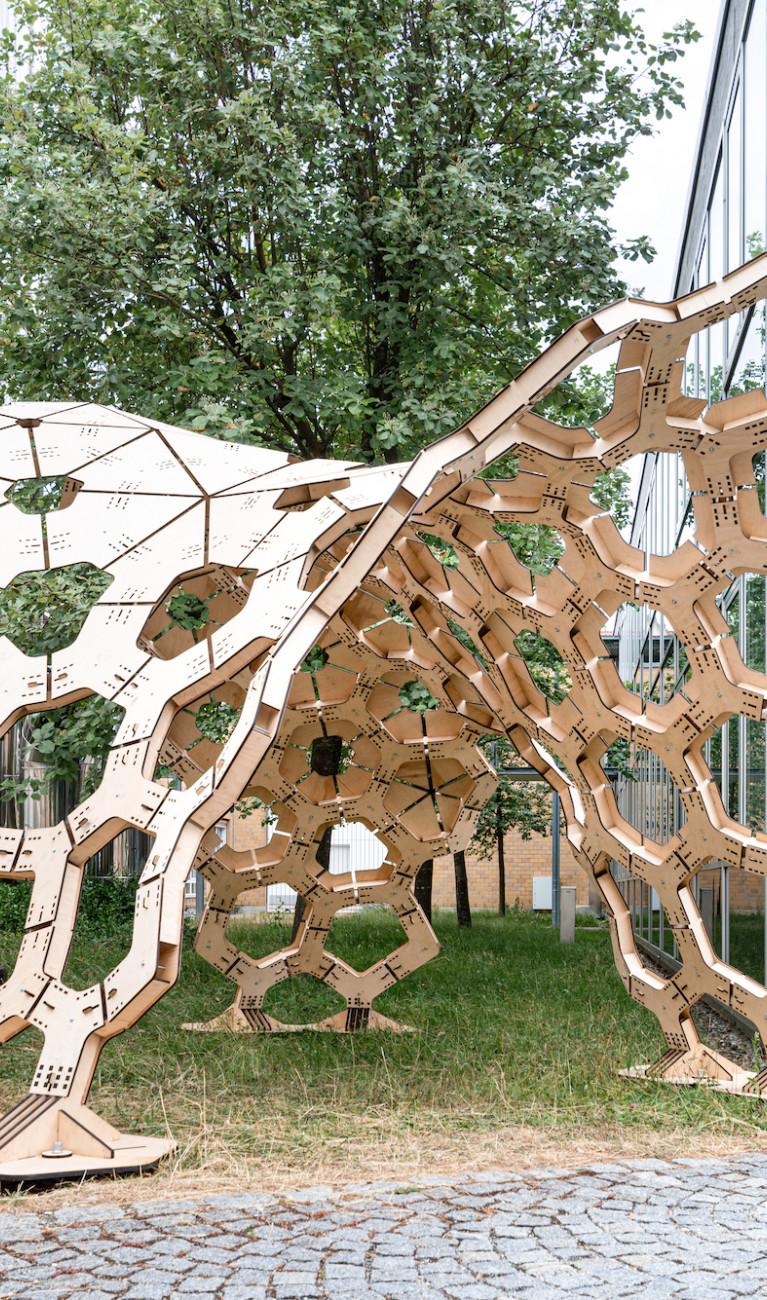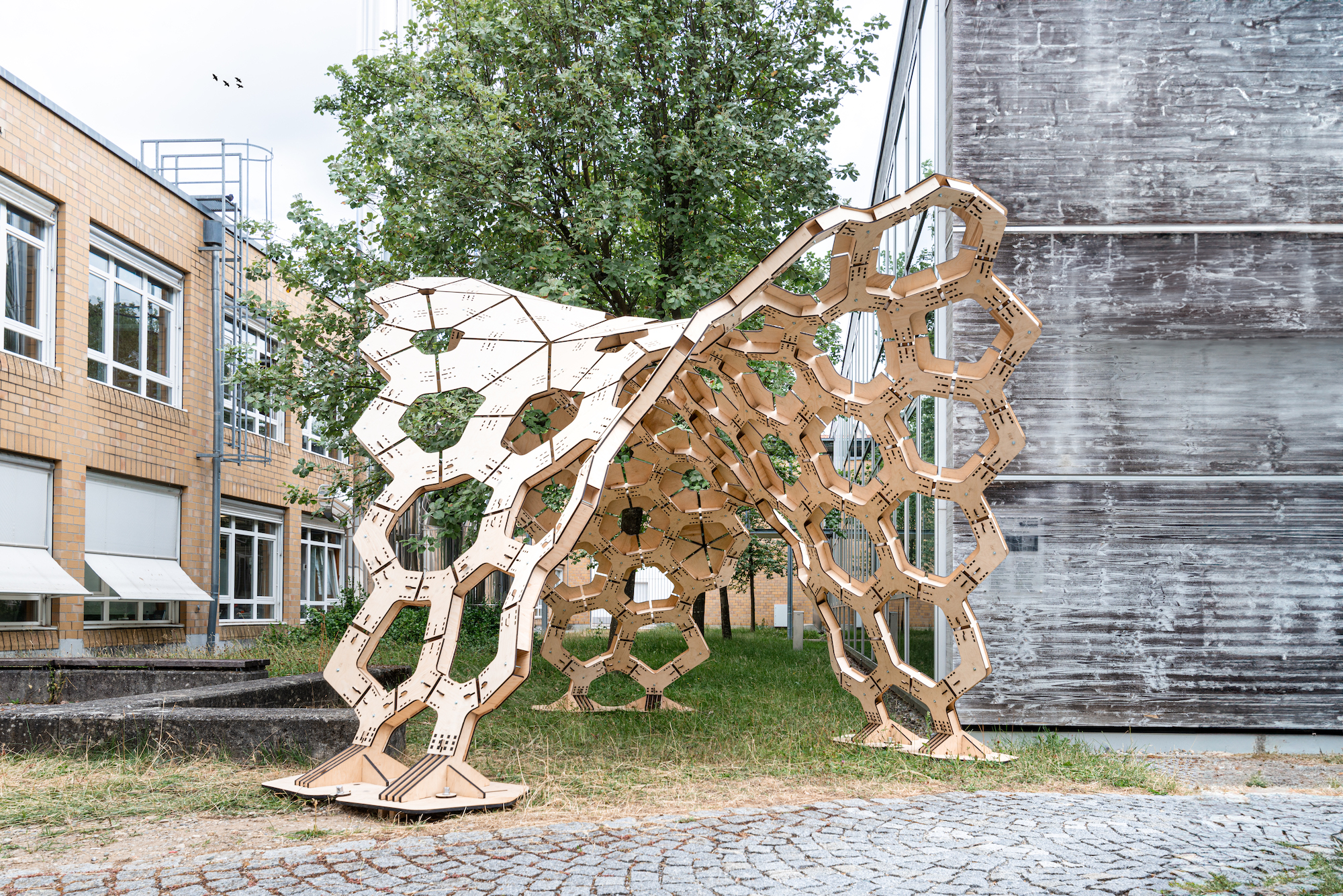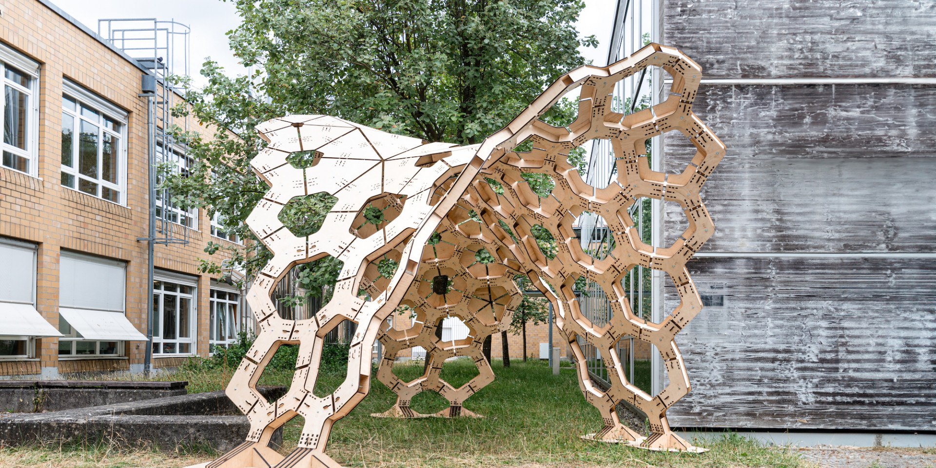 Sie sehen aus wie viele überdimensional große Bienenwaben, zusammengesteckt zu einem Wabengebilde, unter dem man hindurch laufen kann. „Carapacks“ ist das Ergebnis eines Design-Build-Projekts, das über mehrere Semester im Studiengang Architektur der Hochschule Biberach (HBC) stattfand. Das Team um die Vertretungsprofessoren Simon Vorhammer und Dr. Jonas Schikore, Prof. Dr. Christina Jeschke und Student David Ott entwickelte ein Konzept, um beliebig gekrümmte Freiformflächen als doppelschalige Stecksysteme umzusetzen. Entstanden ist ein Holzpavillon, der am Campus Stadt errichtet wurde.