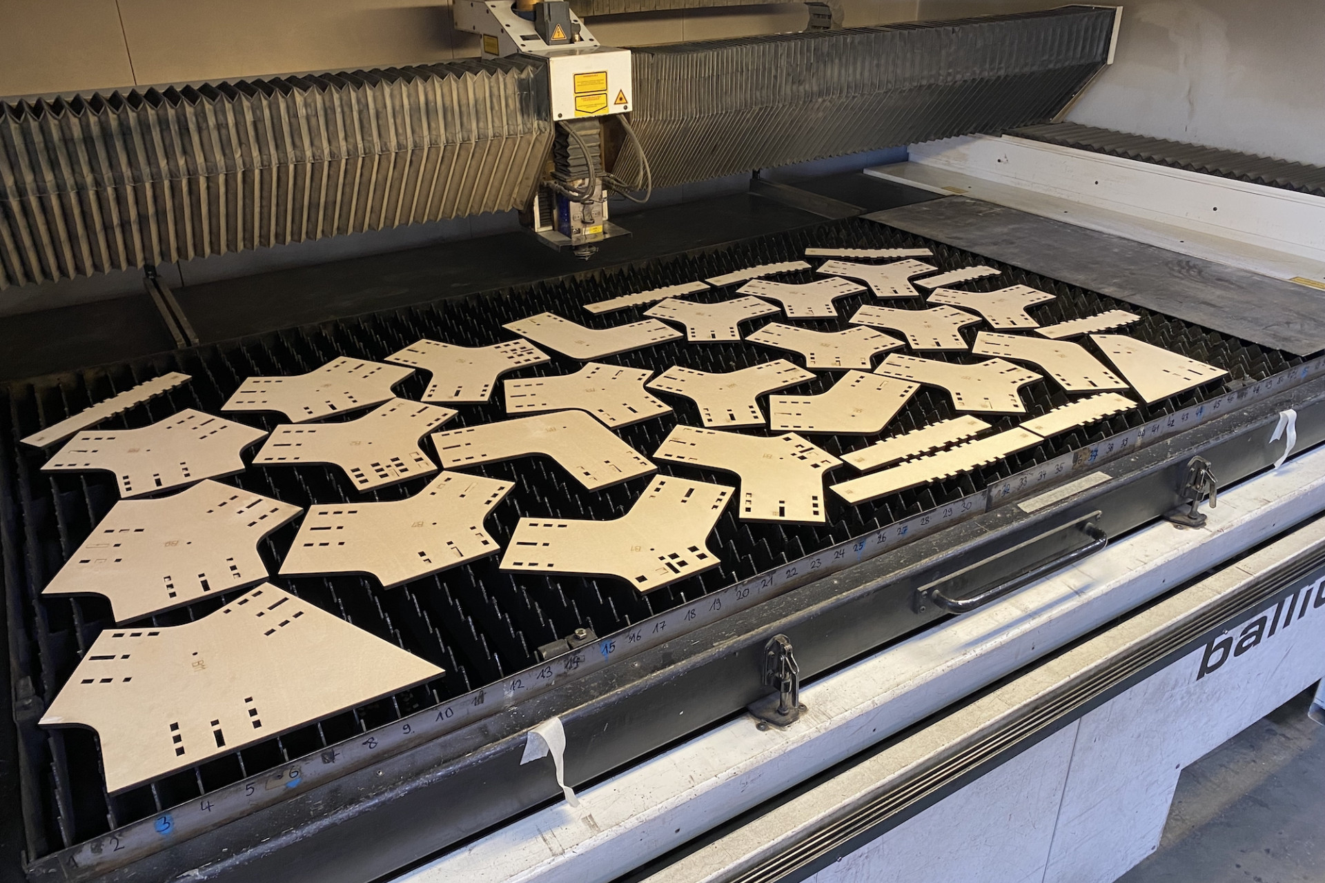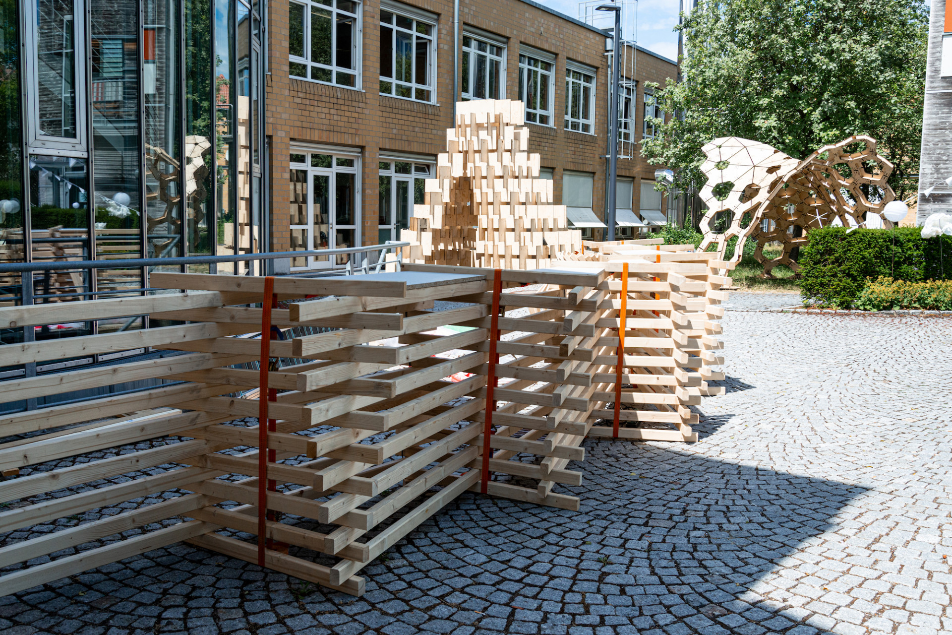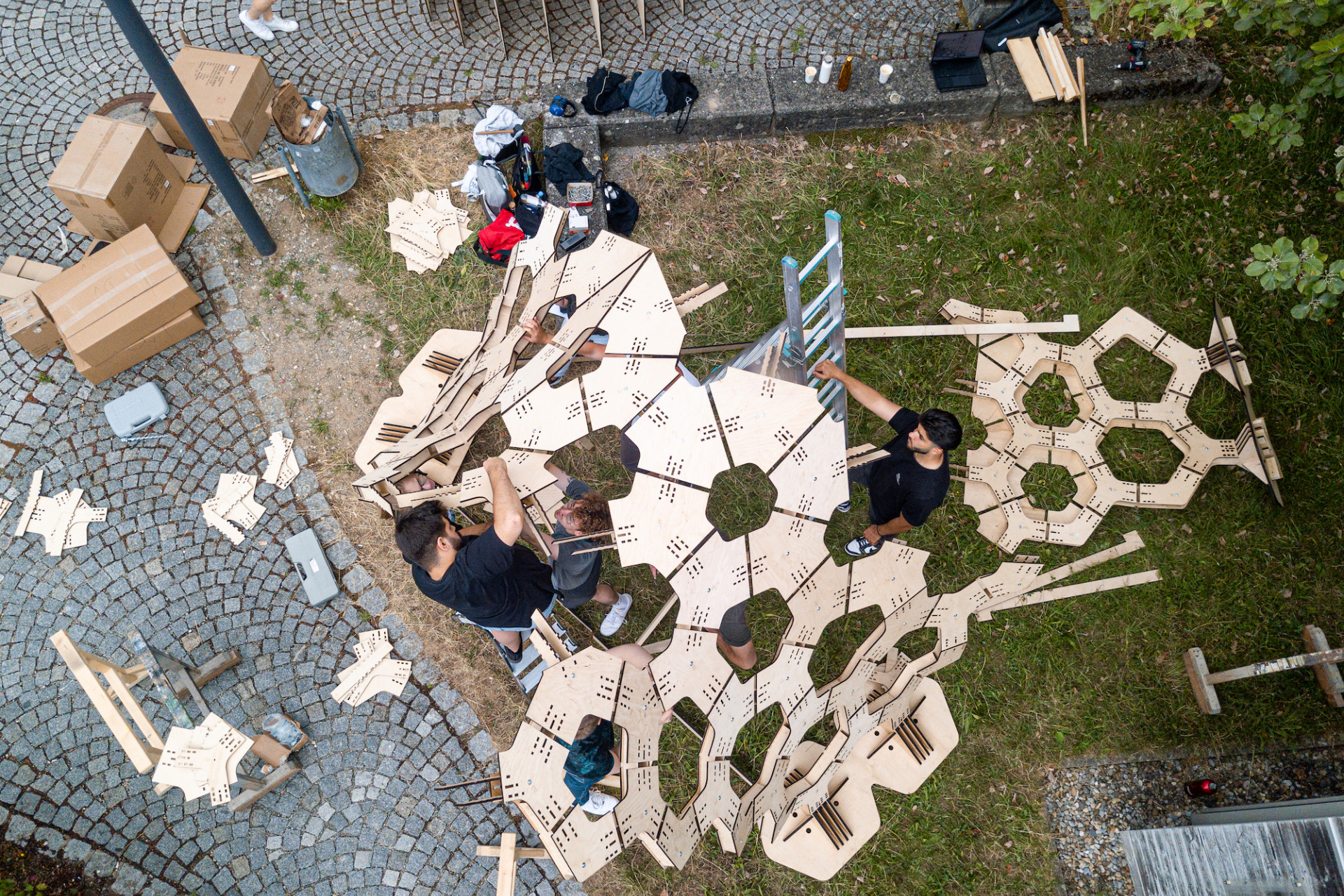 Das Besondere an diesem hexagonalen System ist, dass alle Bauteile torsionsfrei sind und lotrechte Schnittkanten aufweisen. Dies ermöglichte eine effiziente und kostengünstige Fertigung mittels Laser- oder Wasserstrahlschneidetechnik. Der Prototyp wurde aus Pappelholz gefräst. Dafür hat die Firma Georg Ackermann GmbH eine Woche lang ihre Lasermaschine zur Verfügung gestellt. Anschließend hat das Team jedes Teil geschliffen und in Lauge getunkt, damit bei Regen nichts abfärbt. „Uns war wichtig, dass sich die Montage der Teile unkompliziert gestaltet und von unseren Studierenden ohne den Einsatz schwerer Geräte durchgeführt werden konnte“, erklärt Simon Vorhammer.