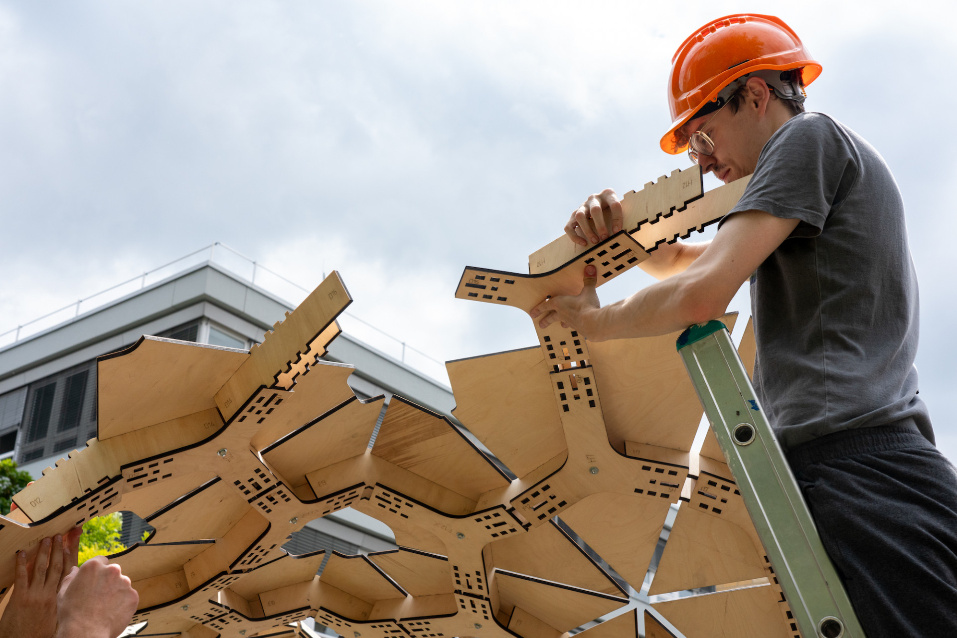 Gemeinsam mit seinen Studierenden hat er zwei Tage lang am Campus gewerkelt und den Pavillon errichtet. Auch Student Tobias Bischoff ist von der Einfachheit des Aufbaus begeistert: „Mich hat fasziniert, dass der Pavillon komplett vorgefertigt werden kann und auf dem Bauplatz ohne großartiges Wissen über das Projekt leicht und verständlich zusammensetzbar ist.“