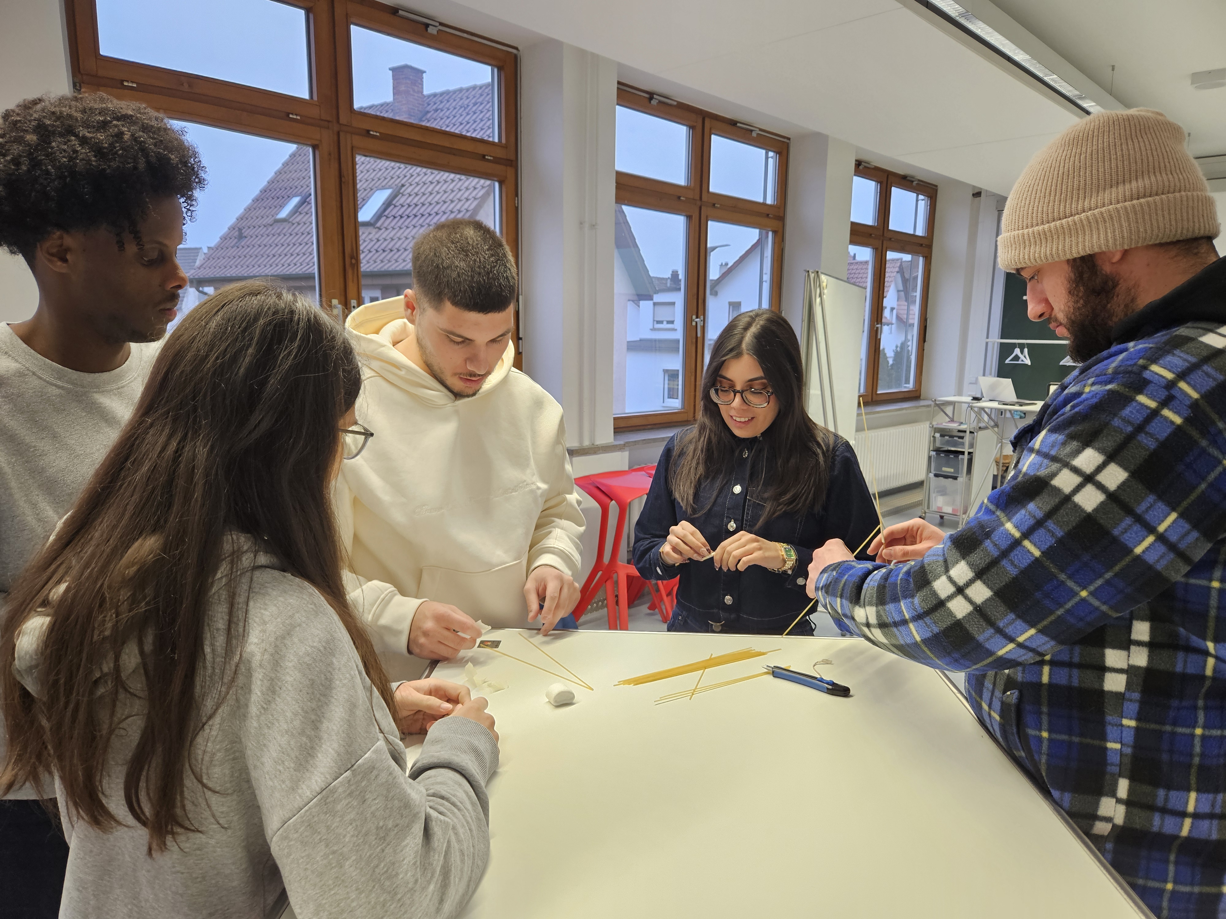Los ging es mit einer ungewöhnlichen Aufwärmübung, der Marshmallow-Challenge. Dafür traten die Studierenden in Teams gegeneinander an. Die Aufgabe: Innerhalb von 15 Minuten den höchsten freistehenden Turm aus Spaghetti, Klebeband, Bindfaden und einem Marshmallow zu bauen, wobei das Marshmallow an der Spitze platziert werden muss.