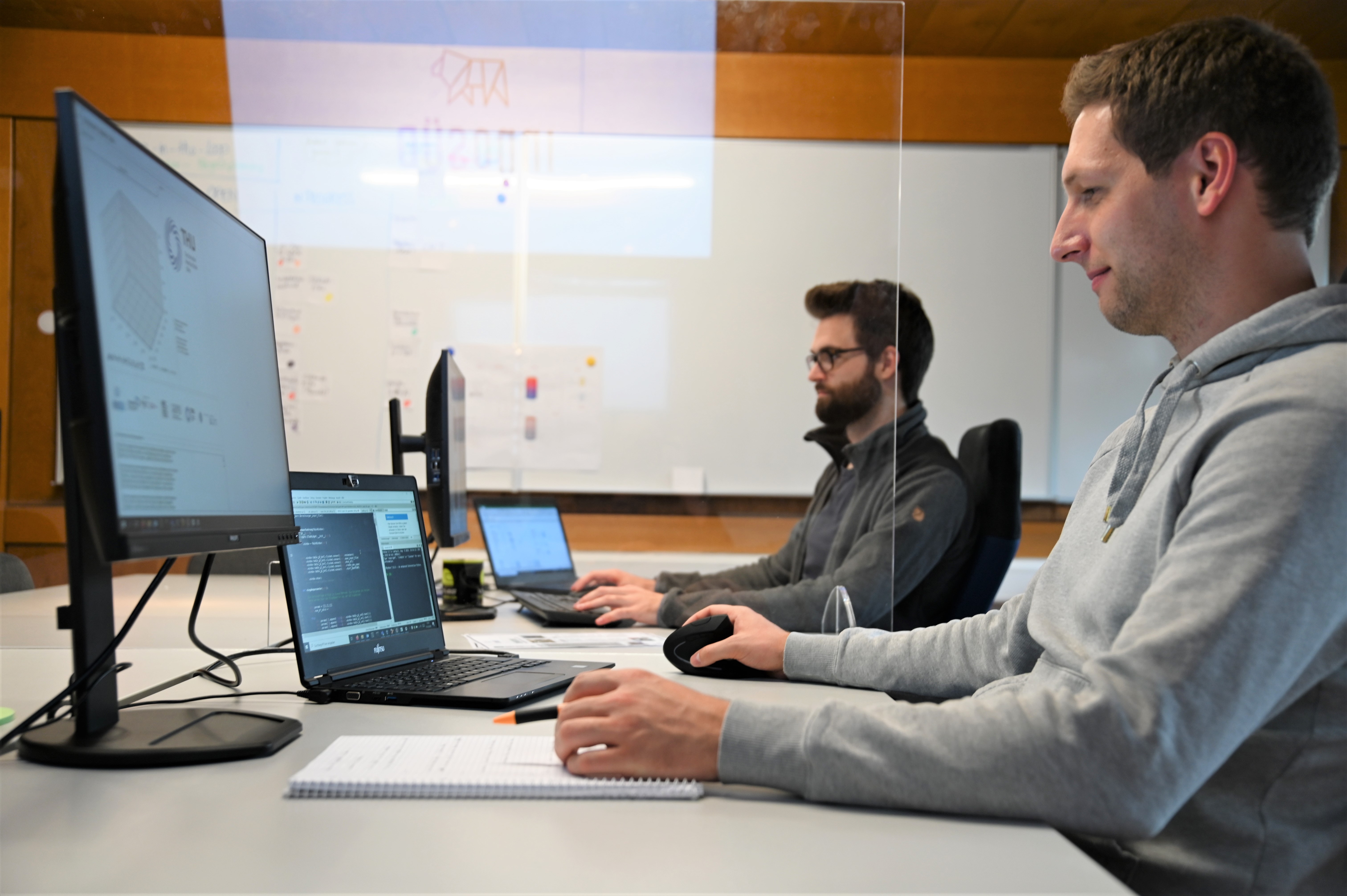 Im Rahmen des Transferformats „Transfer über Köpfe“ arbeitete Fabian Neth, wissenschaftlicher Mitarbeiter an der Hochschule Biberach, im Oktober für einige Zeit an der Technischen Hochschule mit dem dortigen Projektmitarbeiter Kevin Akermann zusammen. „Obwohl wir an unterschiedlichen Aufgaben und fachlichen Fragestellungen arbeiten, gibt es viele Überschneidungen. In den verschiedenen Anwendungsgebieten, die wir bearbeiteten, werden mitunter ähnliche Bauteile verwendet, die aber für unterschiedliche Zwecke genutzt werden“, fasst Fabian Neth zusammen. Er zieht ein positives Fazit: „Natürlich stehen wir auch sonst in Kontakt, vor allem virtuell. Aber wenn man beim Arbeiten nebeneinandersitzt, holt man sich leichter Hilfe bei kleinen Problemen oder prüft einfacher nach dem Vier-Augen-Prinzip.“