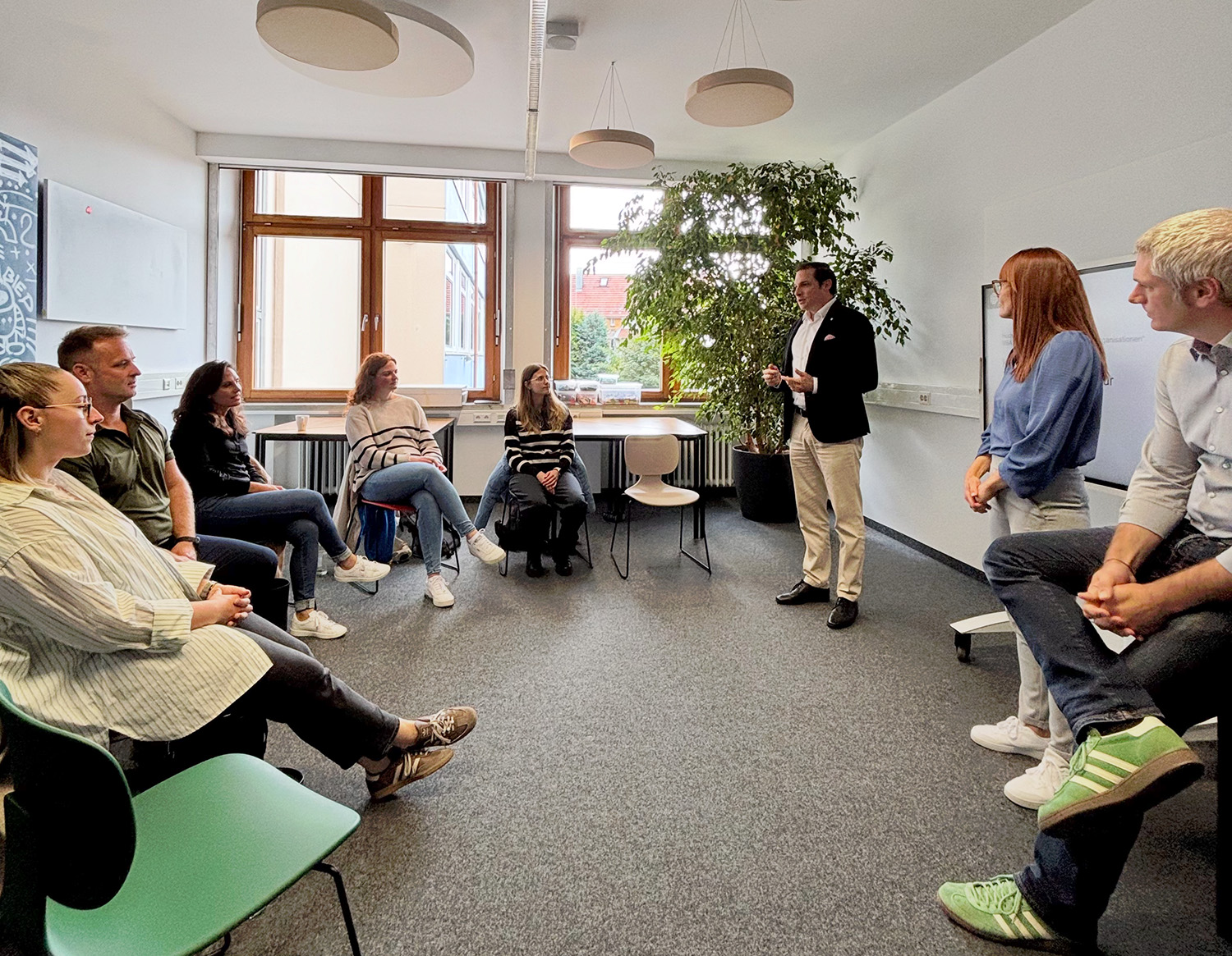 Schon bei der Kick-off-Veranstaltung zum Studienstart stand neben dem gegenseitigen Kennenlernen die Fallstudie auf dem Programm, die von Caroline Braun (wissenschaftliche Mitarbeiterin am Institut für Bildungstransfer der Hochschule) und Prof. Dr. Jens Winter geleitet und in Kooperation mit der Unternehmensberatung Stegmann and Company aus Stuttgart durchgeführt wird. Dabei finden die Studierenden Lösungsansätze für ein strukturelles Problem, das auf einer realen Unternehmenssituation basiert. „Die Teilnehmenden schlüpfen dafür in verschiedene Rollen und werden so mit unterschiedlichsten Anforderungen konfrontiert. Ihre Aufgabe ist es, die Zusammenführung zweier internationaler Teams zu begleiten und die Innovationskraft des Unternehmens zu stärken,“ so Jens Winter.