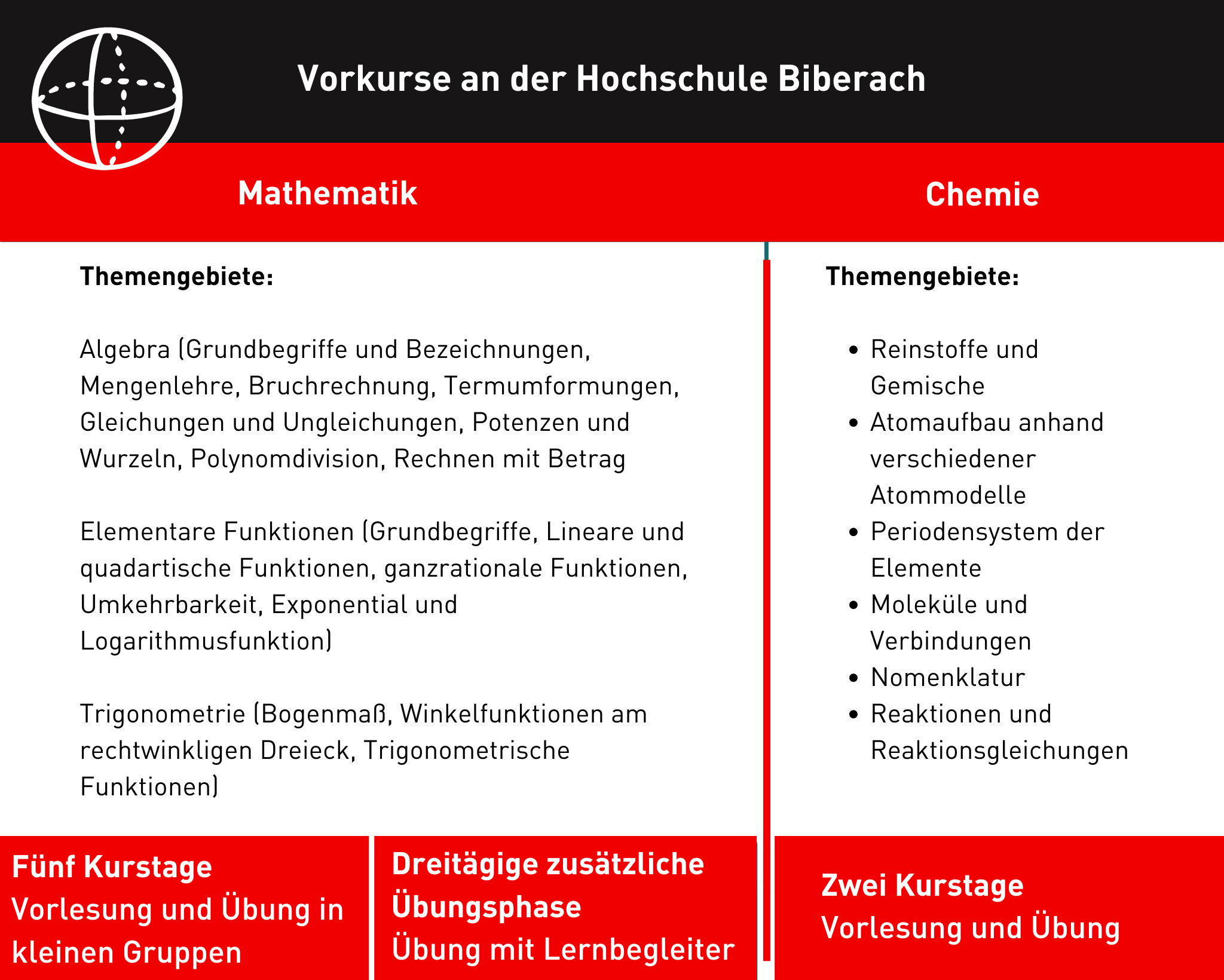 Unsere Vorkurse dienen dem Auffrischen von Schulwissen. Du möchtest vor deinem Studienstart nochmals alle wichtigen Inhalte aus der Schule wiederholen? Ein bisschen Vorlesungsluft schnuppern und vorab einige Kommilitonen kennen lernen? Dann melde dich zu unseren Vorkursen an!