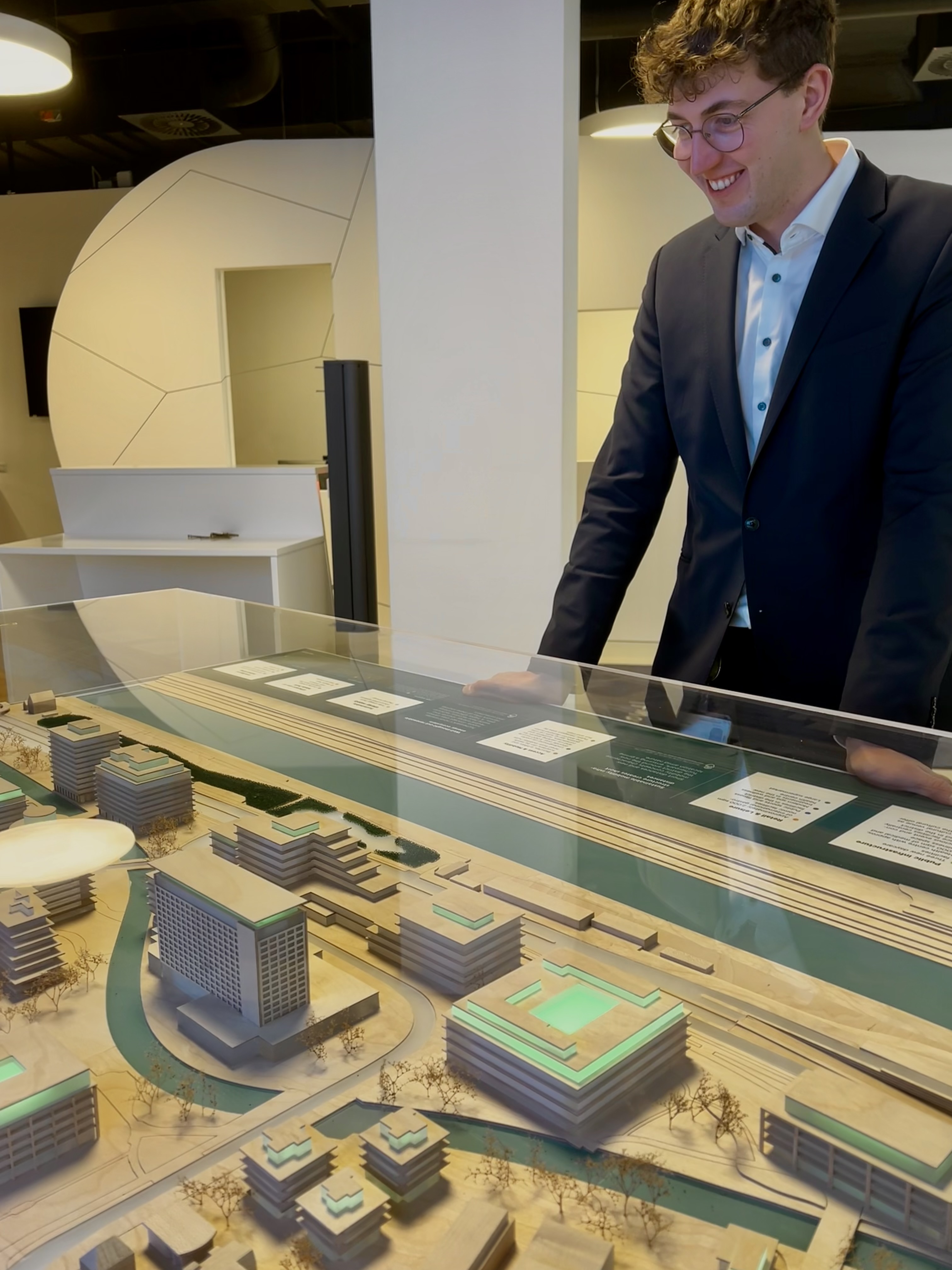 Unser Bild zeigt Noah Stoll vor einem Modell des Tucherparks in München, einem der, wie der Biberacher Absolvent findet, „spannendsten und nachhaltigsten Quartiersentwicklungen in Deutschland derzeit."